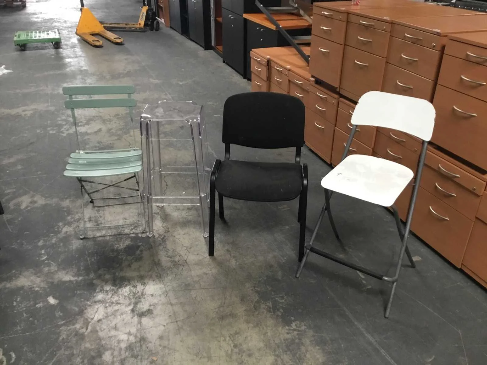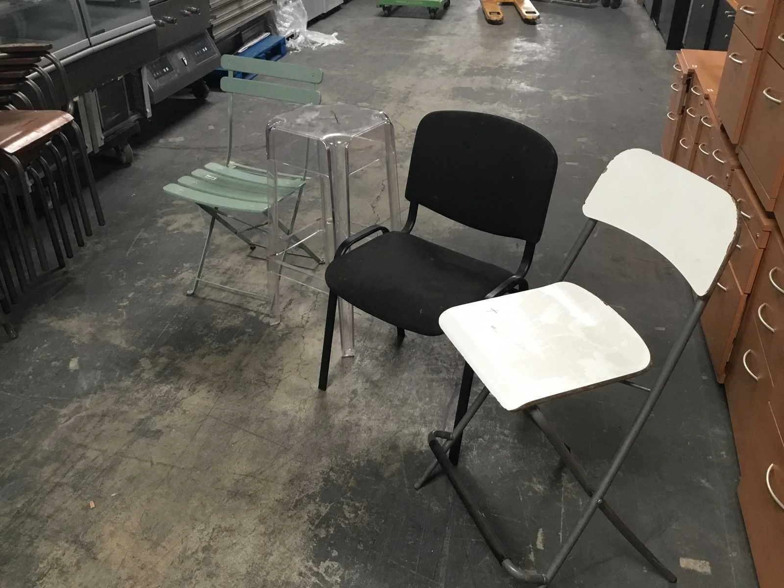 1x witte barkruk klapbaar 1x plastic kruk 1x groene tuinstoel 6x zwart stoel Merk: Diverse stoelen