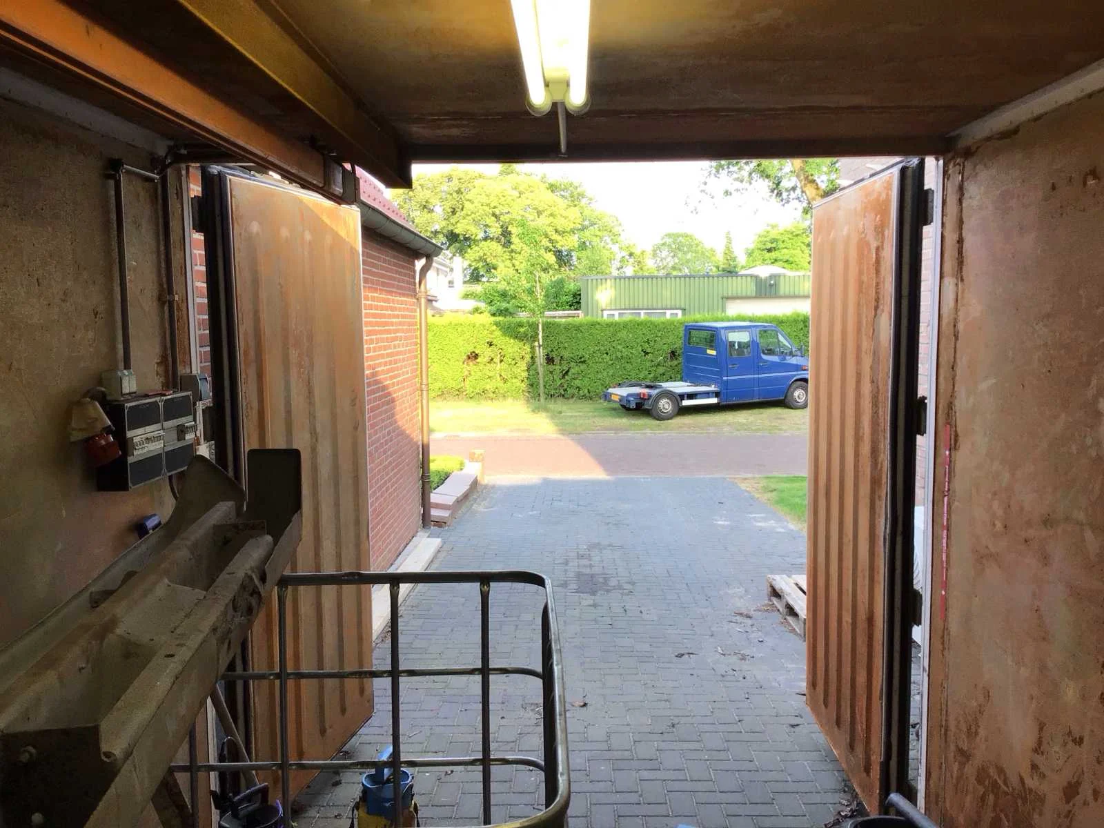Koper dient zorg te dragen voor professioneel transport met kraanwagen, staat tussen twee gebouwen in. Exclusief inhoud inclusief bovenloopkraan.