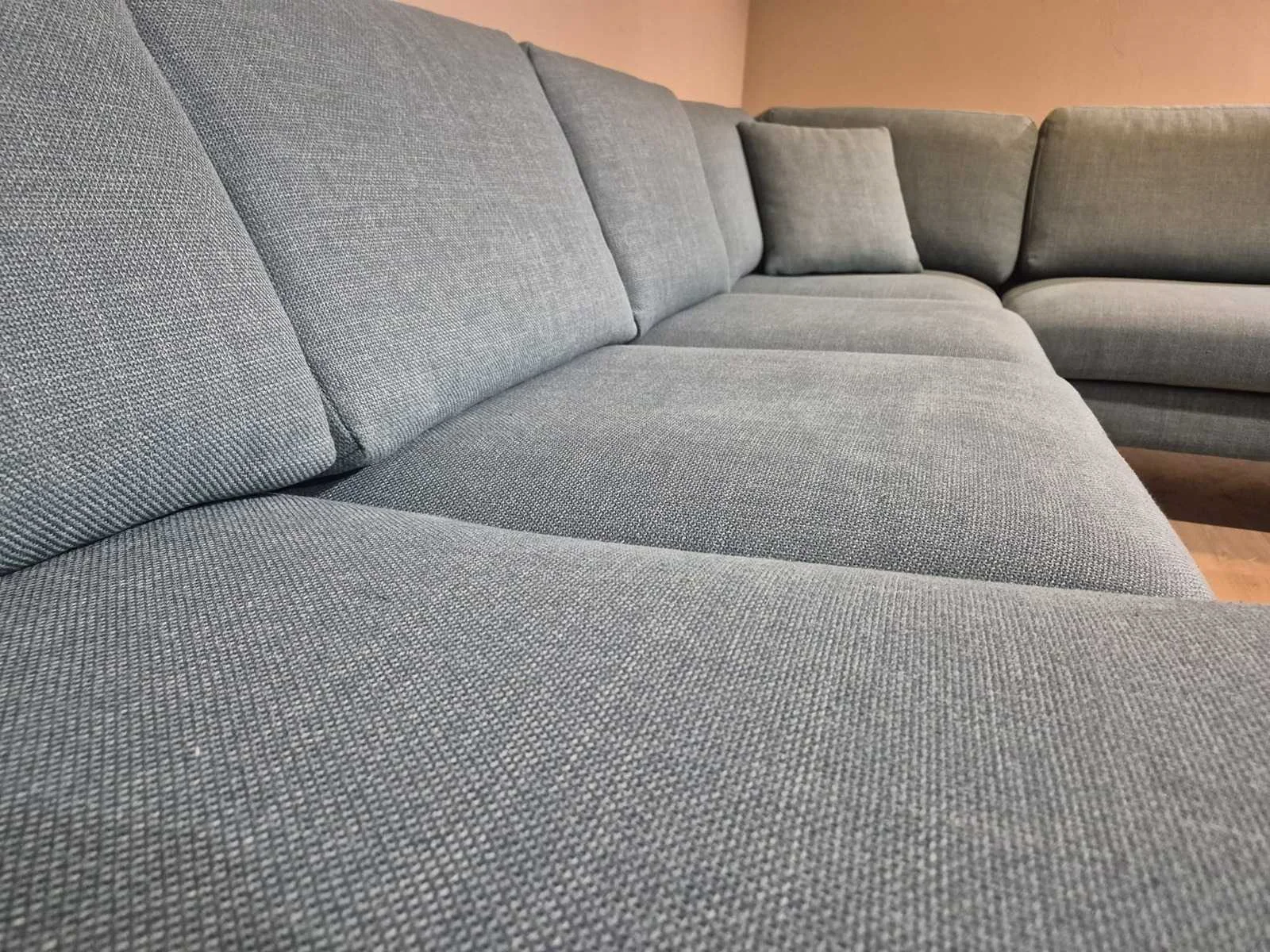 Showroommodel Nieuwprijs: €2699,- Merk: Montel Model: Dali Product type: Hoekbank Kleur: Petrol Lengte: 345cm Breedte: 225cm Hoogte: 88cm Zithoogte: 46cm Materiaal: Textiel