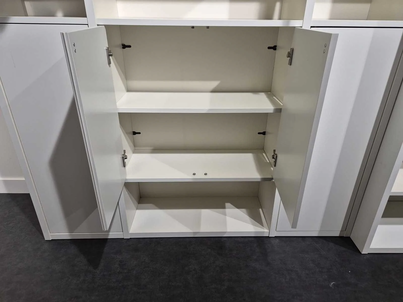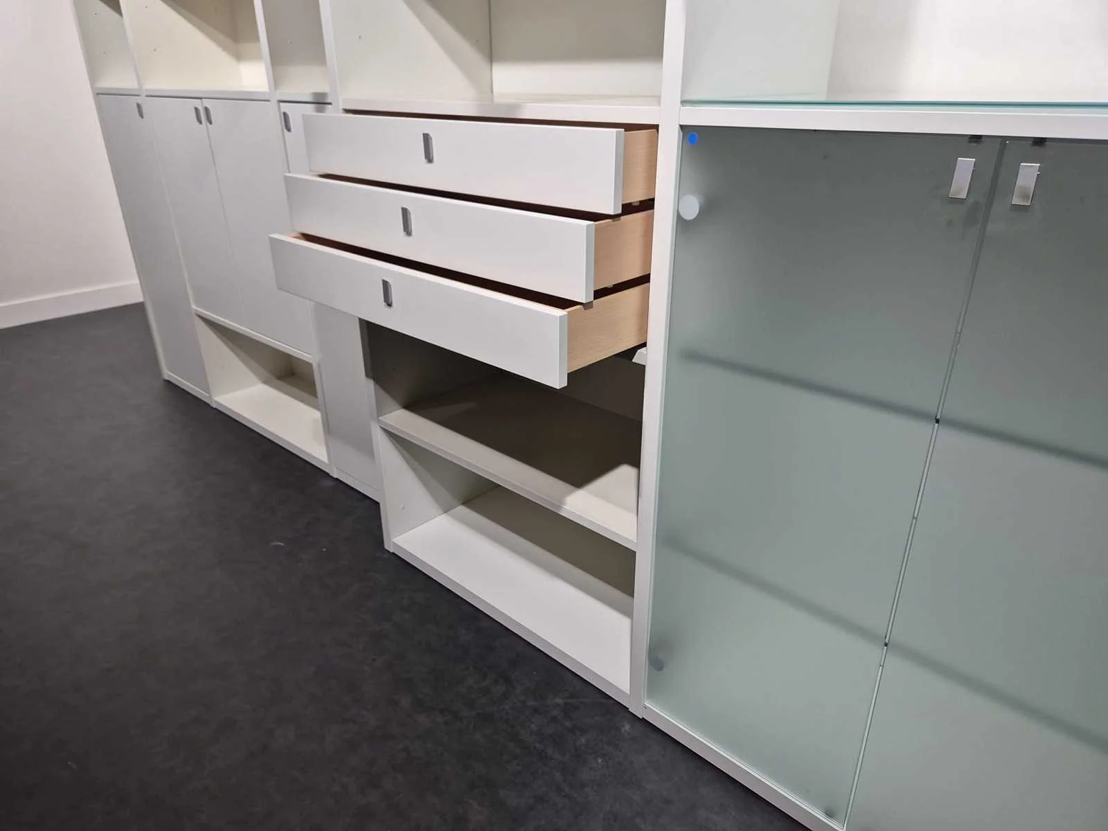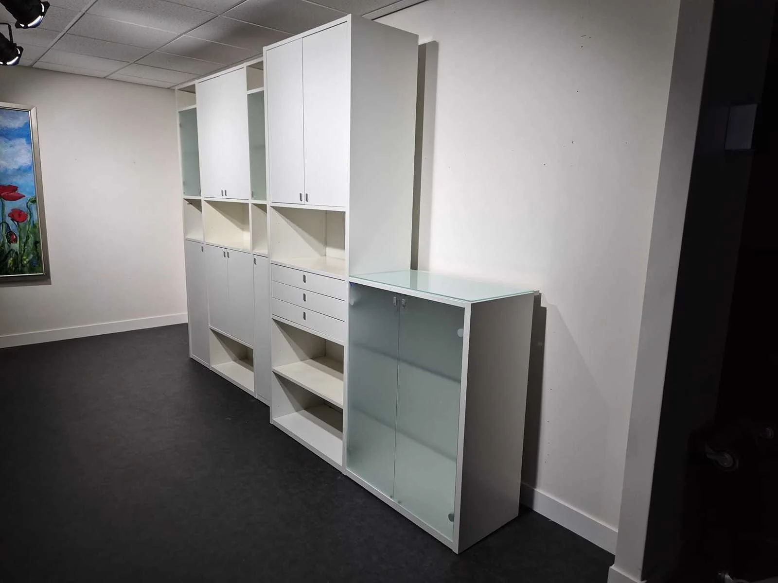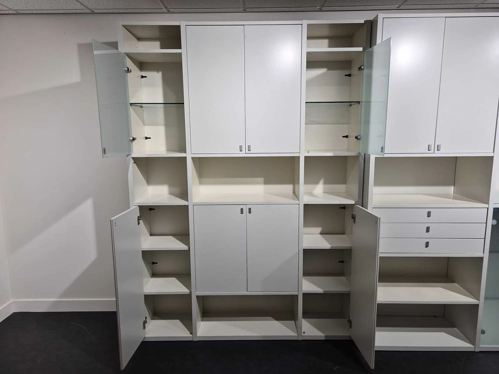 Uitstekende staat. Geen schades Nieuwprijs: €20.000,- Betreft 2 kasten. Los en vast aan elkaar te zetten. Merk: Interlubke Model: Studimo Product type: Wandmeubel Kleur: Wit Gewicht: 20kg Lengte: 343cm Breedte: 35cm Hoogte: 238cm Materiaal: Hout - Glas