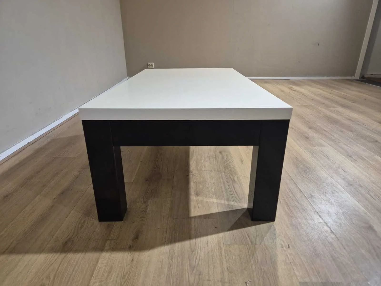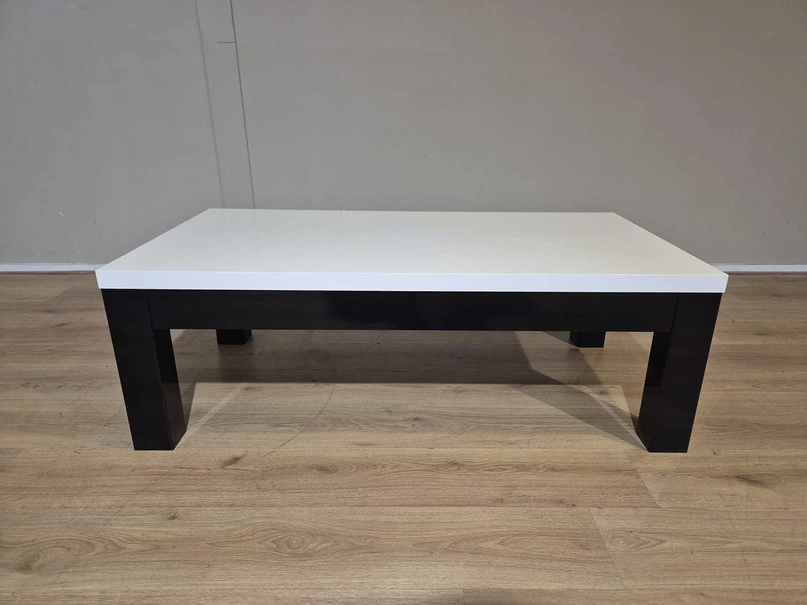 Gebruikt en licht verkleurd Merk: Design Product type: Salontafel Vorm: Rechthoek Kleur: Wit - Zwart Gewicht: 20kg Lengte: 127cm Breedte: 66cm Hoogte: 43cm Materiaal: Hout