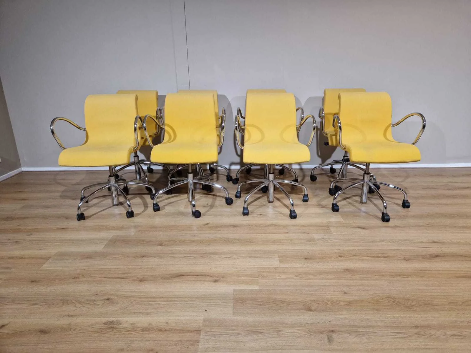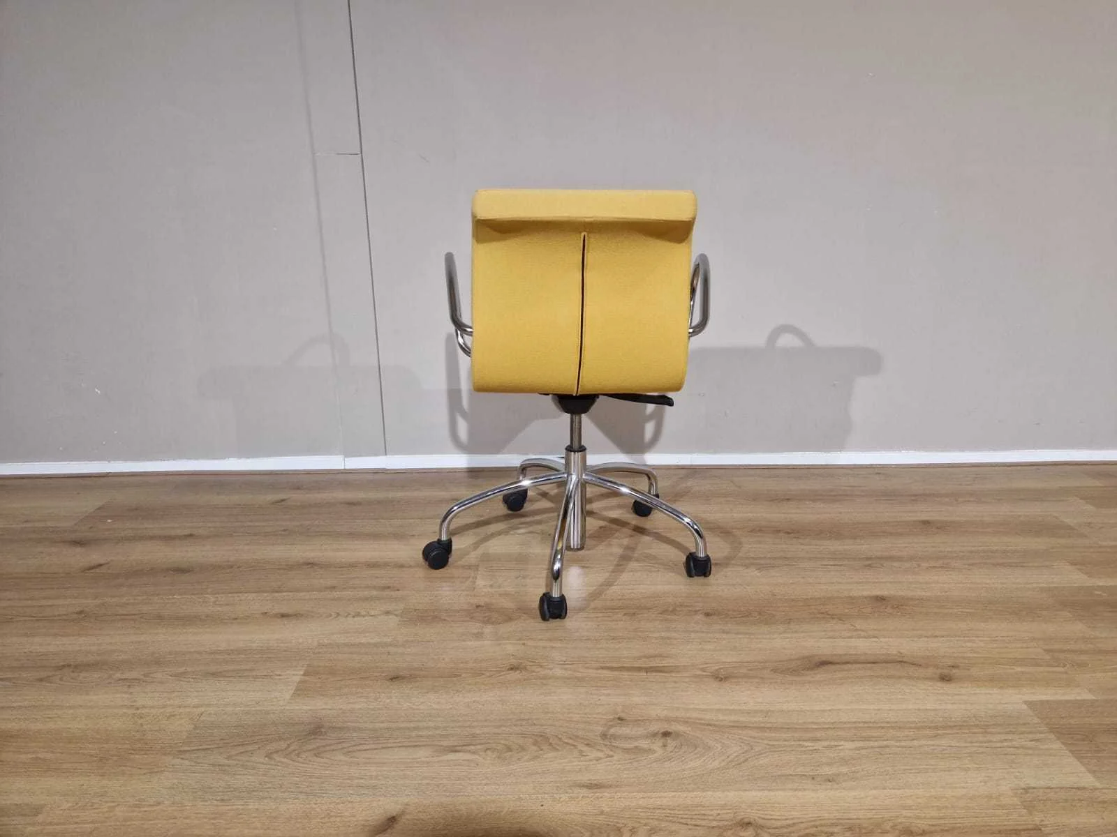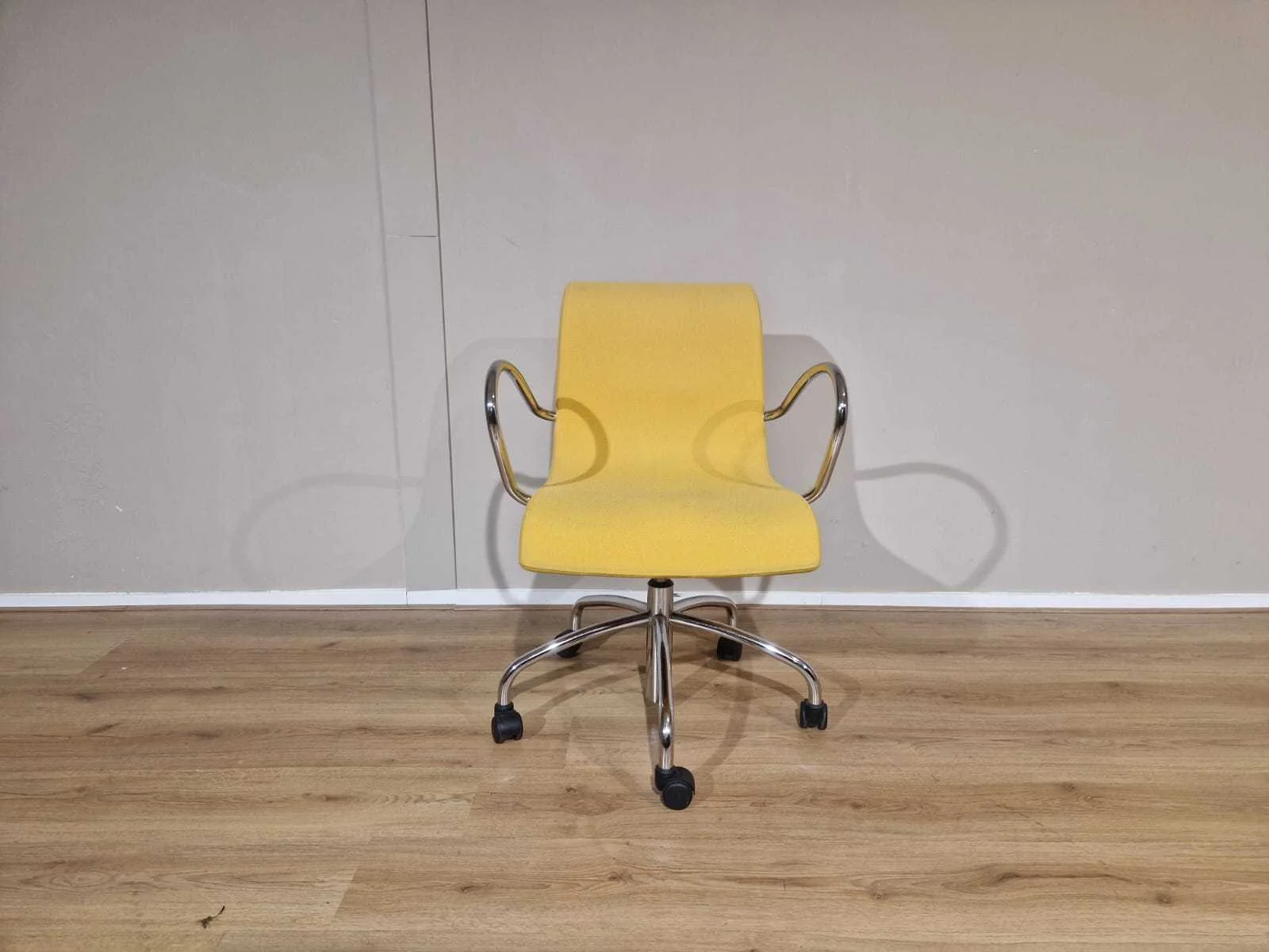 Lichte verkleuring zichtbaar Nieuwprijs 4 stuks: €2316,- Merk: Lensvelt Type: Flag Kleur: Bureaustoelen Gewicht: 10kg Lengte: 60cm Breedte: 60cm Hoogte: 78cm Zithoogte: 40-52cm Diepte: 39cm Materiaal: Stof