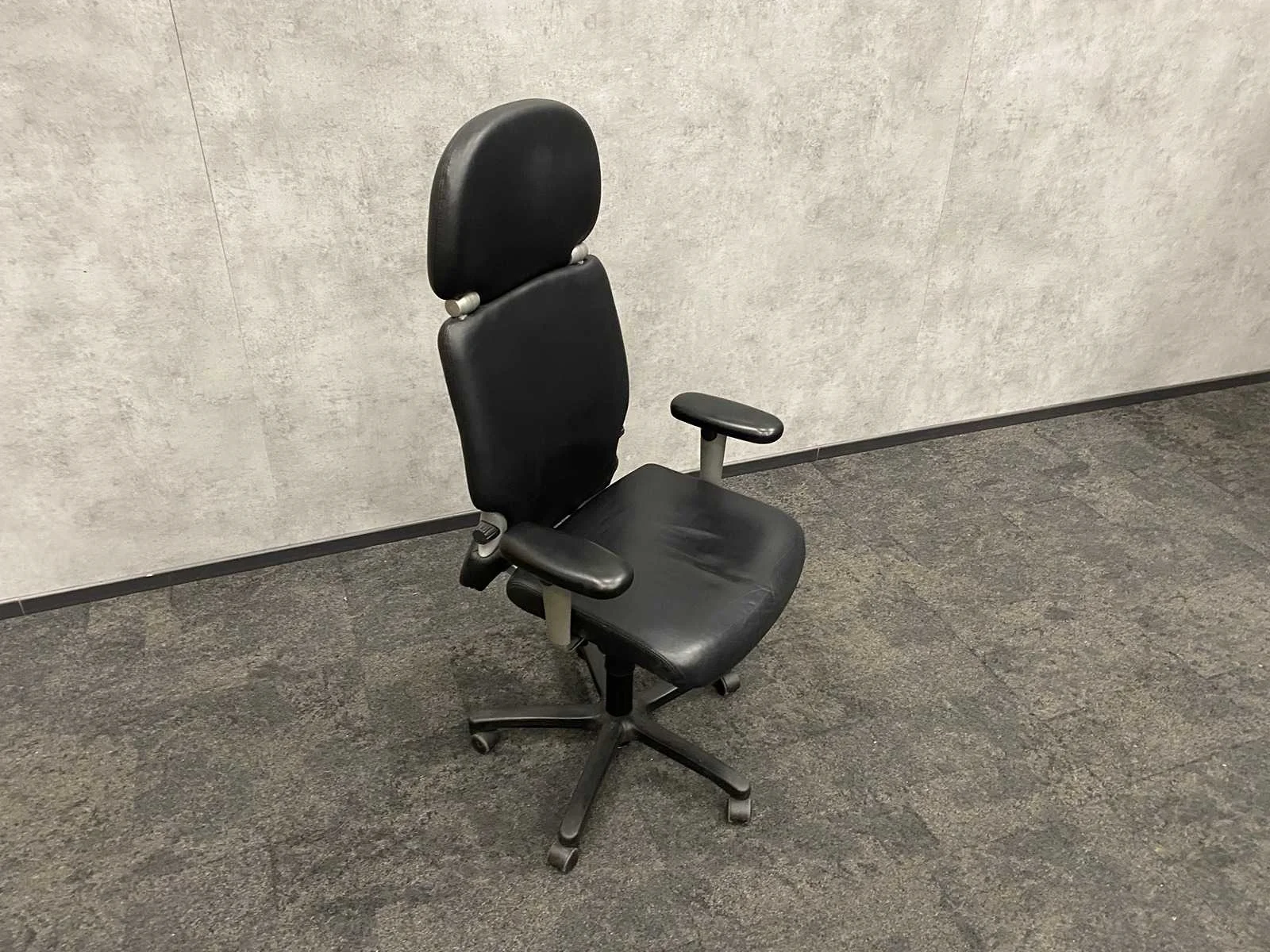 Met hoofdsteun, 4D verstelbare armlegges, zithoogte en zitdiepte instelbaar, rughoogte verstelbaar, lendensteun, kantelmechanisme, gewichtsregeling, lederen bekleding Merk: Haworth Comforto 77