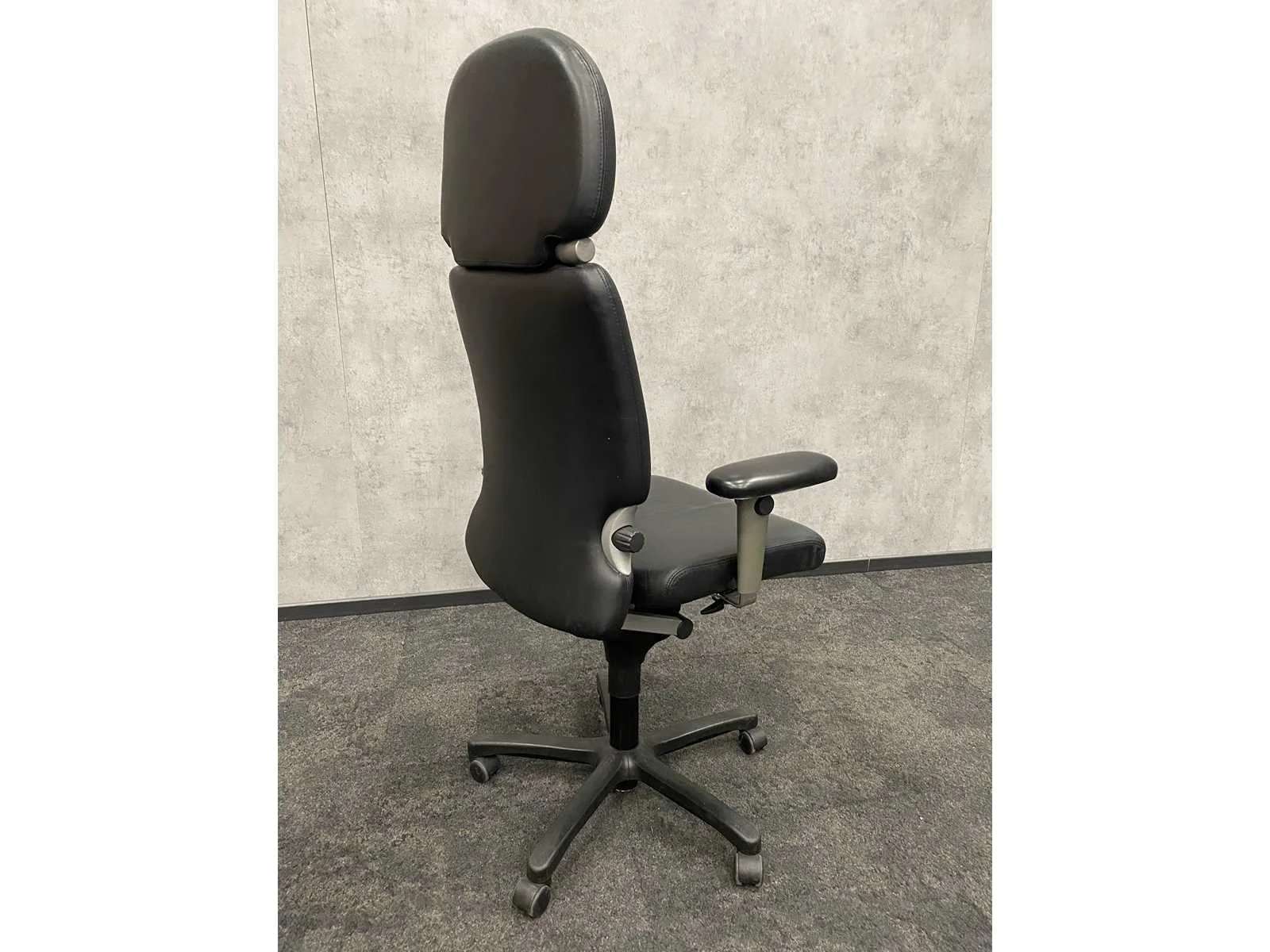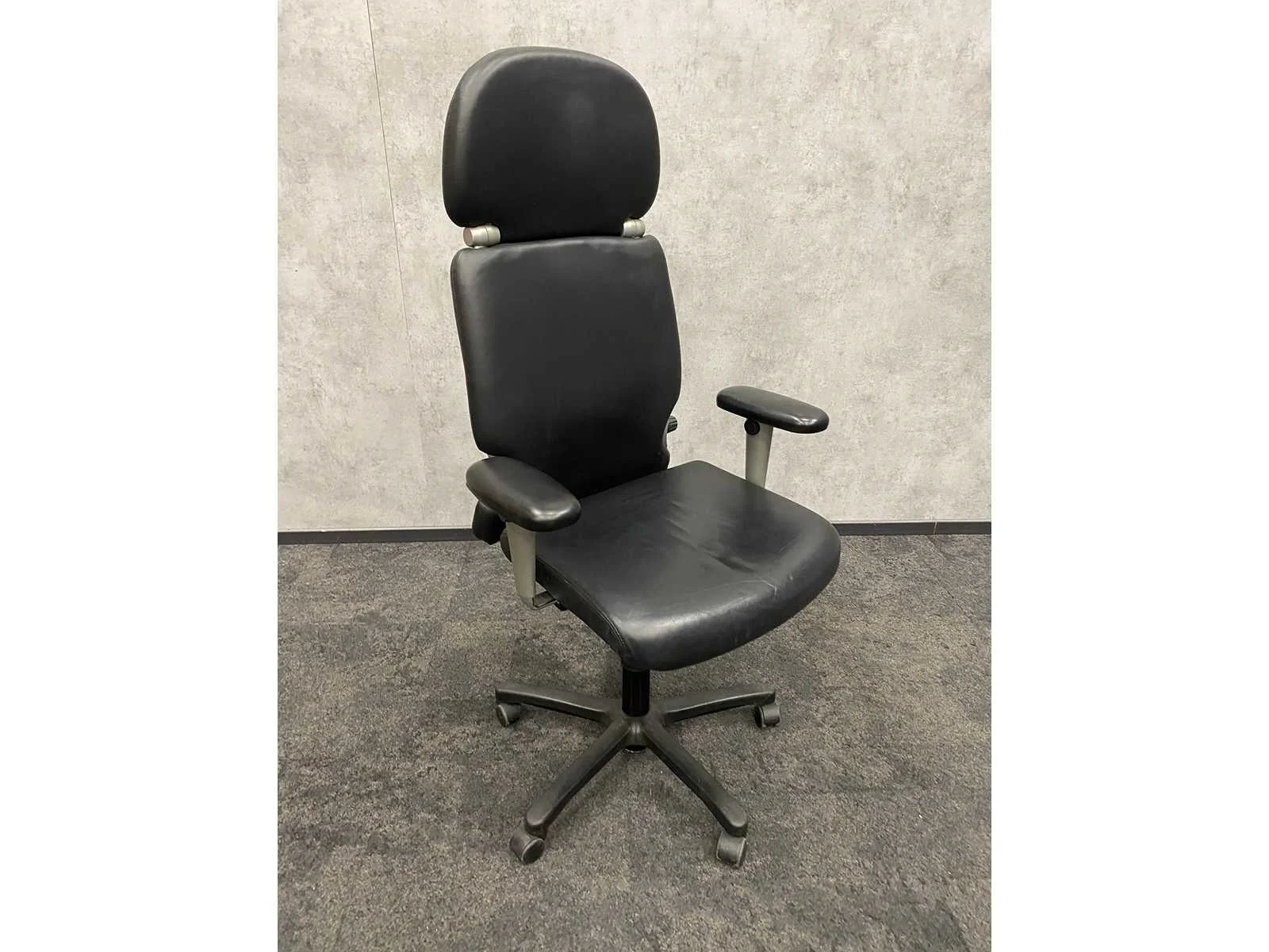 Met hoofdsteun, 4D verstelbare armlegges, zithoogte en zitdiepte instelbaar, rughoogte verstelbaar, lendensteun, kantelmechanisme, gewichtsregeling, lederen bekleding Merk: Haworth Comforto 77