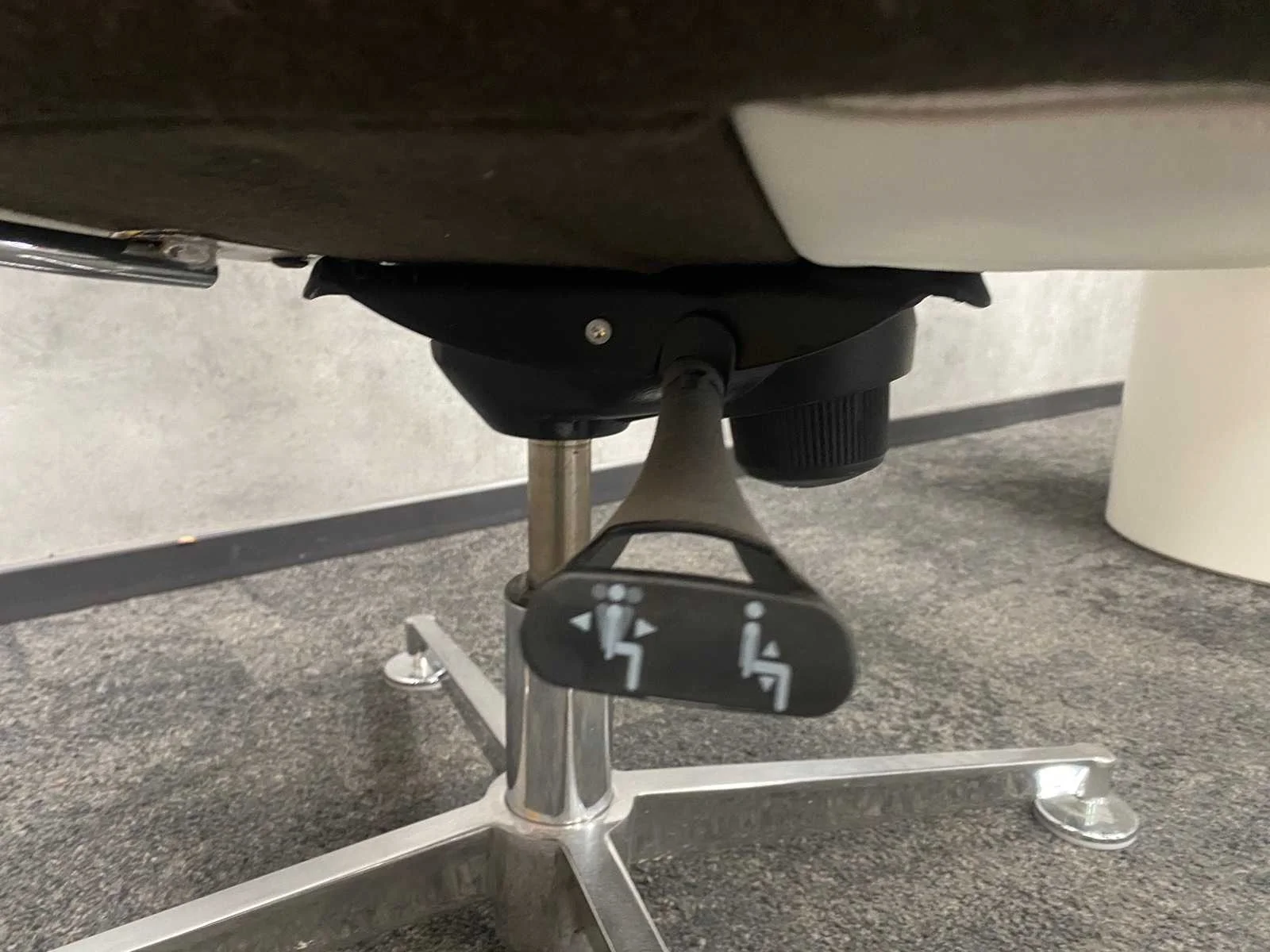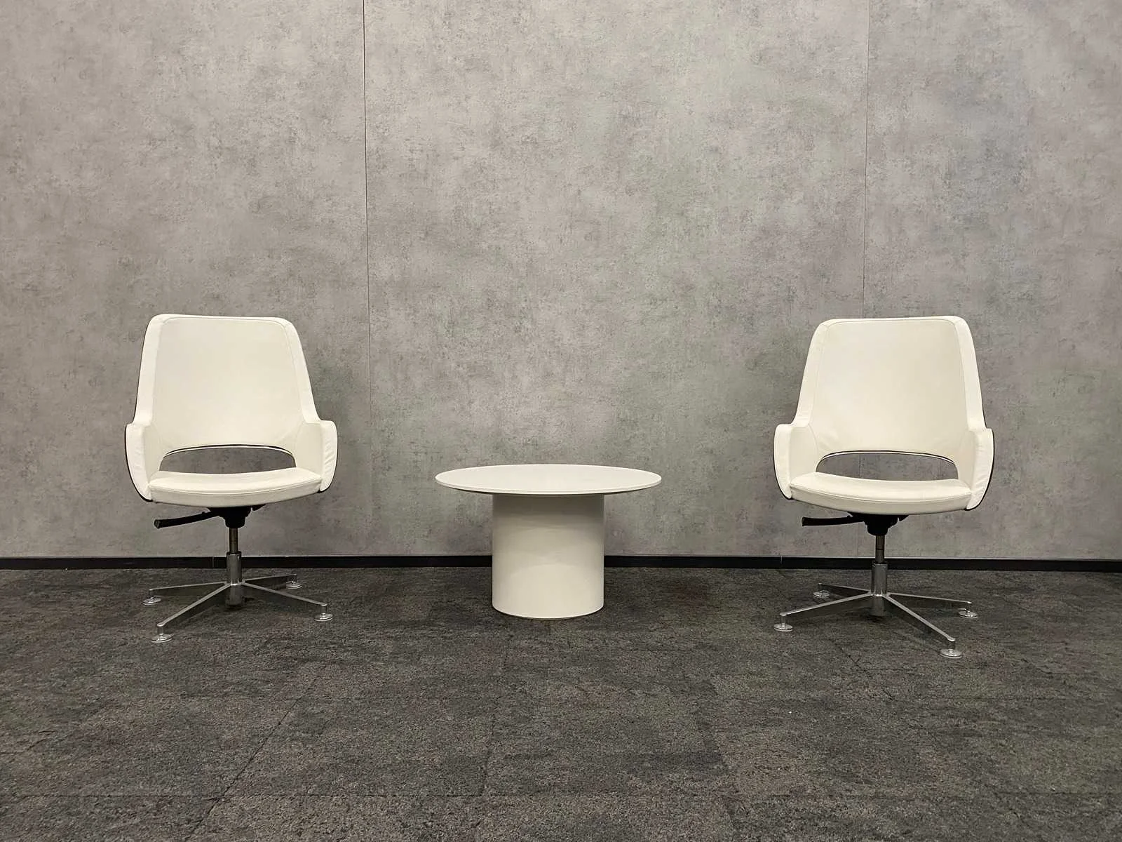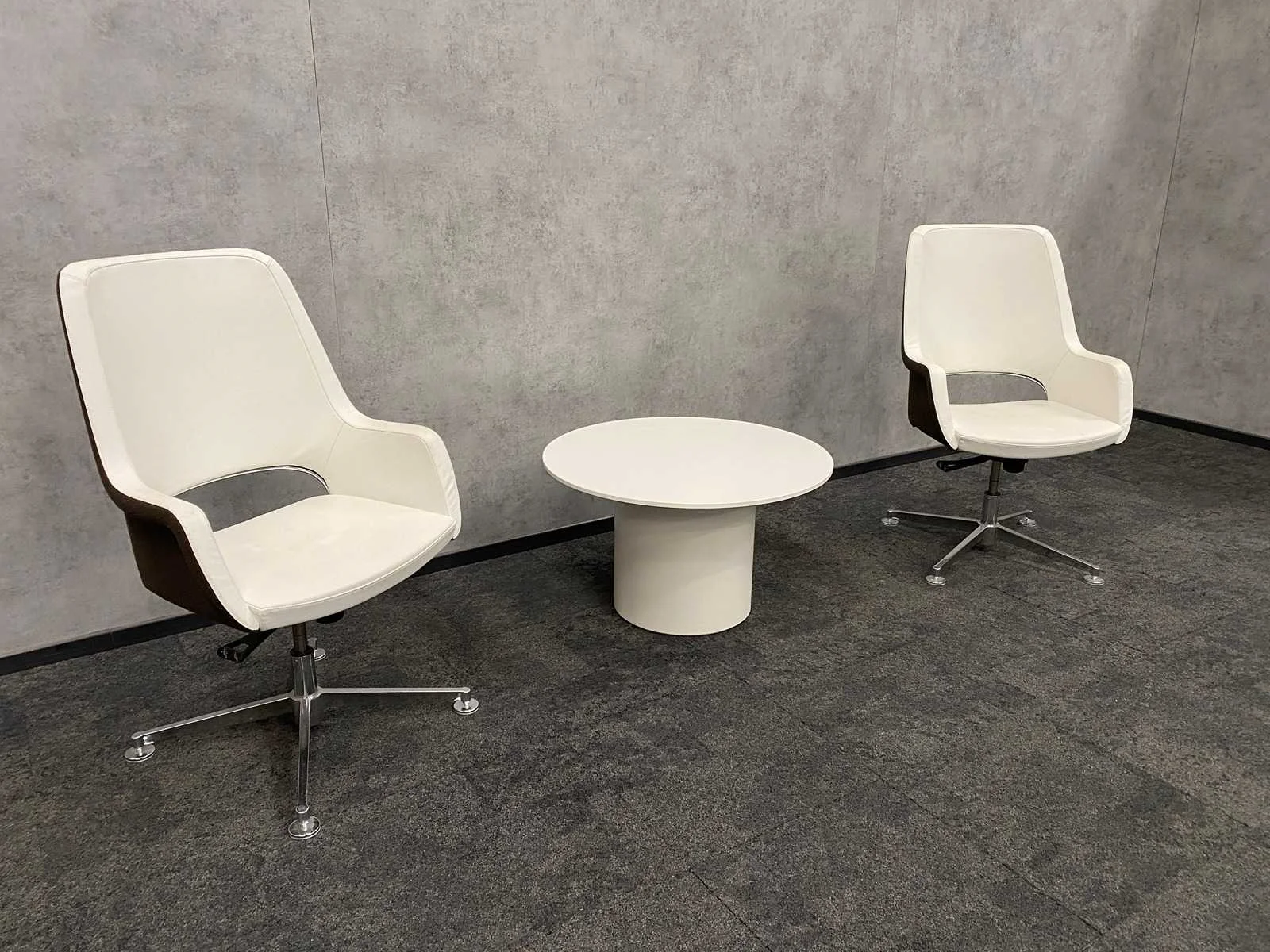 Afm. tafel ca. hoogte 46 cm. en diameter 80 cm. ---- fauteuils draaibaar, zithoogte instelbaar, kantelmechanisme rugleuning Merk: TwinForm