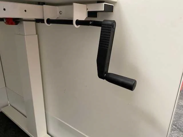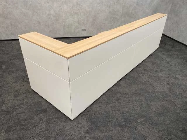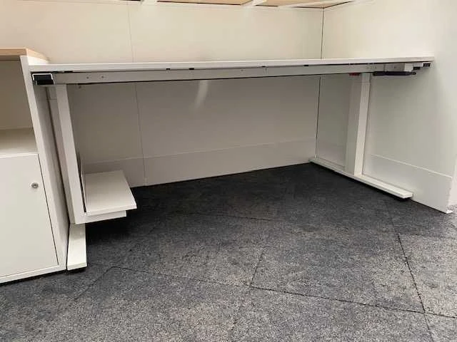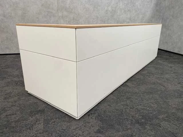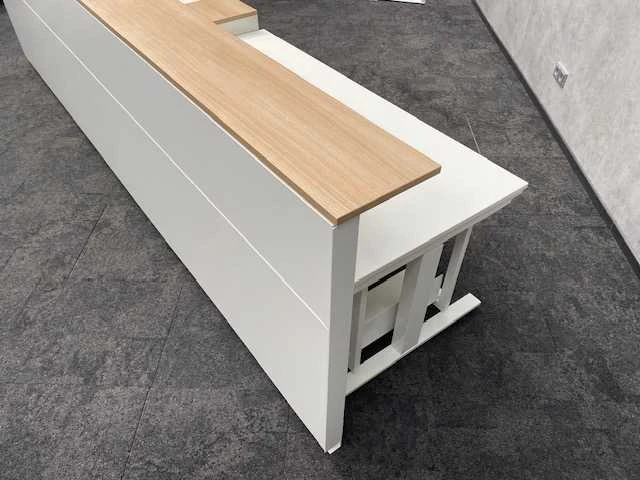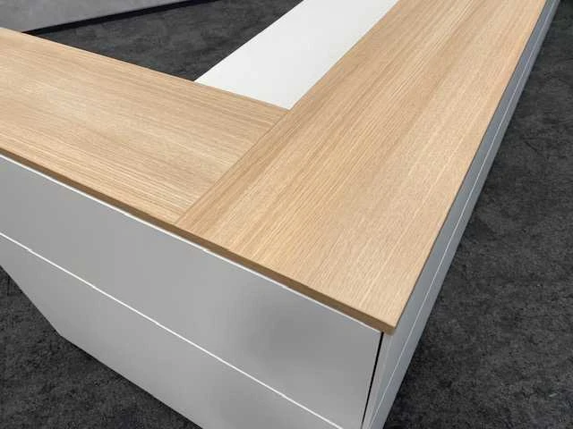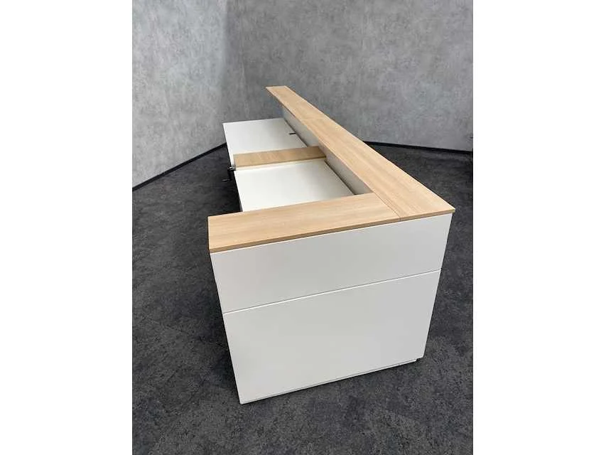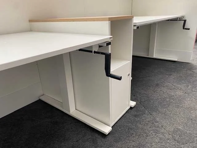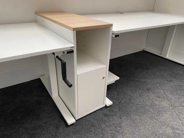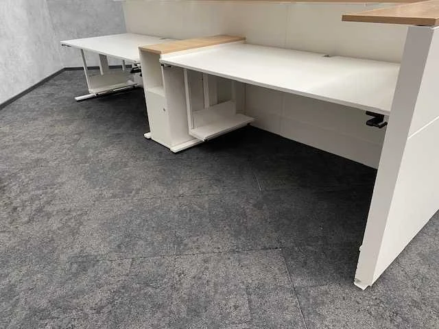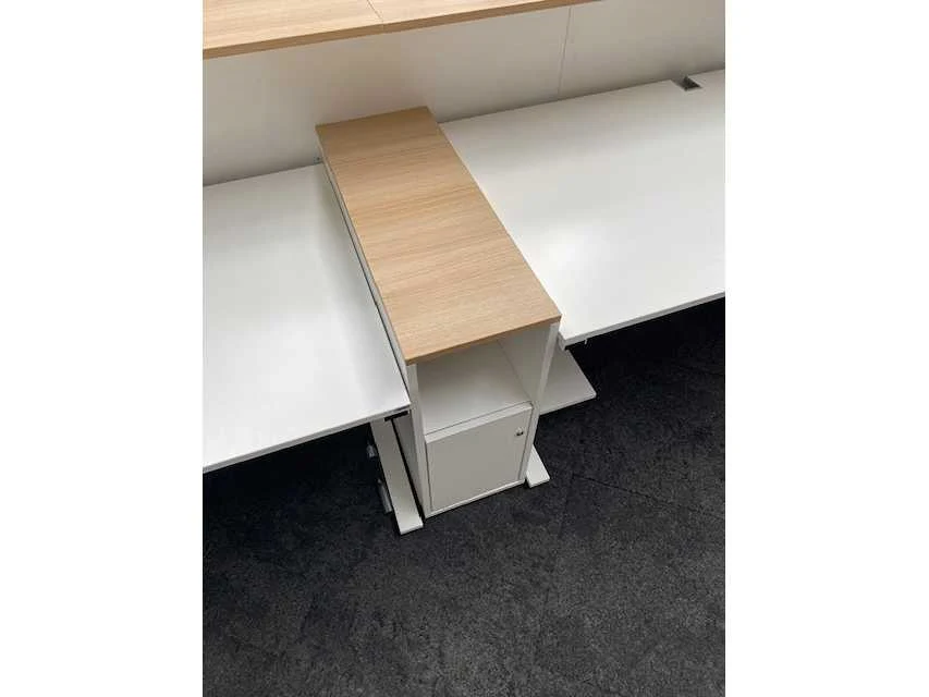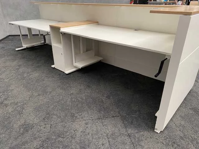 Kavel reeds professioneel gedemonteerd. 2 achterstaande bureaus zijn volledig gemonteerd. afmeting ca. h103xb368xd107.5cm. Individuele bladafmeting bureau 160x80 Merk: Wini Kleur: wit / eiken Materiaal: melamine / staal