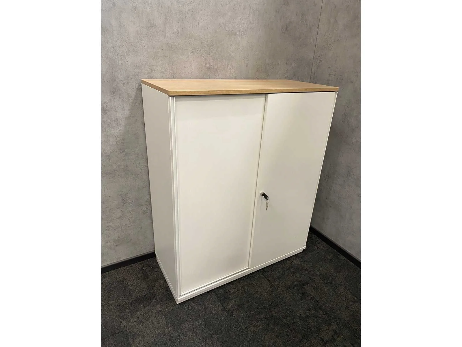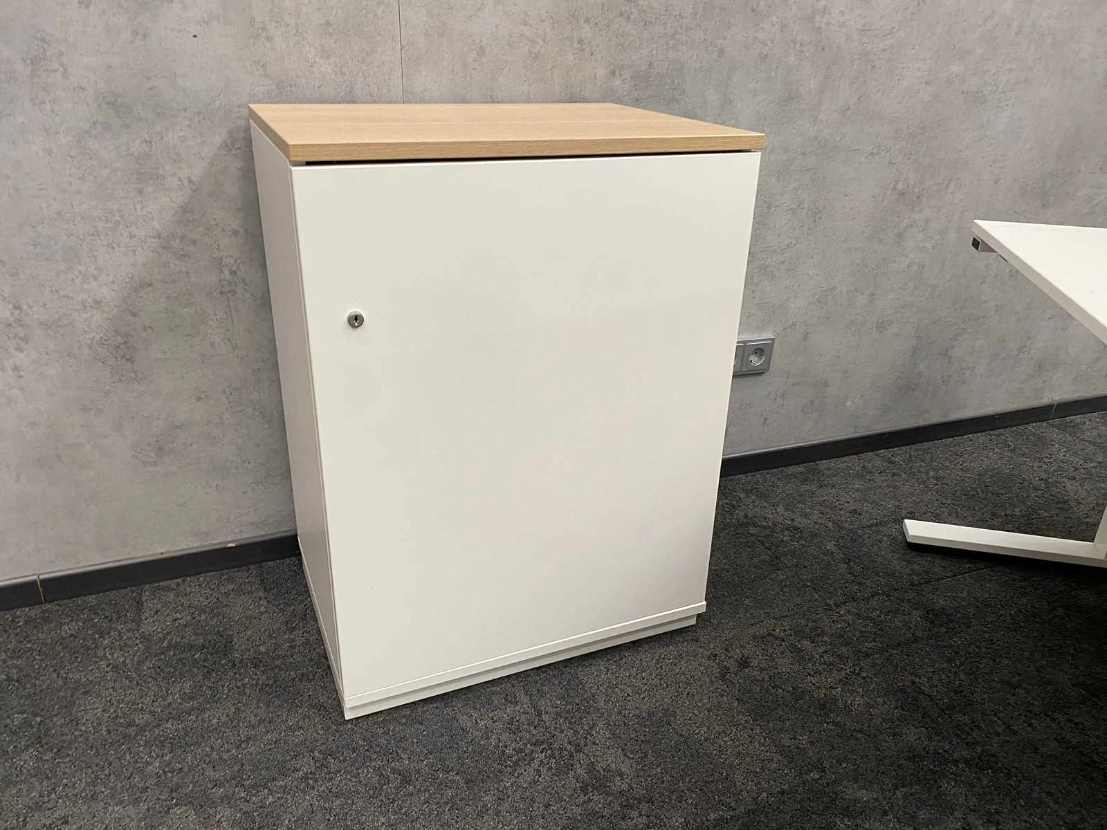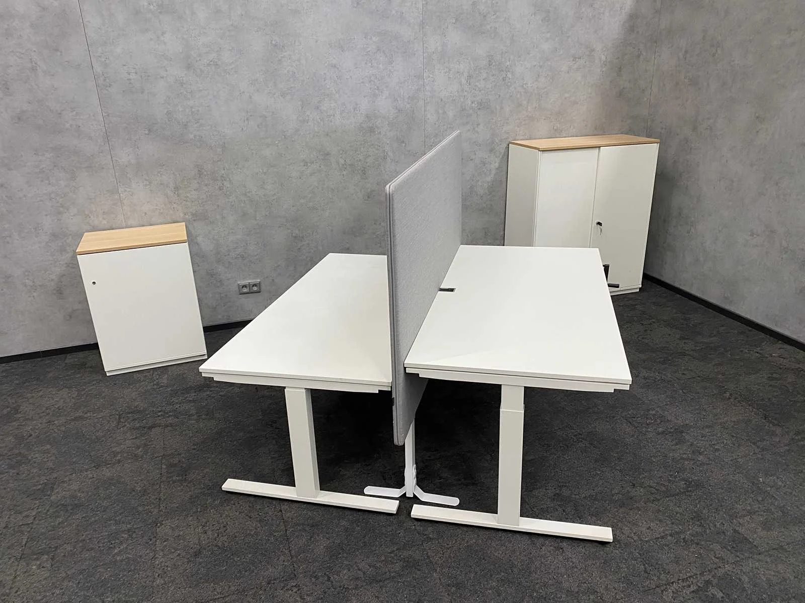 Kavel bestaande uit 2x Wini zit-zit slinger bureau met draadgoot. Afm. ca. 160x80 cm. ---- 1x Götessons grijs akoestische scheidingswand op voet. ---- 1x Wini melamine opbergkast. Afm. ca. hxbxd 81x60x45 cm. met 1`verstelbaar legbord, zonder sleutel, 1x Wini melamine opbergkast met sleutel en 4 verstelbare legborden. Afm. ca. hxbxd 120x100x45 cm. Merk: Wini Slingerbureau: true