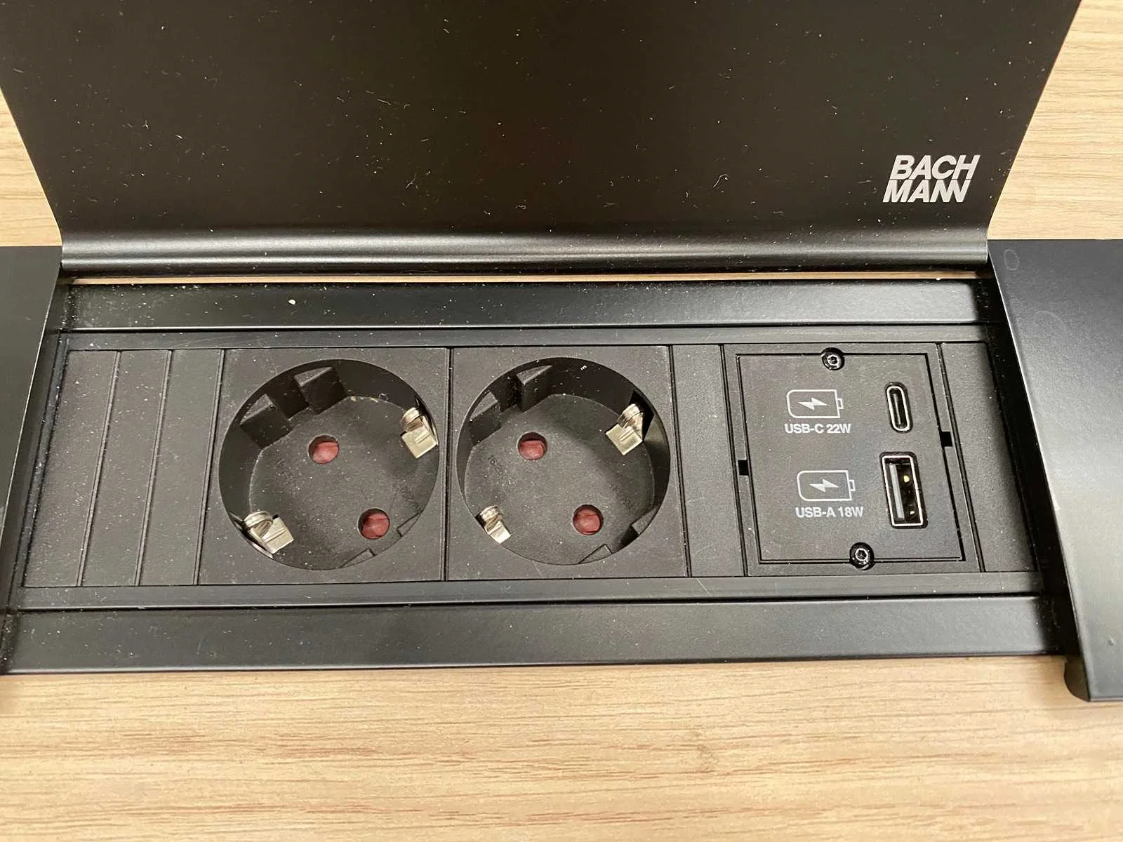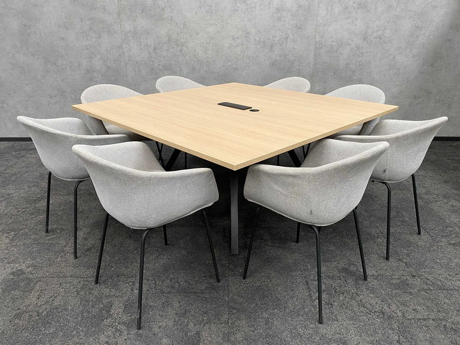 Kavel bestaande uit 8x Blatt design stoel en 1x Vepa conferentie tafel. tafel v.v. inbouwmodule (2x230V, USB, USB-C) Merk: Blatt/ Vepa Kleur: zwart, grijs, hout Lengte: 160cm Breedte: 160cm Hoogte: 75cm Zithoogte: 47cm