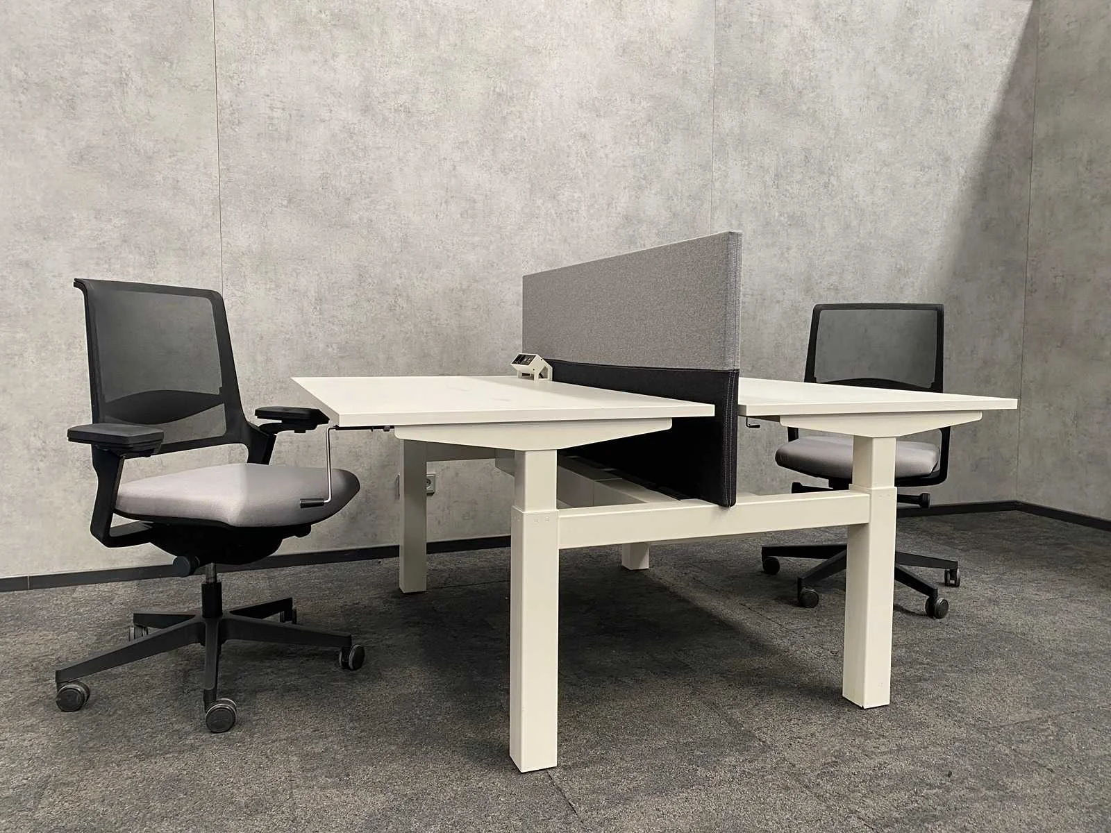 Kavel bestaande uit 2x Interstuhl Movy ergonomische bureaustoel v.v. 4D armleggers, zithoogte en zitdiepte instelbaar, kantelmechanisme rugleuning, verstelbare lendensteun. ----- 2x Bachman opbouwstekkerblok (2x230V + 2x USB) ----- 1x in hoogte verstelbaar duo bureau v.v. handslinger, grijs/ antraciet akoestische scheidingswand, draadgoot. Afm. ca. hoogte 64.5 tot 92.5 cm. bxd 140x80 cm. - LET OP transportafmetingen bureau ca. hxbxd 65x140x170 cm. Slingerbureau: true