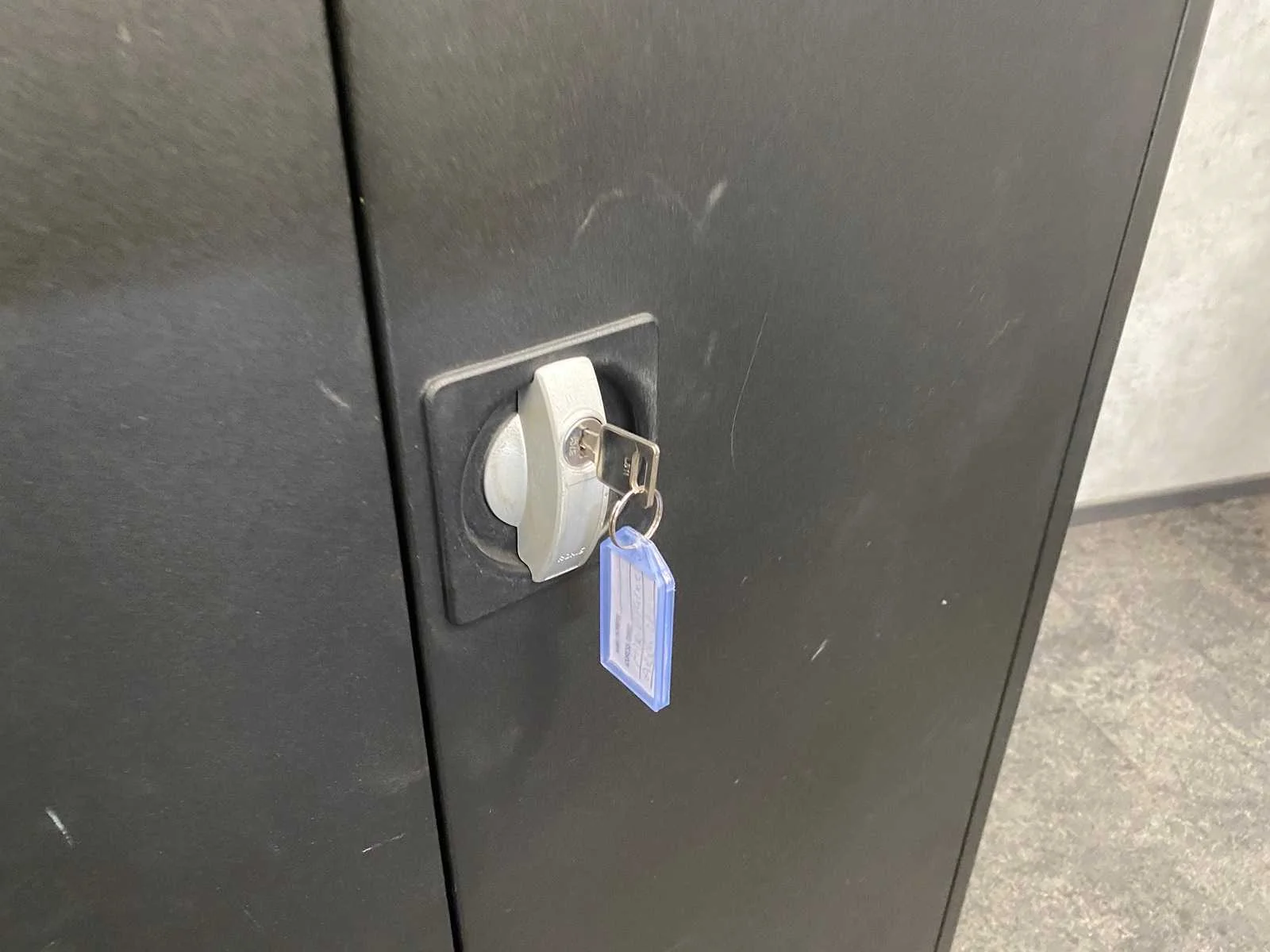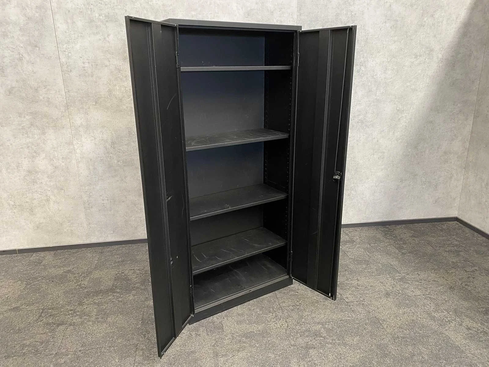 V.v. 4 verstelbare legborden en met sleutel Breedte: 92cm Hoogte: 195cm Diepte: 42cm Materiaal: metaal