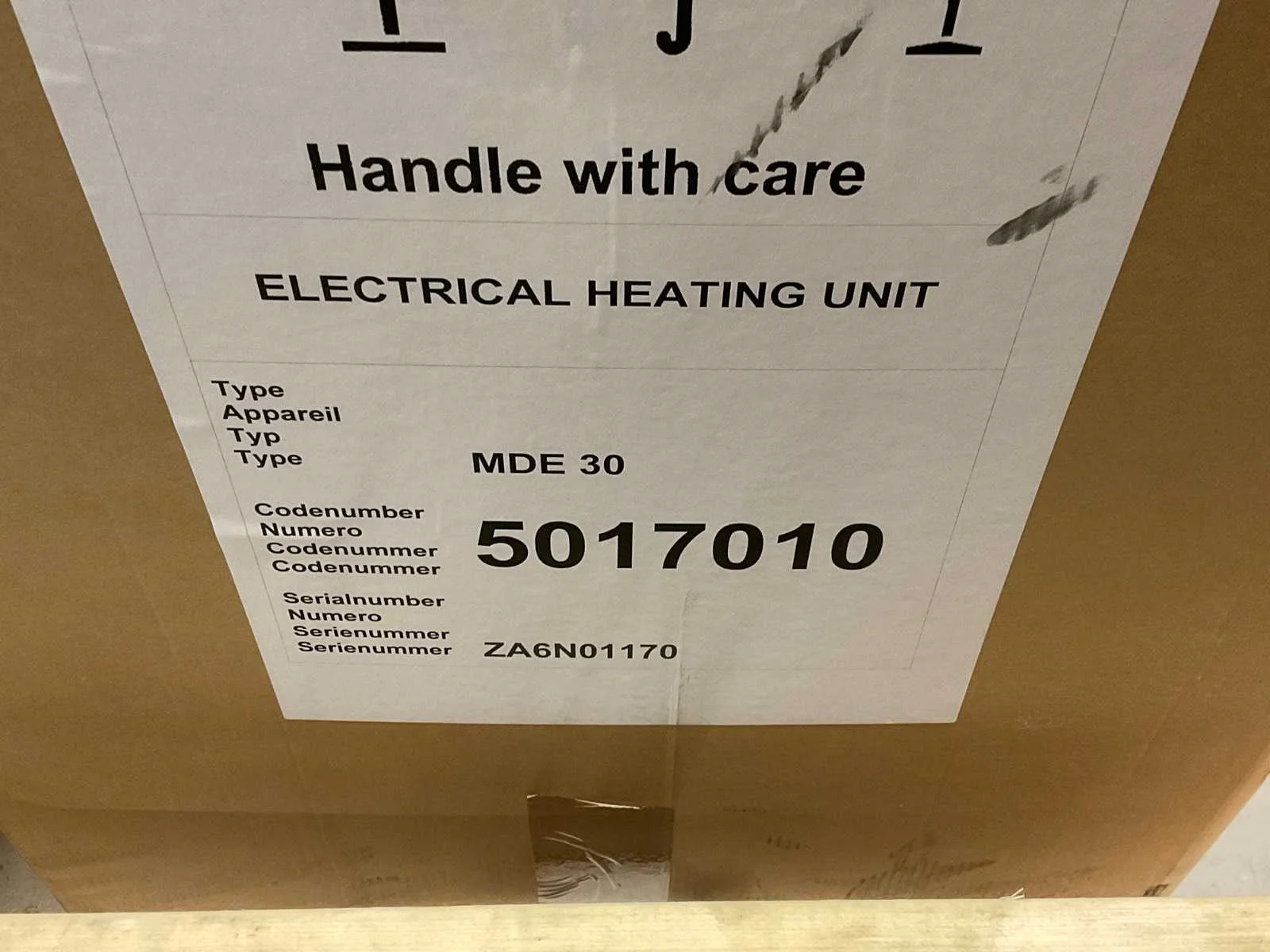 Ongebruikt Merk: Mark Type: MDE30 Verwarmingscapaciteit: 30kW Elektrisch: true Totale afmeting L: 440mm Totale afmeting Breedte: 670mm Totale afmeting Hoogte: 579mm