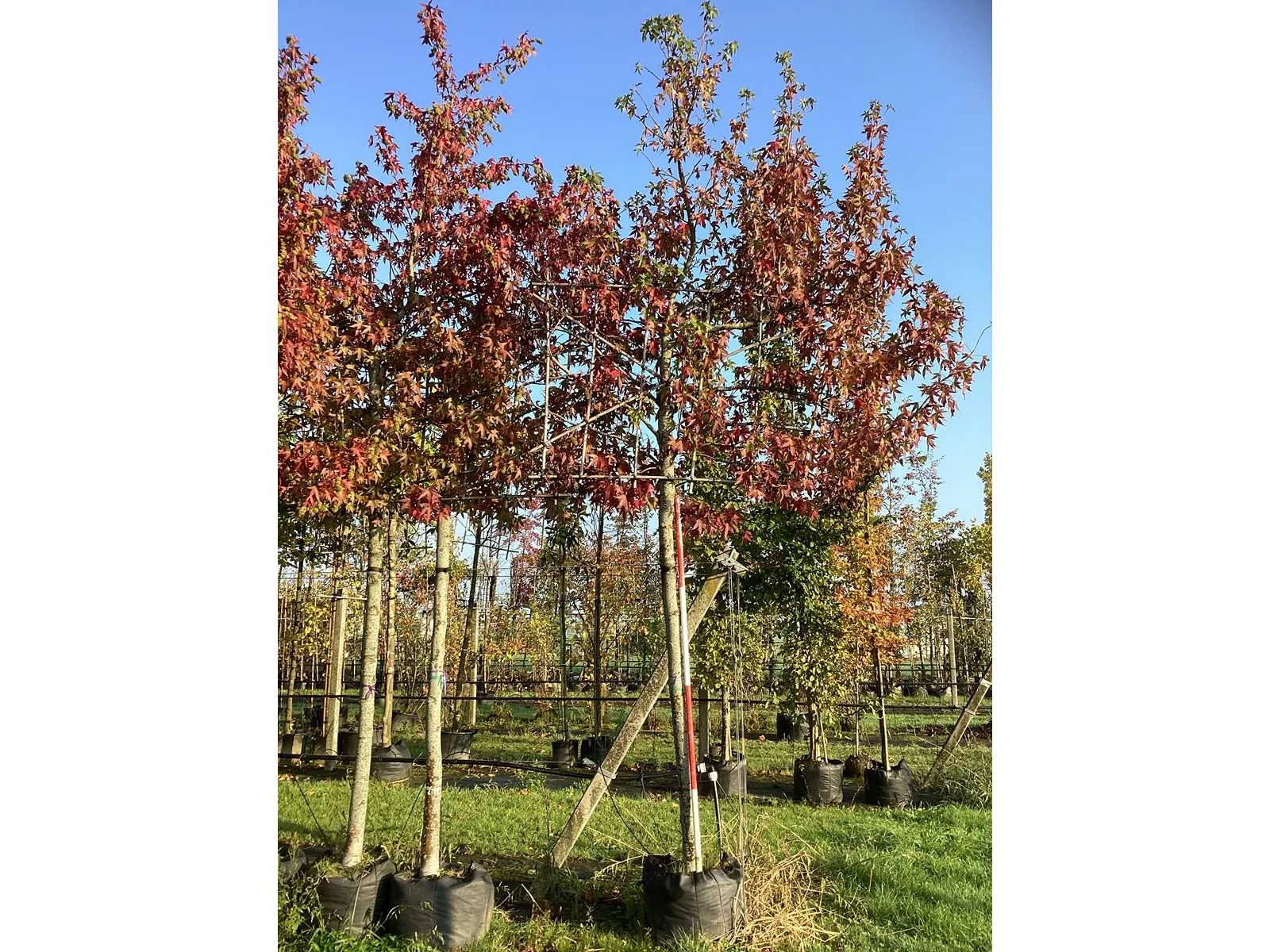 Deze Amberbomen hebben een lei rek op 180cm. De kavels worden door ons verzameld en klaargelegd voor transport; Wilt u gebruik maken van de bezorgservice neem dan contact op via het emailadres info@groviatrees.com Type: Amberboom Latijnse benaming: Liquadambar styraciflua Worplesdon In pot: true Stamdikte: 24cm