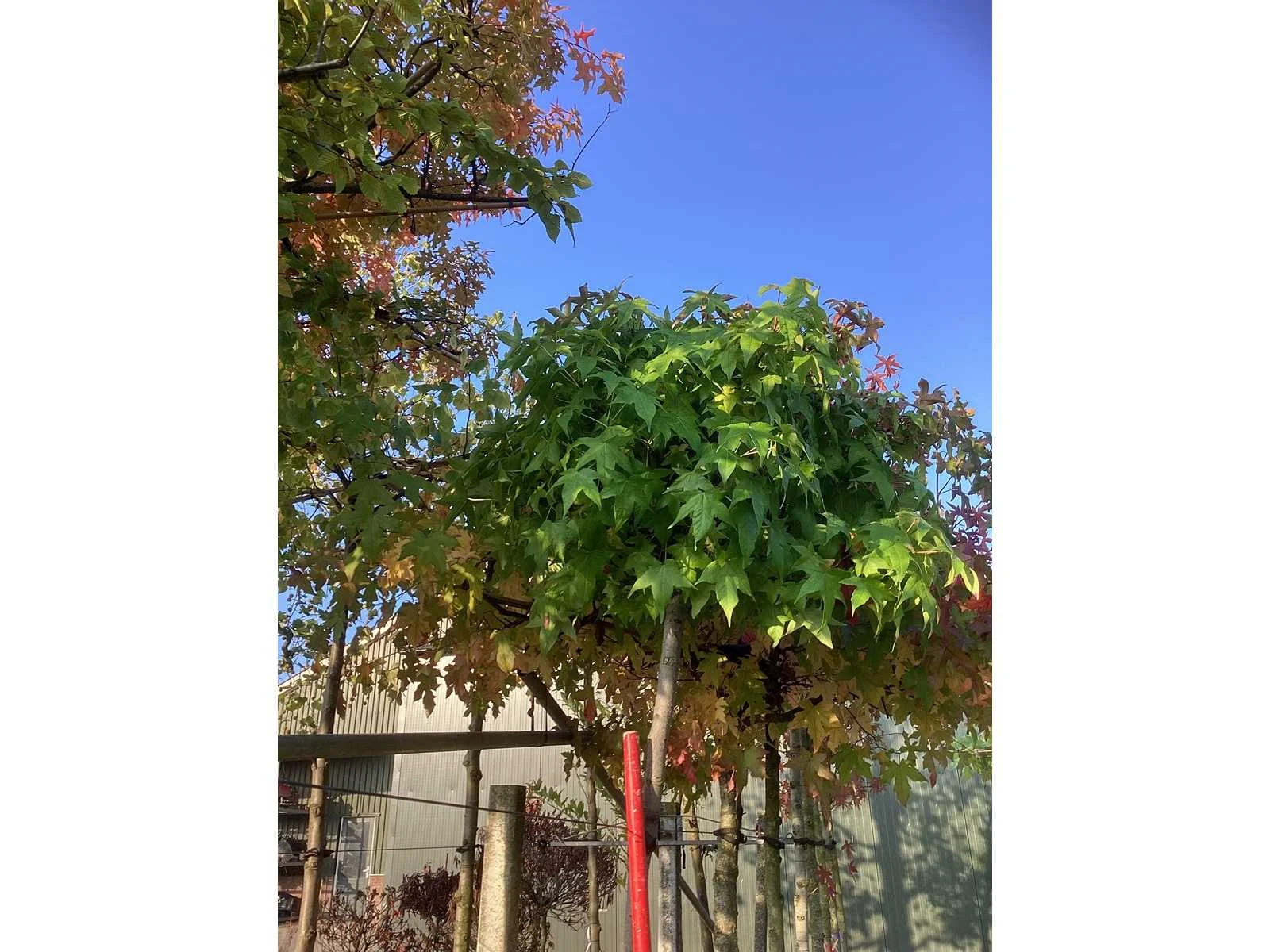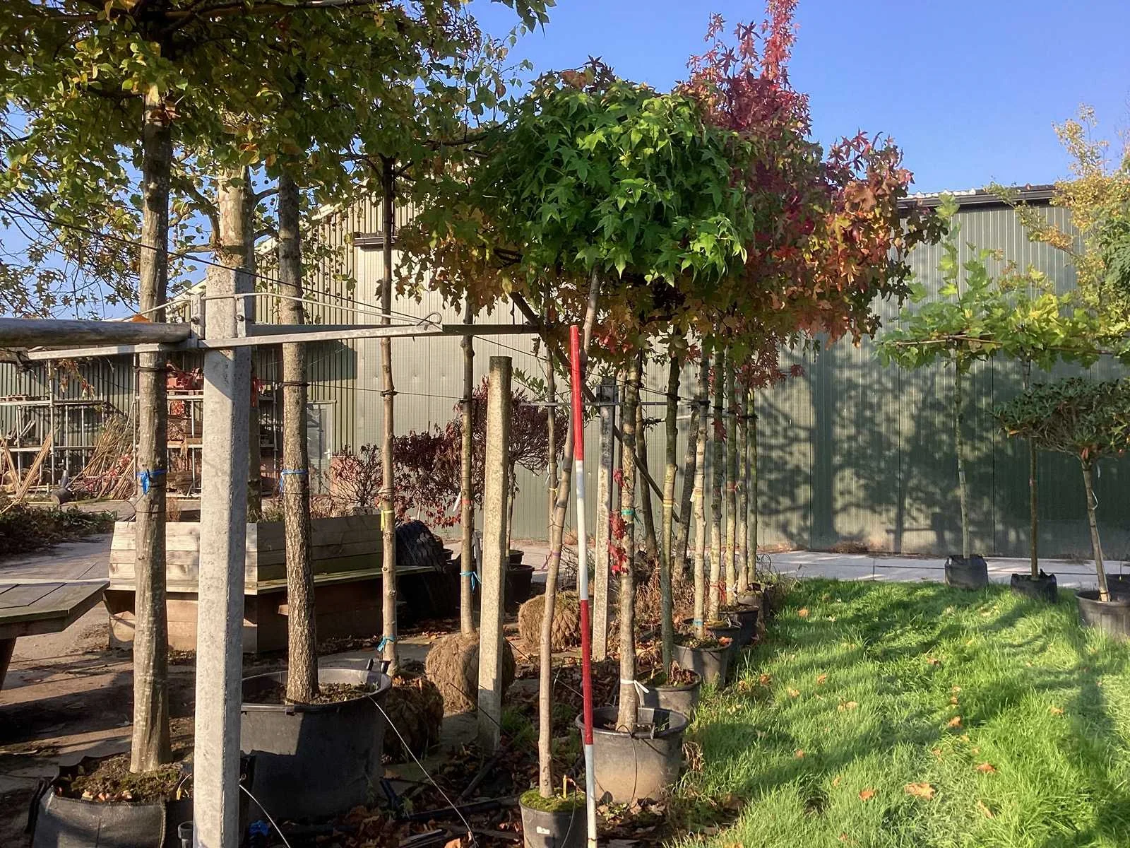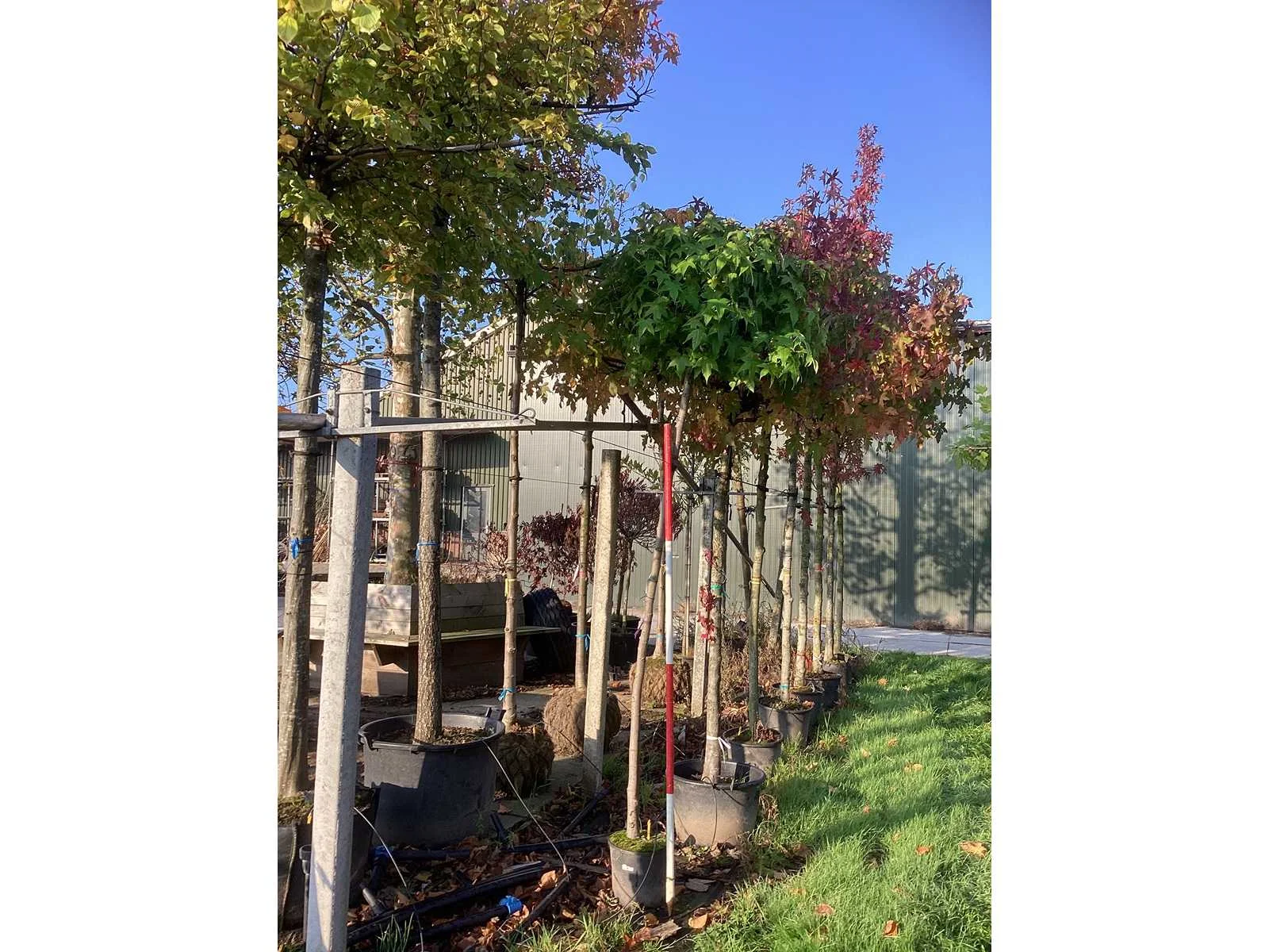 De kavels worden door ons verzameld en klaargelegd voor transport; Wilt u gebruik maken van de bezorgservice neem dan contact op via het emailadres info@groviatrees.com Type: Amberboom Latijnse benaming: Liquadambar Gum ball In pot: true Stamdikte: 11cm