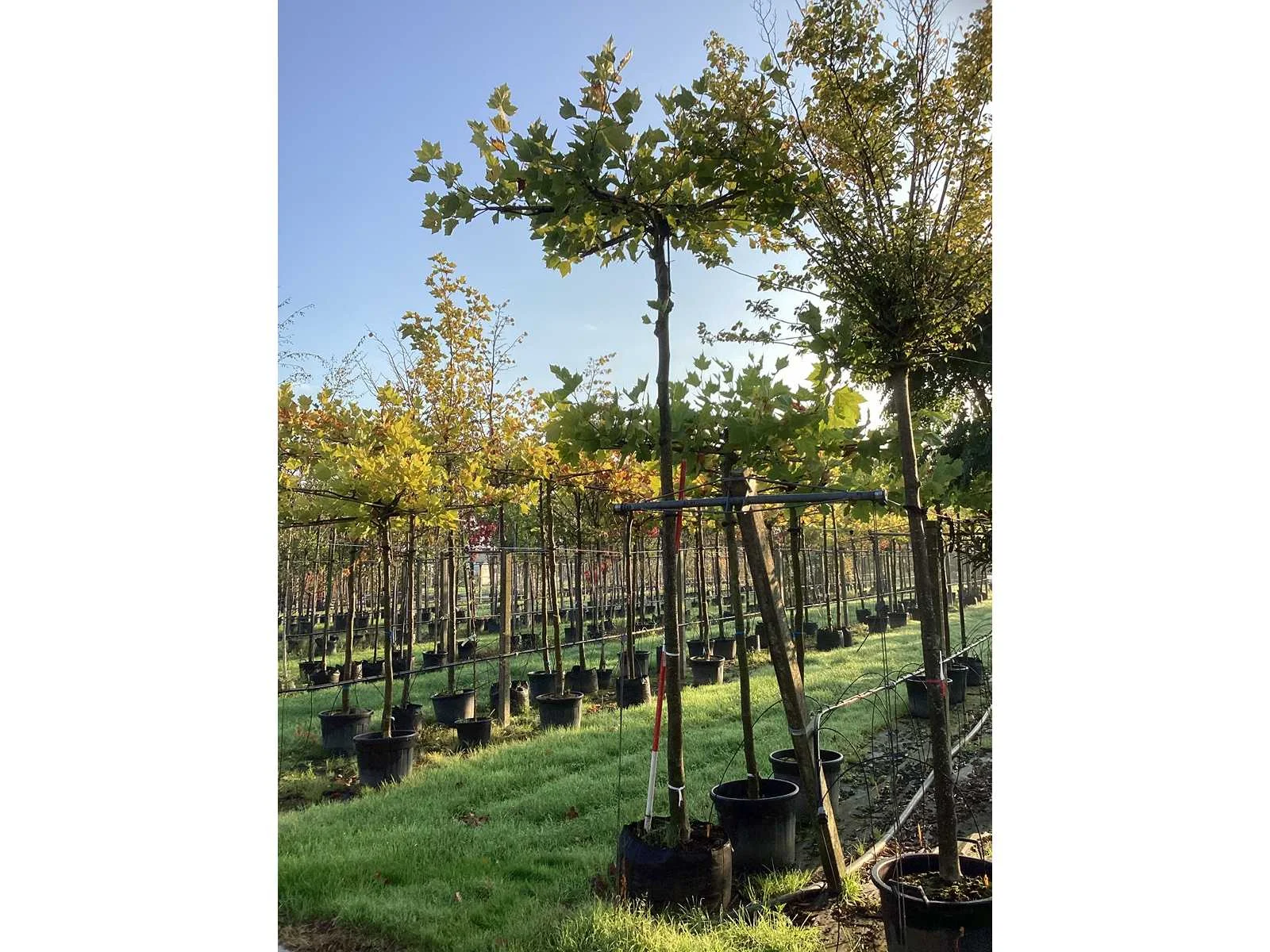 Deze platanen zijn gedakt op 300cm, ideaal voor uw tuin of boven uw terras voor bescherming van de zon. De kavels worden door ons verzameld en klaargelegd voor transport; Wilt u gebruik maken van de bezorgservice neem dan contact op via het emailadres info@groviatrees.com Type: Gewone Plataan Latijnse benaming: Platanus hispanica Hoogte ca.: 350cm In pot: true Stamdikte: 20cm