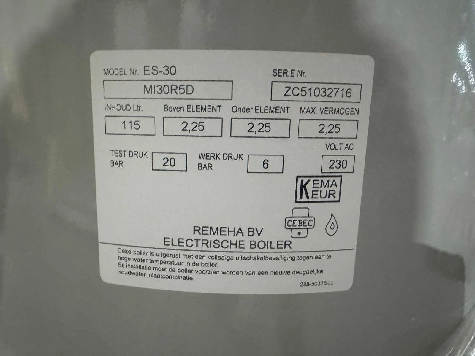 Remeha - sentry es30, 115 liter - elektrische boiler (demo)