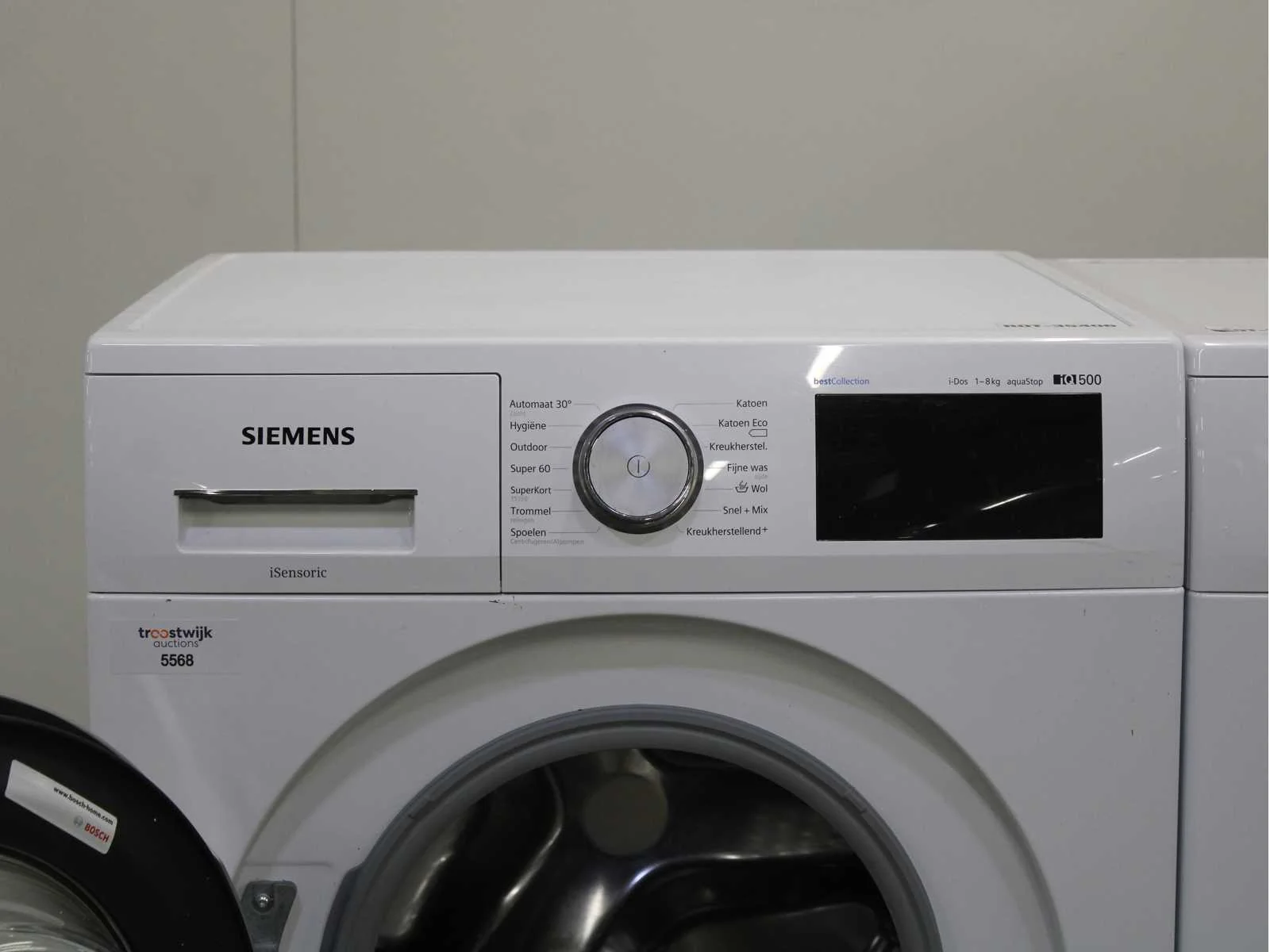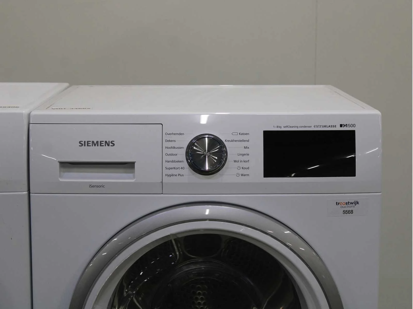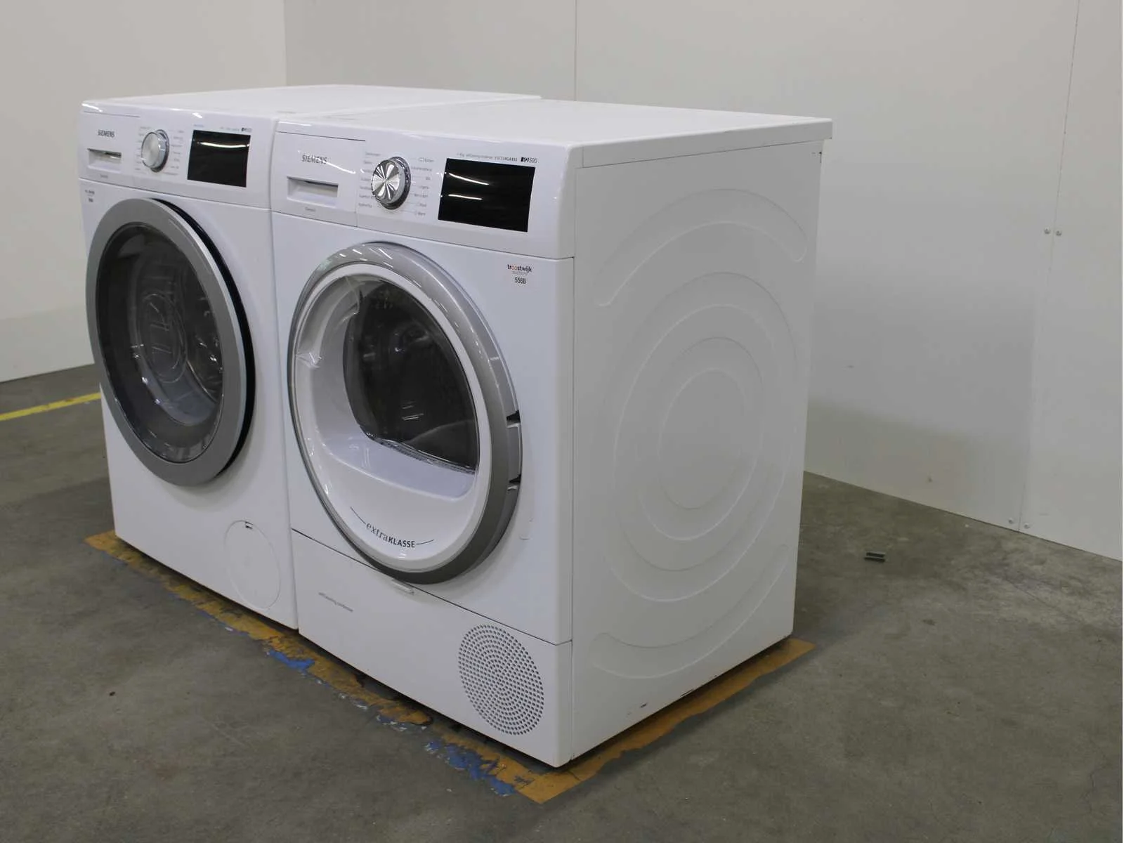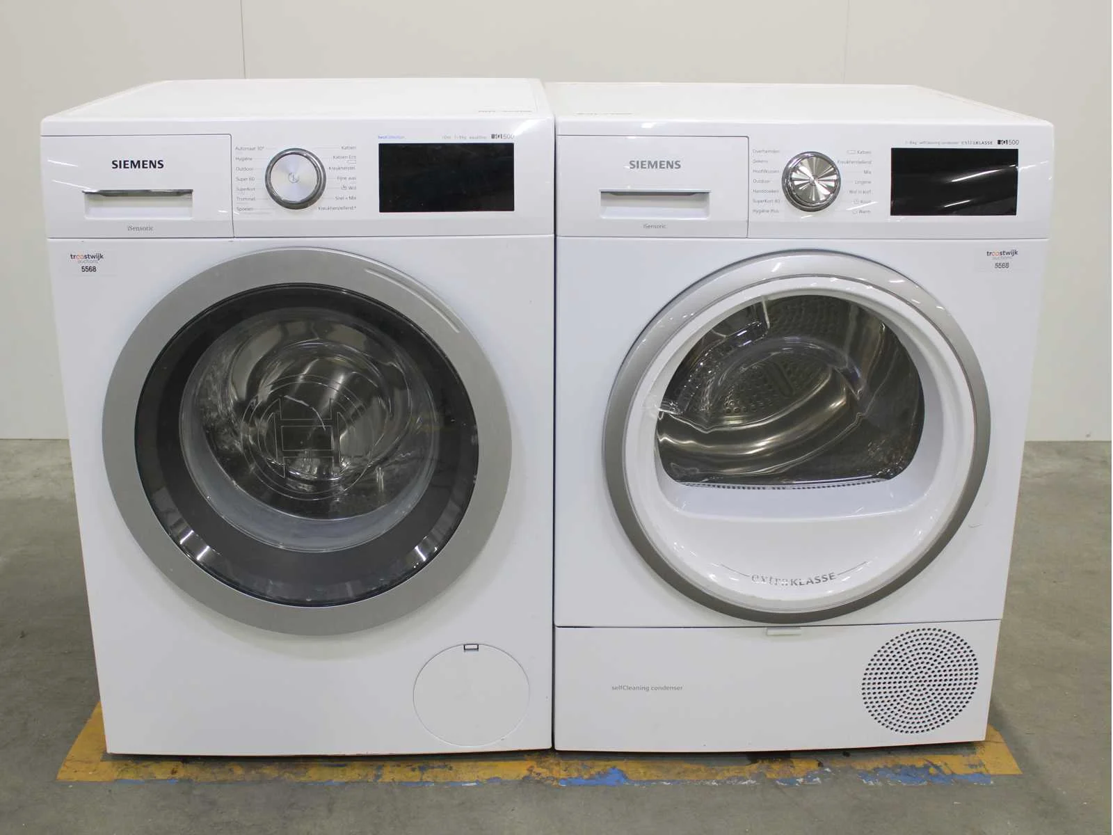 Deze wasmachine en wasdroger komen uit een partij jong gebruikt A-Merk witgoed. De machines zijn volledig getest, gereinigd en indien nodig gerepareerd. Houdt er rekening mee dat de machines lichte gebruikssporen kunnen hebben. Wasmachines en wasdrogers hebben vaak standaard afmetingen. Hoogte 85cm, Breedte 60cm en Diepte 60 tot 70cm, incl. uitstekende slangen e.d. aan de achterzijde. Als de machine vrij komt te staan is de afmeting minder relevant. Wil je de machine in een nis plaatsen of inbouwen? Controleer dan de exacte afmetingen op basis van het aangeboden merk en model/type. Within 7 days Merk: Siemens Serienummer: WM14T2G2NL/01 en WT7U4691NL/03