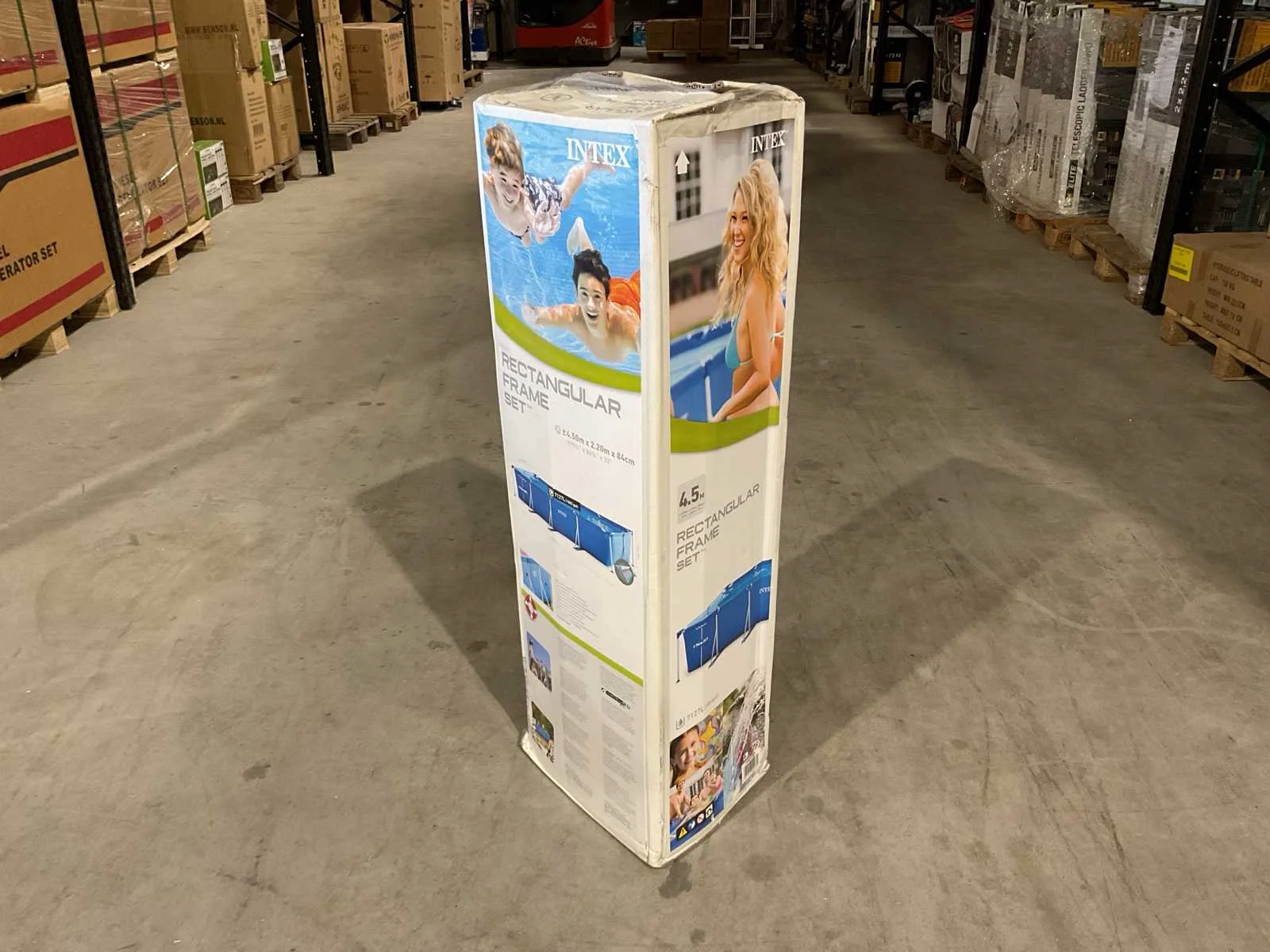 Voorzien van Opzetzwembad; 3-laags PVC met gerasterde polyester tussenlaag; Frame gepoedercoat staal; Vorm: Rechthoek; Inhoud 7127 liter; Aanbevolen waterdiepte (cm) 76; 5 persoons; Pompaansluiting (mm) 32; Lengte (cm) 450; Breedte (cm) 220; Buitenafmeting lxb (cm) 512 x 281; Hoogte (cm) 84; Dikte liner wand (mm) 0,56; Dikte liner bodem (mm) 0,50; Reparatieset; Ongebruikt in doos (Afmeting transport verpakking 450x220x840 mm lxbxh, gewicht 39.2 kg) Merk: INTEX Model: 28273NP Product type: 4,5m Kleur: Blauw Gewicht: 39.2kg Lengte: 45cm Breedte: 22cm Hoogte: 84cm Materiaal: Dubbelwandig PVC folie met gerasterde binnenlaag