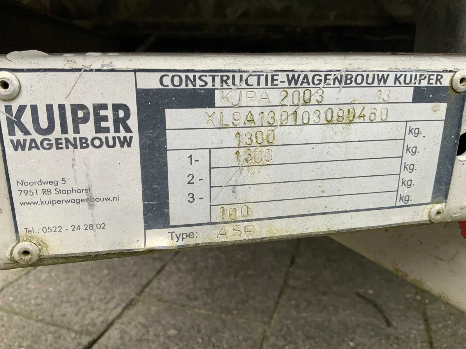 Merk: Kuiper Aantal assen: 1 Laadbak afmeting l: 400cm Laadbak afmeting b: 210cm Ledig gewicht: 830kg Laadvermogen: 470kg Datum eerste toelating: 2003-09-23 Datum eerste toelating (NL): 2003-09-23 Kenteken: WJ-TJ-04 Kentekenpapieren compleet?: true Hoogte: 283cm Lengte: 545cm Breedte: 215cm
