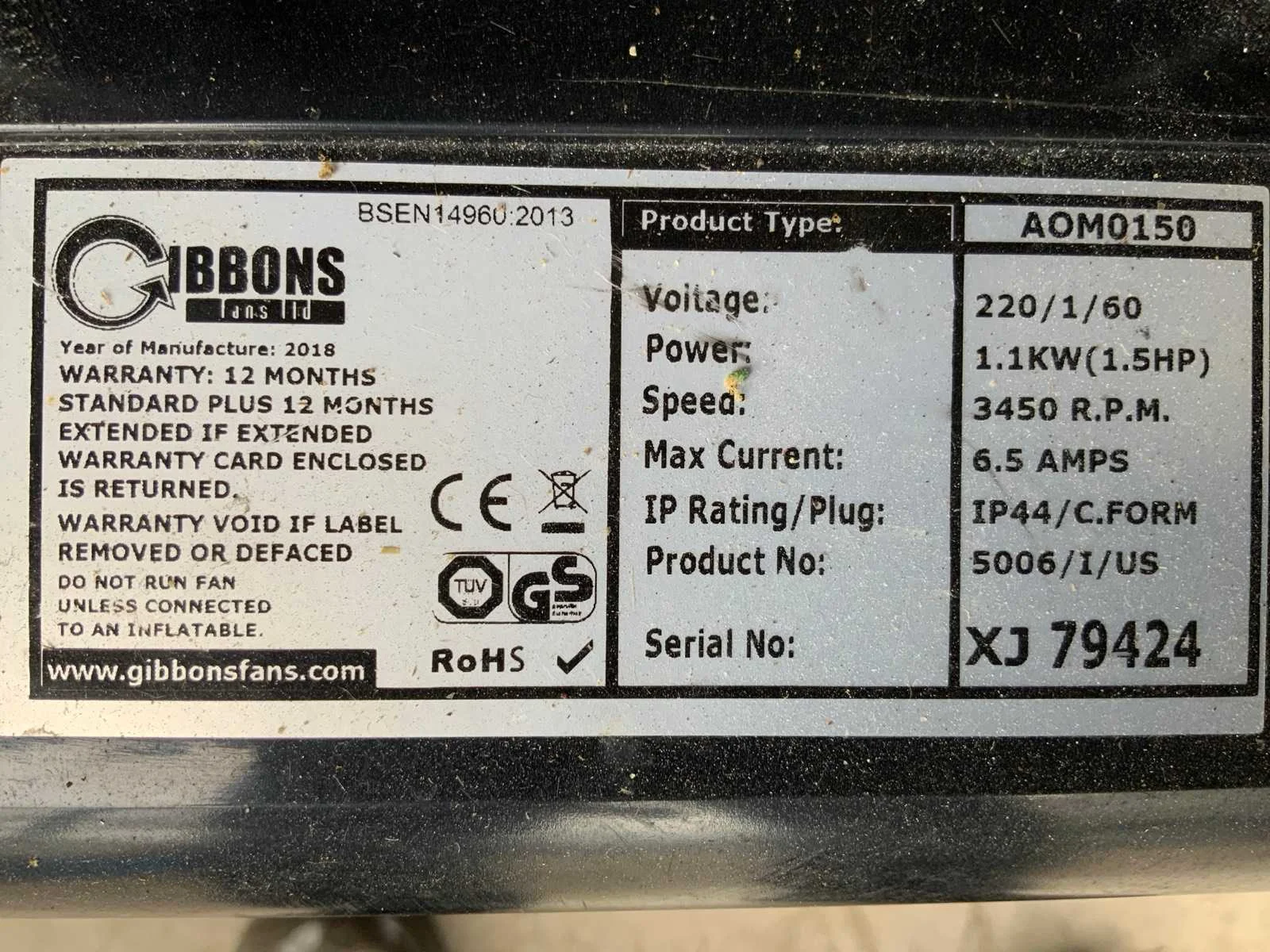 Merk: Gibbons Model: Luchtblower Lengte: 60cm Breedte: 30cm Hoogte: 55cm