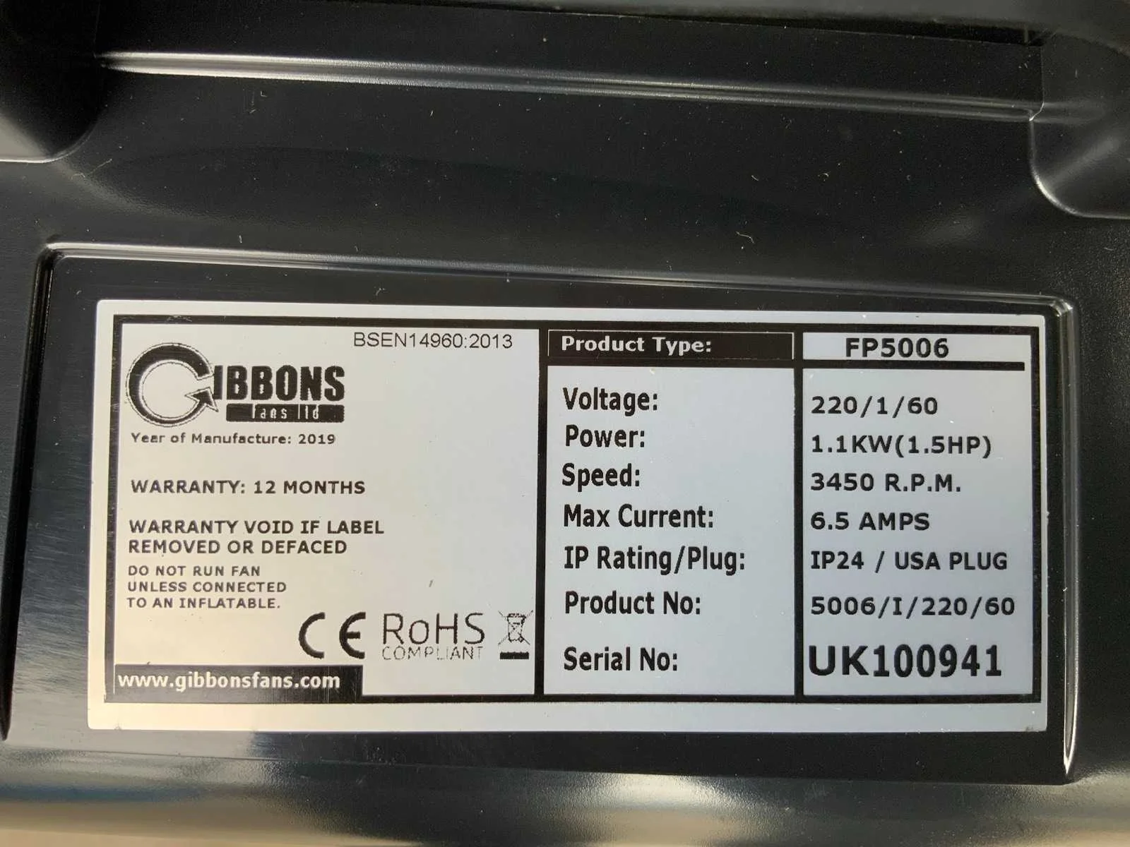 Merk: Gibbons Model: Luchtblower Lengte: 60cm Breedte: 30cm Hoogte: 55cm