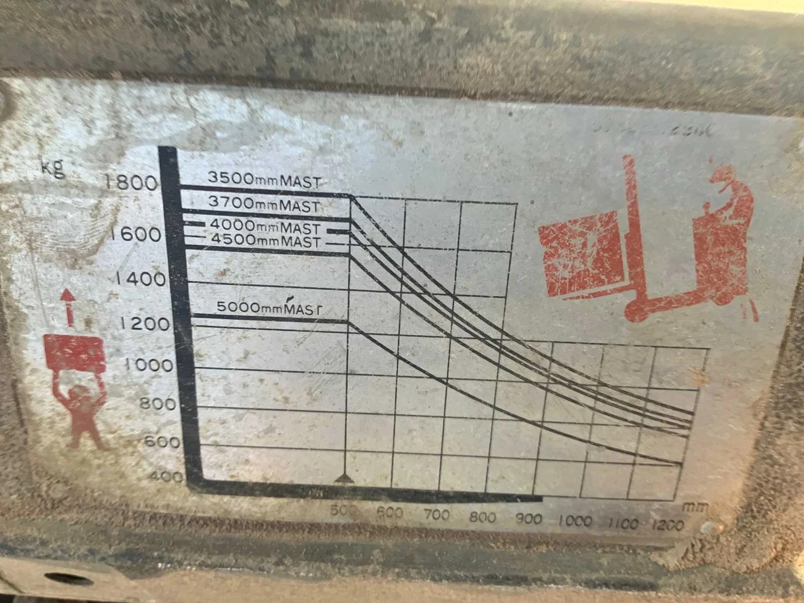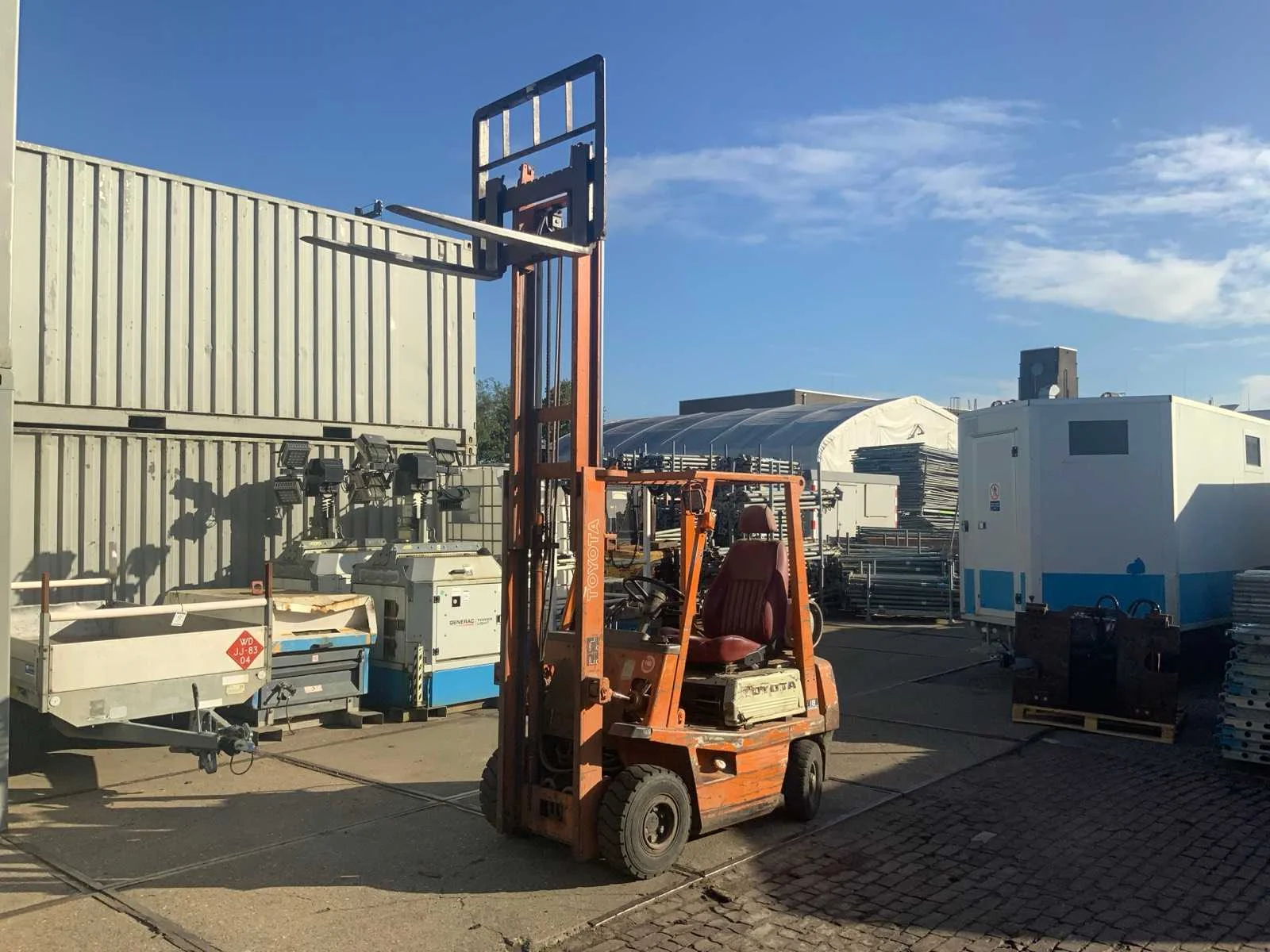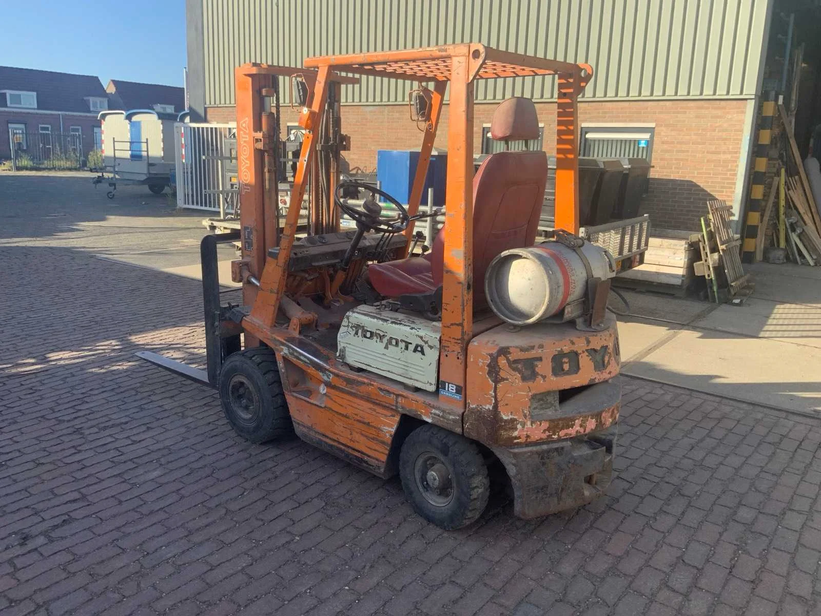 Wordt verkocht zonder gasfles Merk: Toyota Type: FGI 18 Brandstof: LPG Mast: Duplex Soort band: Luchtbanden Aantal wielen: 4 Free-lift: true Duplex mast: true Lepellengte: 1070mm Max. hefhoogte: 3000mm Luchtbanden: true Minimale doorrijhoogte: 2000mm Totale afmeting L: 3250mm Totale afmeting Breedte: 1150mm Totale afmeting Hoogte: 1980mm LPG: true