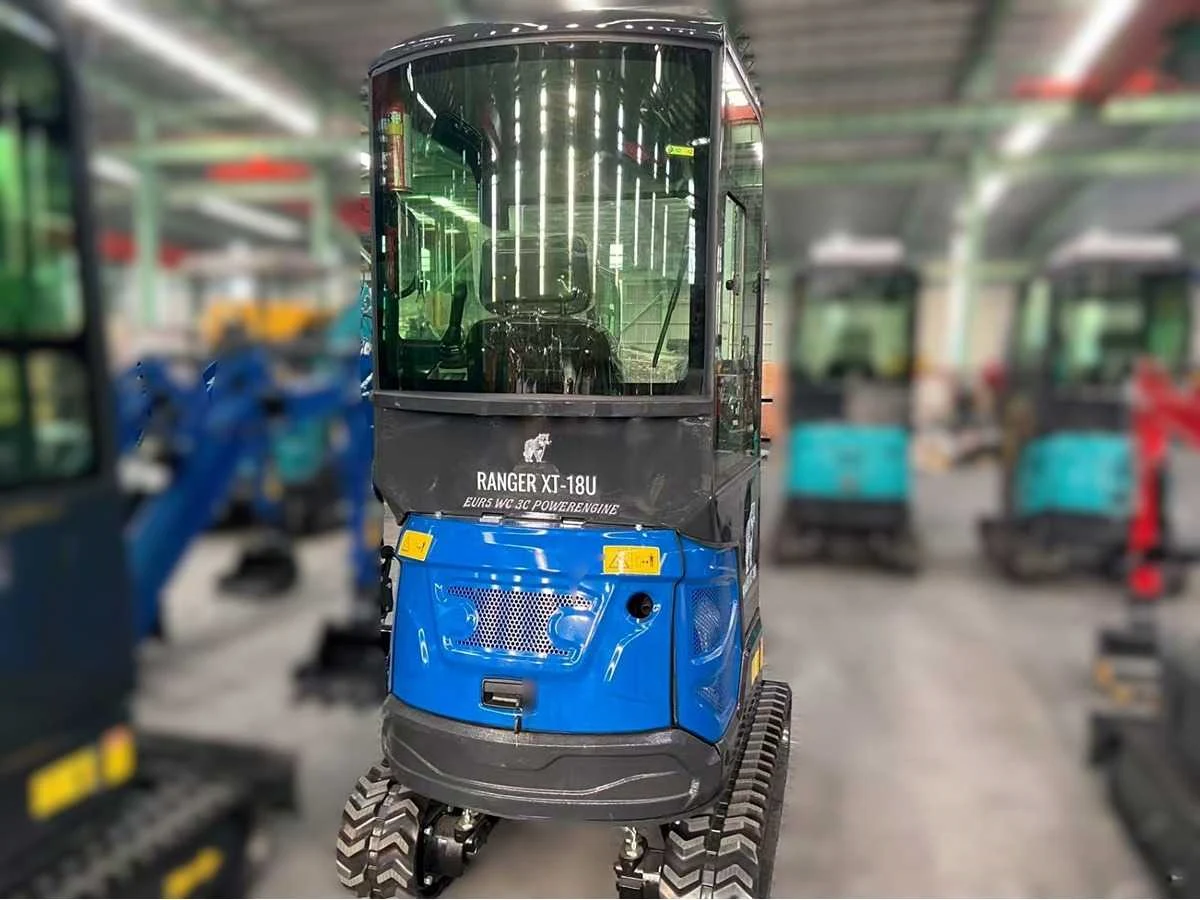 1800 kg minigraafmachine met 3 cilinder eur5 watergekoelde dieselmotor van 18.4KW / 25pk. uitgerust met servo bediening. Voorzien van cabine, zwenk giek met radius van 1500mm, dozerblad 1100mm, semi automatisch bakwisselsysteem, hydrauliekpomp 22L/min, opbreekkracht 10KN, tankinhoud 9.5 liter. ongebruikte machine Merk: Ranger Type: XT-18U Bouwjaar: 2025 Merk motor: Laidong Motorvermogen (kW): 18.4kW Aantal cilinders: 3 Brandstof: Diesel Bedrijfsgewicht: 1800kg Gieklengte: 3260mm Max. werkbereik: 3260mm Max. graafdiepte: 2000mm Inclusief graafbak: ja Graafbak afm. l: 400mm Graafbak afm. b: 400mm Graafbak afm. h: 600mm Rups breedte: 180mm Afgelezen urenstand: 0 Eigen gewicht: 1800kg Totale afmeting L: 3320mm Totale afmeting Breedte: 1100mm Totale afmeting Hoogte: 2400mm