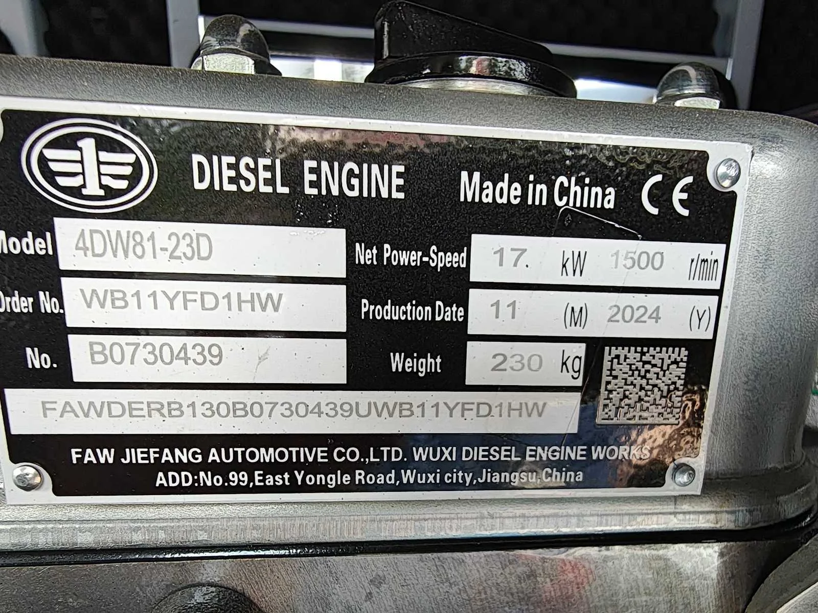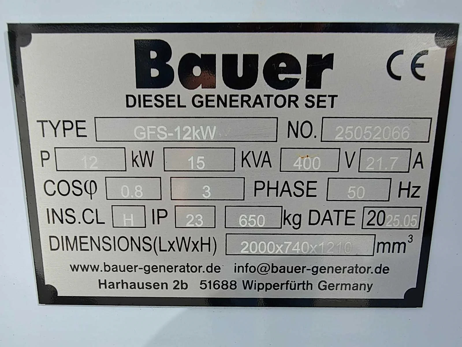 Ongebruikte diesel generator 15KVA Merk: Bauer Type: GFS-12KW Bouwjaar: 2025 Serienummer: 25052066 Capaciteit.: 15kVA Aansluiting: 400V Motorcapaciteit: 12kW Generator capaciteit: 21.7A Afgelezen urenstand: 0 Machinegewicht: 650kg Totale afmeting L: 2000mm Totale afmeting Breedte: 740mm Totale afmeting Hoogte: 1210mm