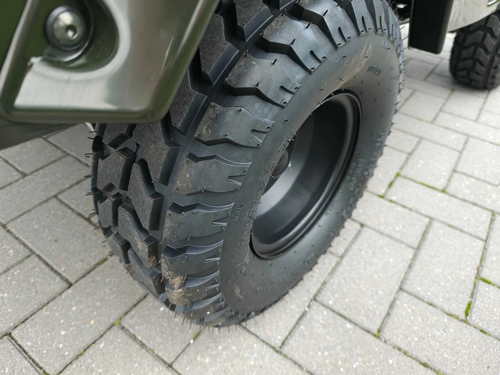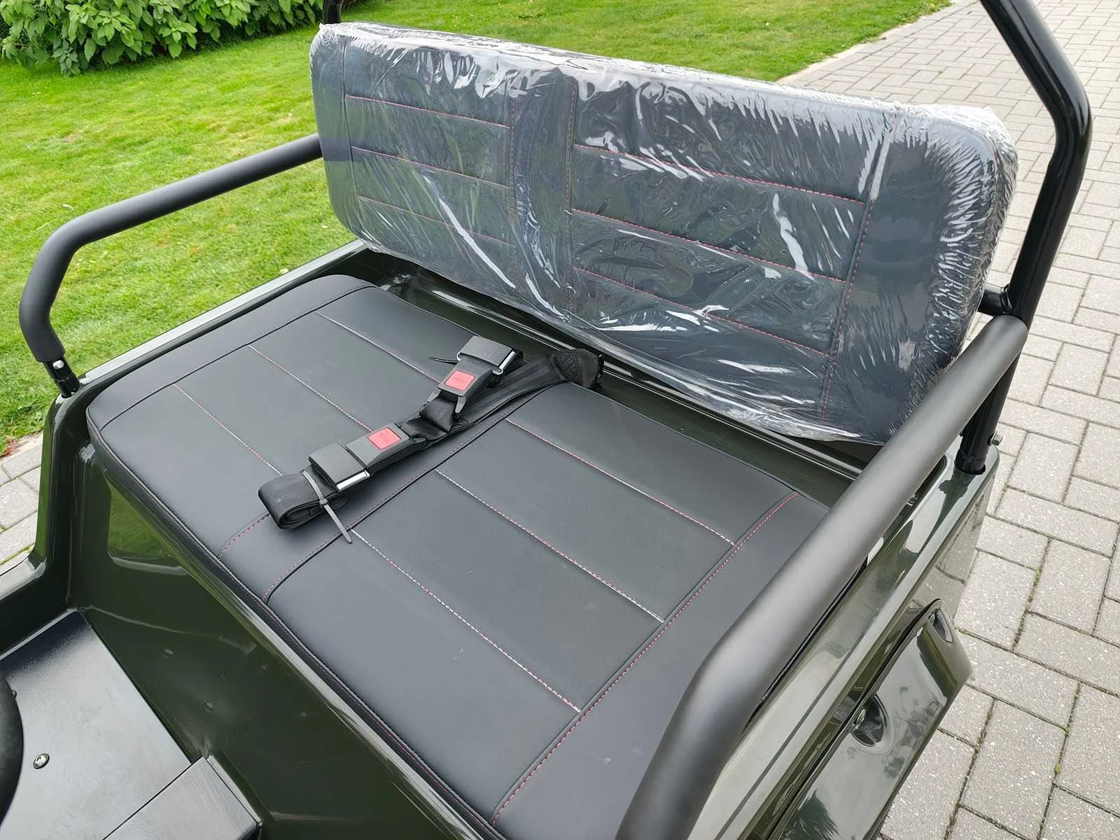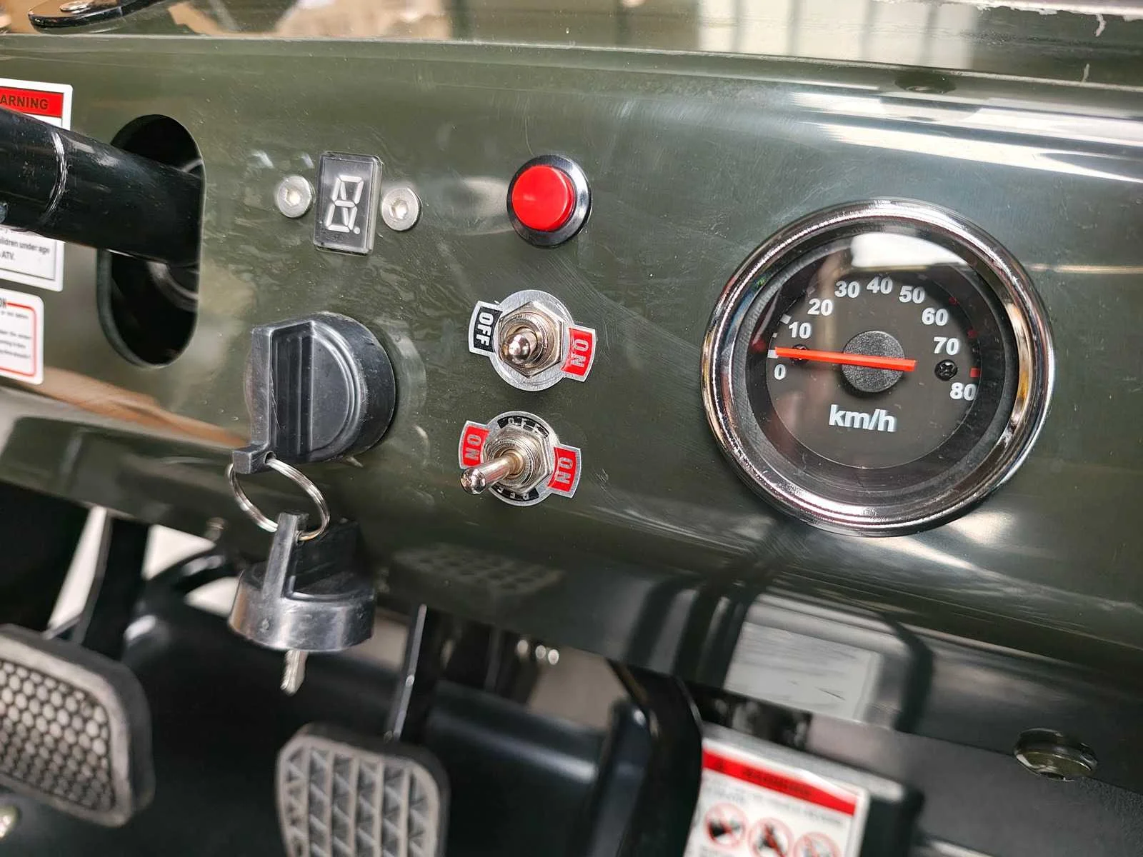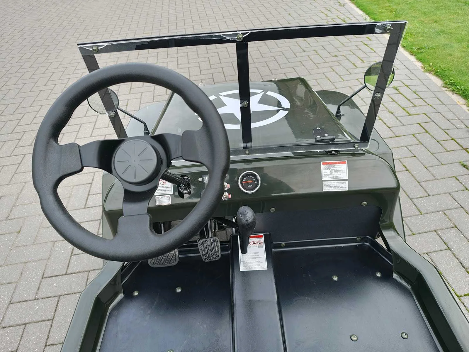 Ongebruikte HILLBIL Mini Willys Jeep kinderauto met benzinemotor 150 cc terreinwagen met vering, trekhaak en voorruit groen tot 60 km/u, 3 versnellingen vooruit en 1 achteruit, Draagvermogen: tot 200 kg (1 volwassene en 1 kind) Leeggewicht: 180 kg Motor: 150 cc 1 cilinder 4-taktmotor Aandrijving: Ketting, achterwielaandrijving Transmissie: Semi-automatische transmissie 3 versnellingen vooruit 1 neutrale versnelling 1 achteruitversnelling Elektrische starter Accu: 12V/9Ah Ontstekingstype: CDI Tankinhoud: ca. 4 liter Wielbasis: ca. 1070 mm Bodemvrijheid: ca. 90 mm Voor-/achterrem: schijfrem Luchtgekoeld Stuurhoek: >30 Brandstof: Super, alternatief E10 wordt geleverd in doos/krat en dient afgemonteerd te worden Merk: Willy mini Jeep Model: LQ-JP Gewicht: 180kg Aantal zitplaatsen: 2 Aantal sleutels: 2 Transmissie: 4 versnellingen Bouwjaar: 2025 Cilinderinhoud: 150cc Brandstof: benzine Gewicht: 180kg