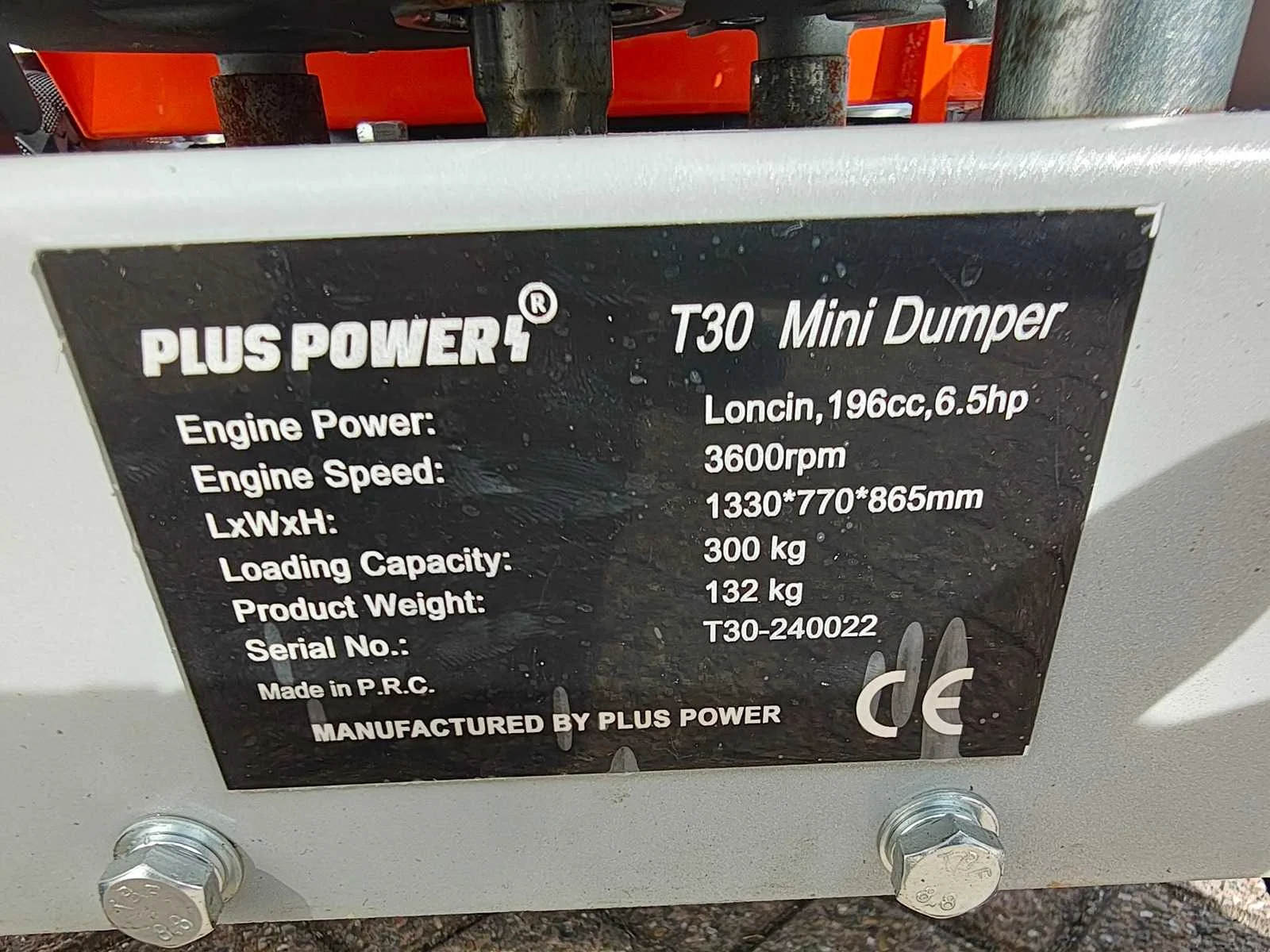 Gemotoriseerde kruiwagen met laadcapaciteit van 300kg, loncin benzine motor 196cc, 6.5pk. ongebruikt Merk: Plus Power Model: T30 Gewicht: 132kg Lengte: 133cm Breedte: 77cm Hoogte: 86.5cm