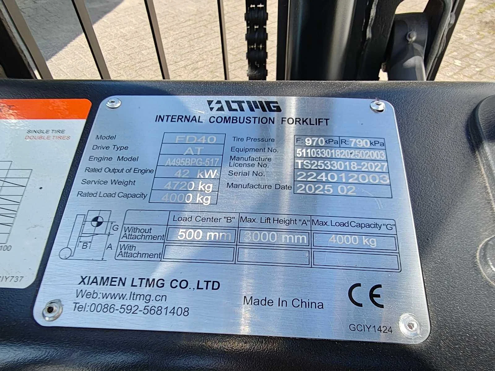Ongebruikte diesel heftruck 4 ton hefvermogen Merk: LTMG Type: FD40 Bouwjaar: 2025 Serienummer: 511033018202502003 Brandstof: Diesel Kenteken: COC Mast: 2 delig Aantal wielen: 4 Afgelezen urenstand: 1 Duplex mast: true Eigen gewicht: 4720kg Hefvermogen: 4000kg Lepellengte: 1100mm Max. hefhoogte: 3000mm Hefhoogte: 3000mm Luchtbanden: true Diesel: true