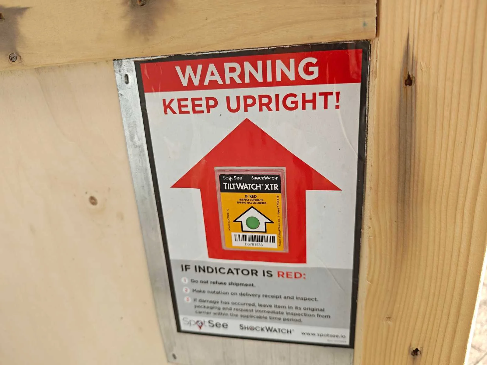 Houten transportkratten beschermd en inrijdbaar met palletwagen. lengte 1450mm breedte 880mm hoogte 2500mm, met trillings indicatoren Afmeting l: 1450mm Afmeting b: 880mm Afmeting h: 2500mm
