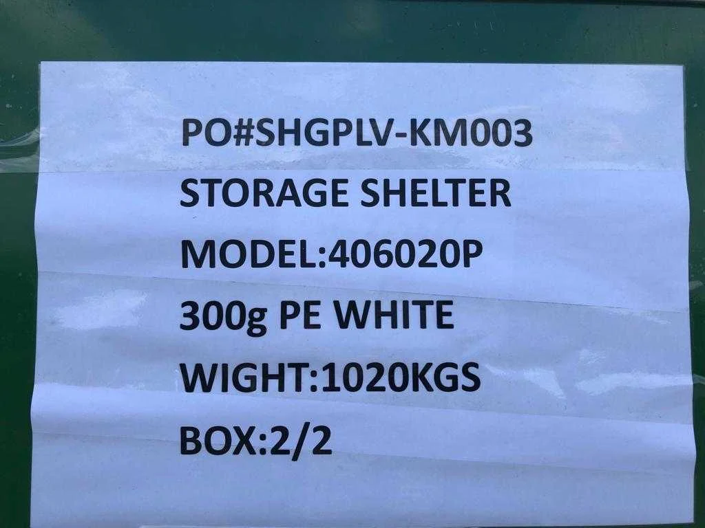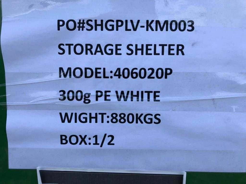 Eversteel Opslag tent/Storage Building, afmeting: 18 x 12 x 6,1 mtr, 1900 kg, gegalvaniseerde buizen, met oprolbare deur (maat: 4 x 4,5 mtr) verpakt in 2 ijzeren kratten. Merk: Eversteel Model: EV-40-60-20 Kleur: Wit Gewicht: 1900kg Lengte: 1800cm Breedte: 1200cm Hoogte: 610cm