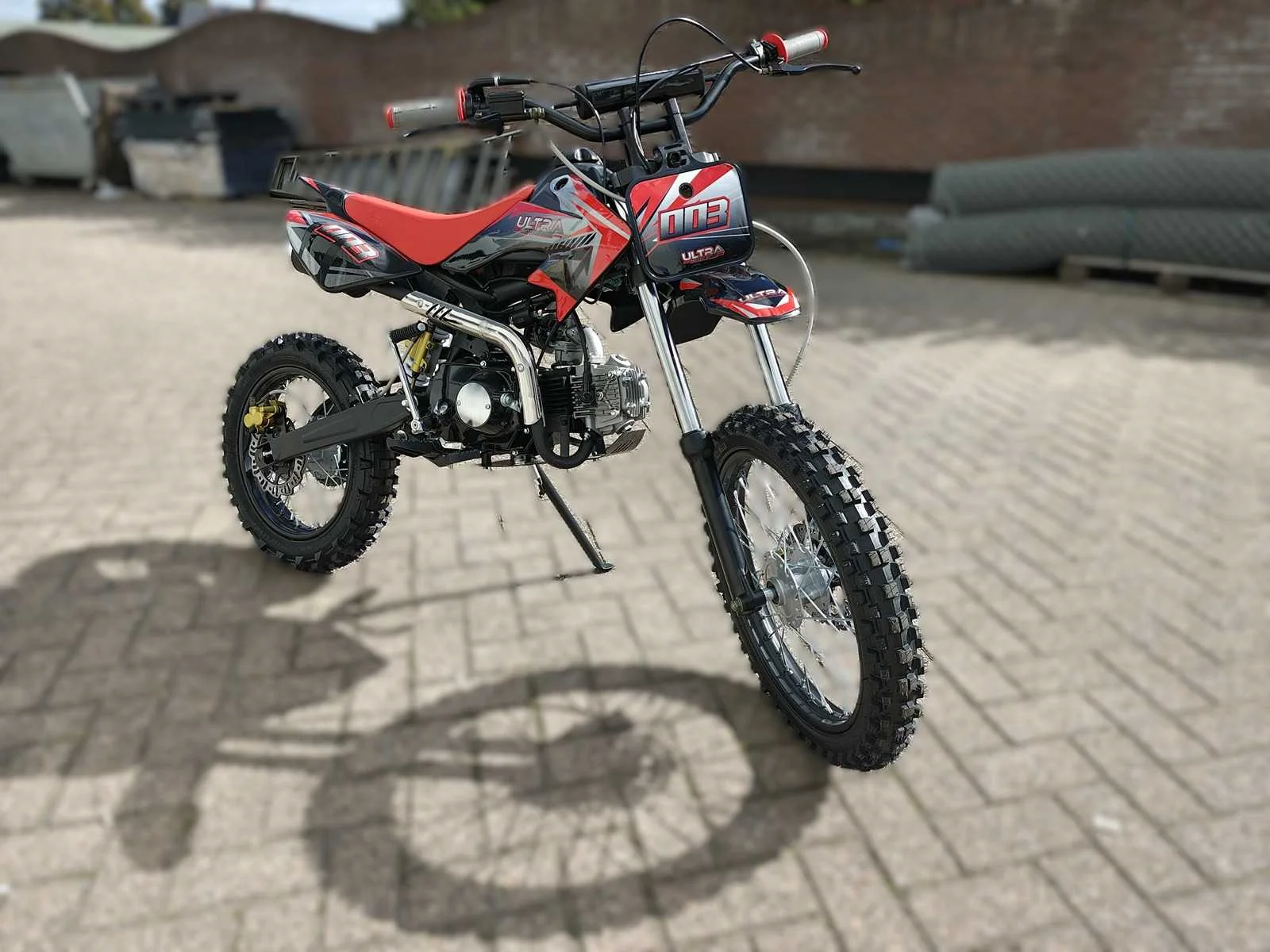 Voorzien van 110cc motor Manuele koppeling; kickstart Wiel/velg: V: 90/100-14 (14") A: 70/100-17 (17") Hydraulische schijfrem Olieschokdemper Enkele stalen uitlaatpijp Maximale snelheid: 70 km/u Ongebruikt in doos Transport verpakking: 1295 x 375 x 620 mm wordt geleverd in doos, ongebruikt Merk: Ultra Model: DB001 Brandstof: benzine Cilinderinhoud: 110cc Bouwjaar: 2025