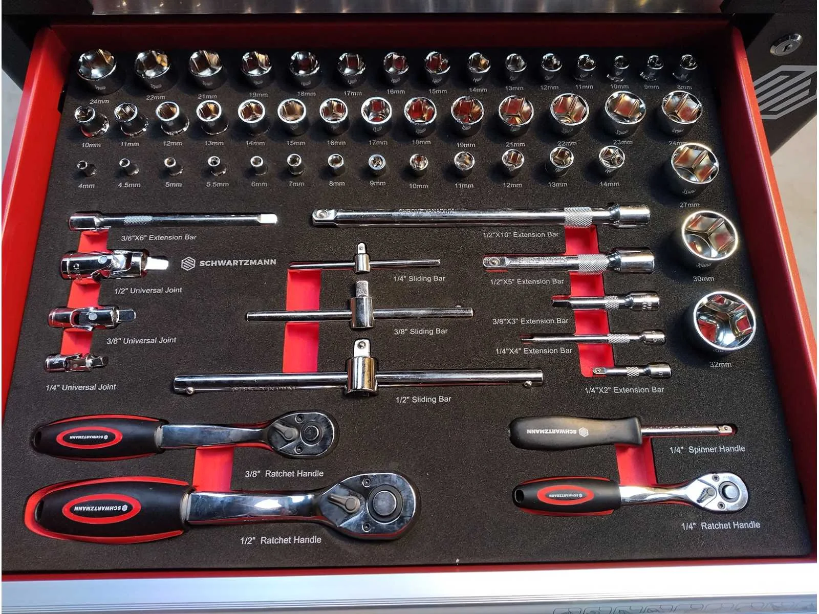 6 laden waarvan 4 gevuld, met zijdeur 2 zwenkwielen en 2 vaste wielen, handvat. ongebruikt in doos Merk: Schwartzmann Model: 6/4 Kleur: rood