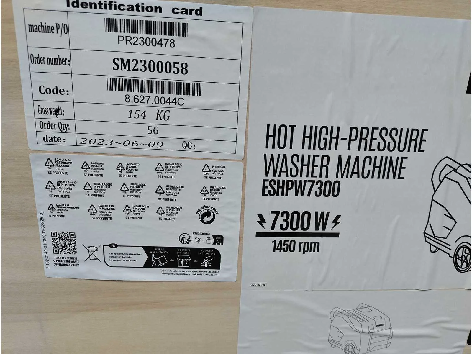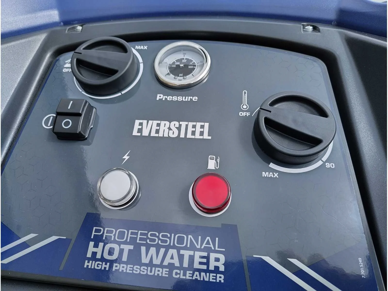 Diesel hogedruk stoomreiniger professioneel, incl. 10 meter hogedrukslang en spuitlans, vloeistof aanzuiging voor reinigingsproducten, waterfilter, dieseltank voor verwarming 10 liter inhoud, 2 zwenkwielen en 2x vaste wielen, 5 polig 16 Amp industriestekker 380 volt, 7300 watt, 69 KW verwarming vermogen. tot 110 graden. in krat Merk: Eversteel Type: ESHPW7300 Bouwjaar: 2025 Serienummer: 8.627.0044C-SM2300058-2023/20-002 Maximale werkdruk: 210bar Temperatuurbereik max.: 110°c Capaciteit.: 900l/hr Dieselgestookt: true Mobiel: true Vermogen: 7.3kW Aansluiting: 380V Eigen gewicht: 154kg Totale afmeting L: 1000mm Totale afmeting Breedte: 740mm Totale afmeting Hoogte: 850mm