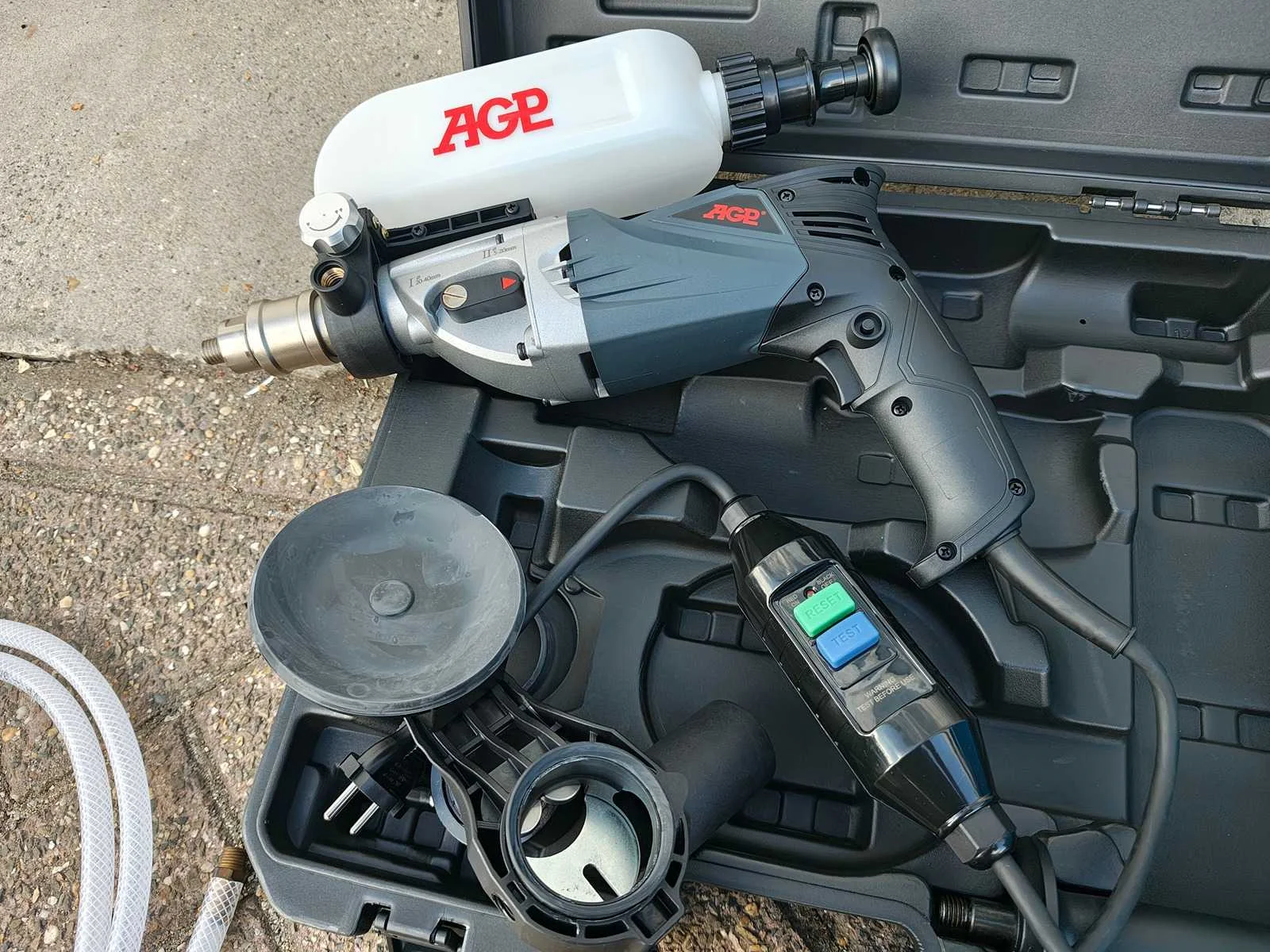 AGP Nieuwe overjarige Diamantboormachine met waterkoeling, geleider M14 en 1/2" opname. Deze set is inclusief watervat, PRCD, geleider. Nieuwe overjarige Baier BDN 1700 watt proffesionele sleuvenzaagmachine Merk: AGP en Baier Type: AGP TC402 en Baier BDN125