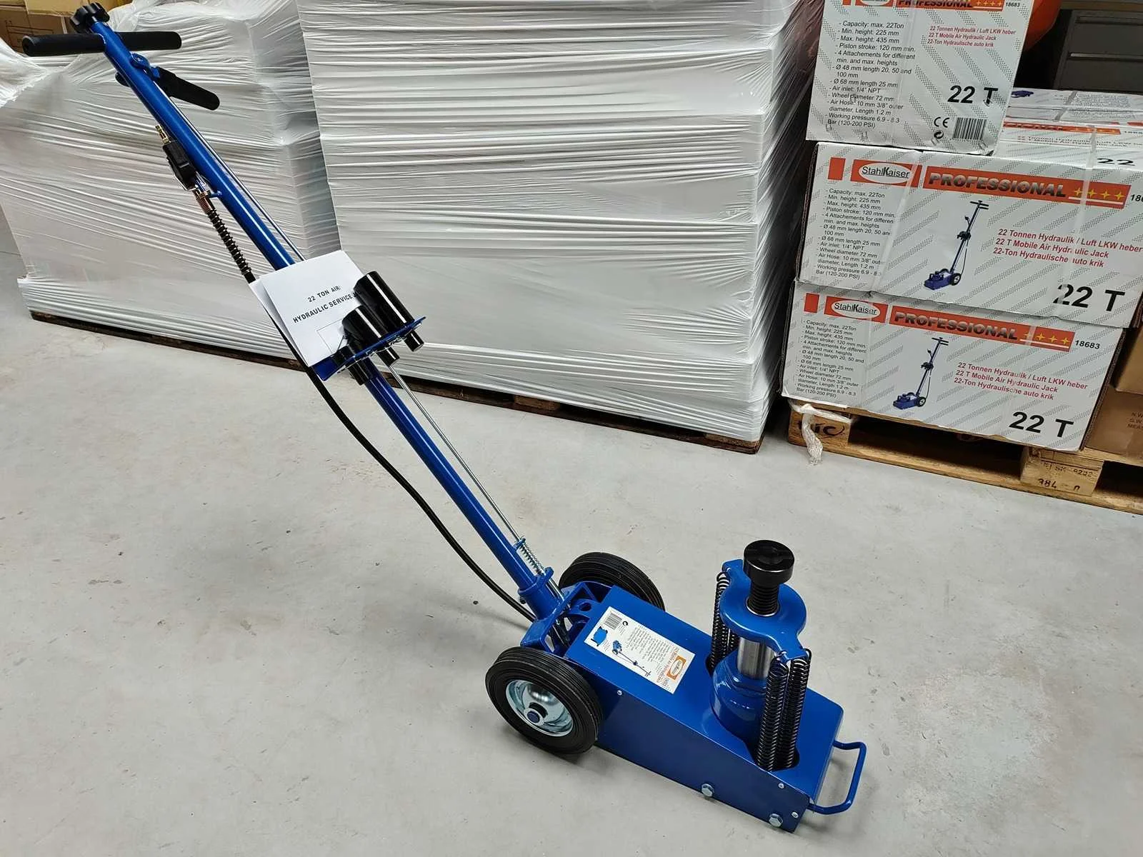 Pneumatisch aangedreven hydraulische krik met 30 ton hefvermogen, incl adapters. in doos Merk: Stahlkaiser Type: hydraulisch Bouwjaar: 2025 Capaciteit.: 30t
