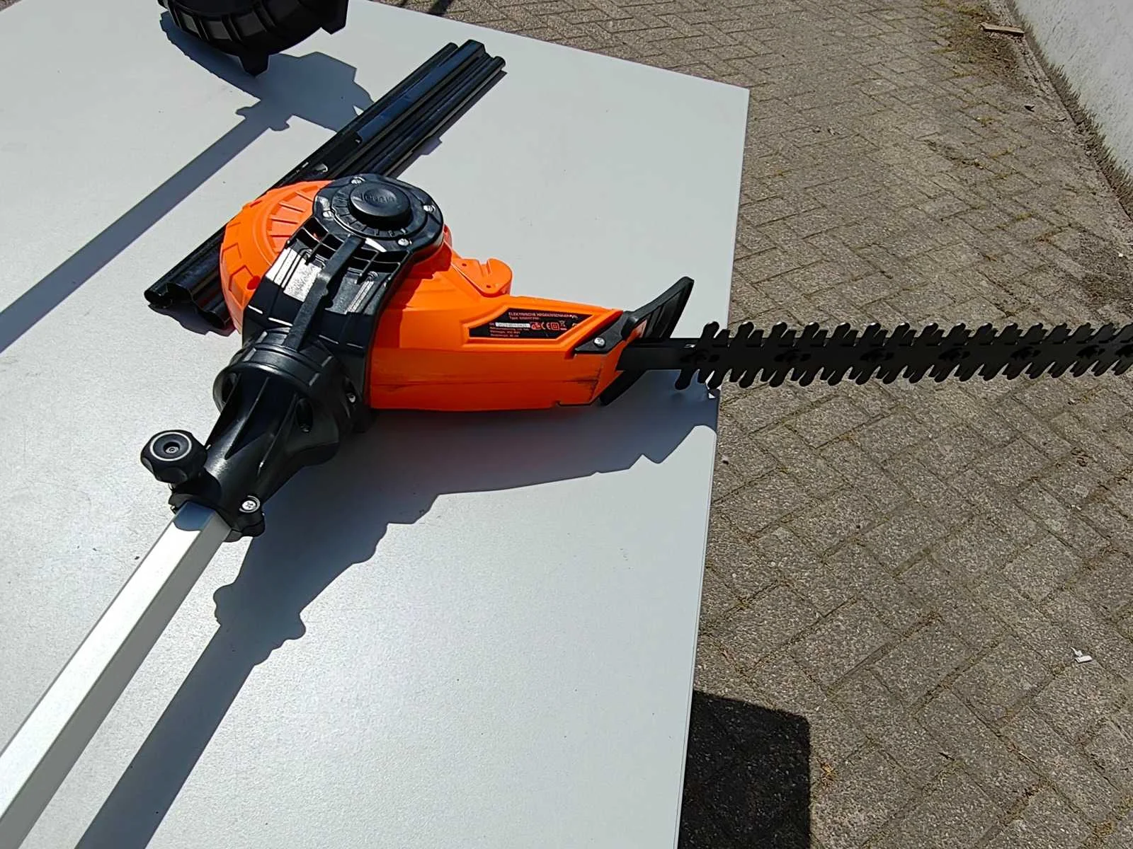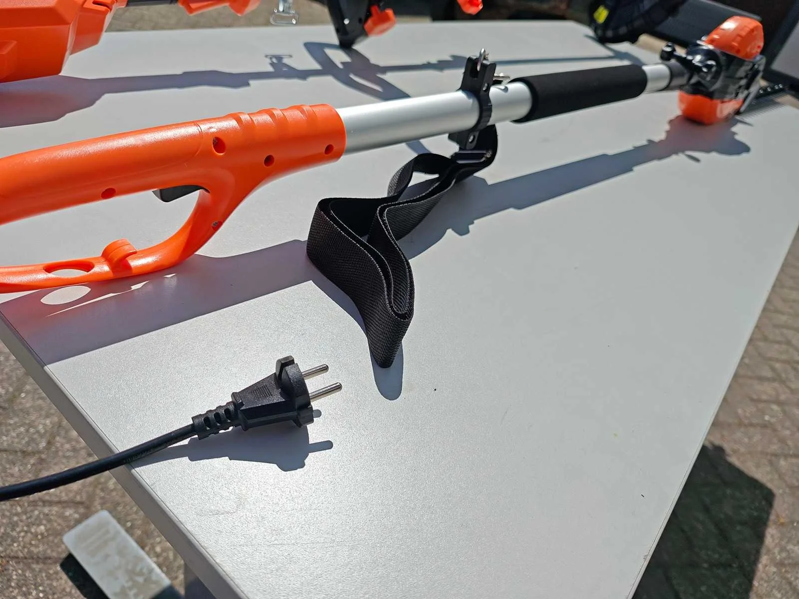Kibani Accu Heggenschaar XXL – 45 cm Zwaardlengte - 230V - Telescopisch, verstelbare hoogte van 190 tot 250 cm, werkhoek van -60° tot +80°. ongebruikt. Bosmaaier/ grastrimmer op accu. incl accu 20 volt en lader Merk: Kibani Bouwjaar: 2025