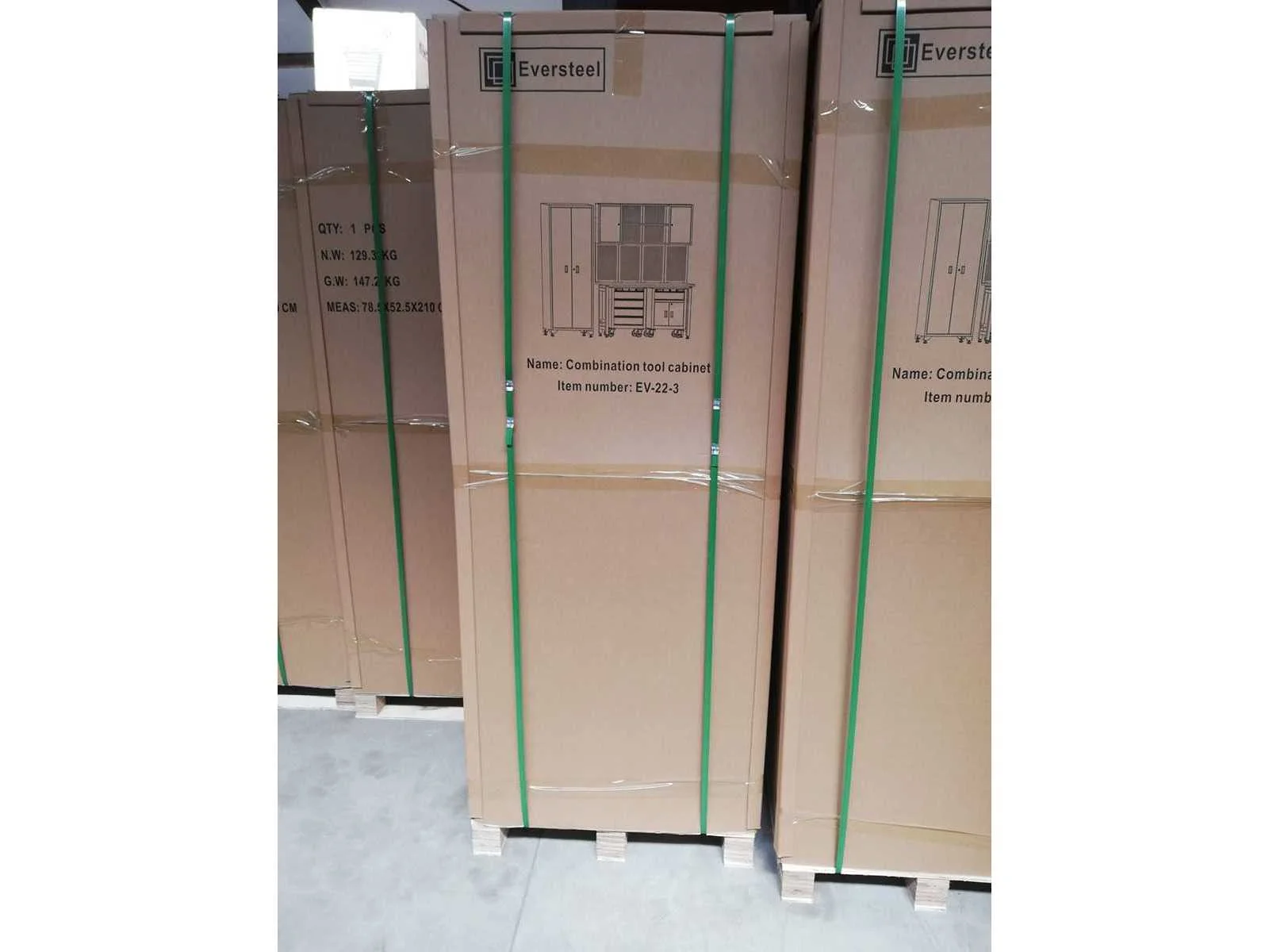 Complete set bestaande uit gereedschapskast afsluitbaar 2x onderkasten verrijdbaar en afsluitbaar, houten werkblad met verstelbare steunpoten, 2x bovenkasten met tussenliggende liggers, en geperforeerd achter scherm om gereedschap aan op te hangen. alles compleet nieuw in doos en makkelijk te monteren. nieuw in doos Merk: Eversteel Type: EV-22-3 Bouwjaar: 2025