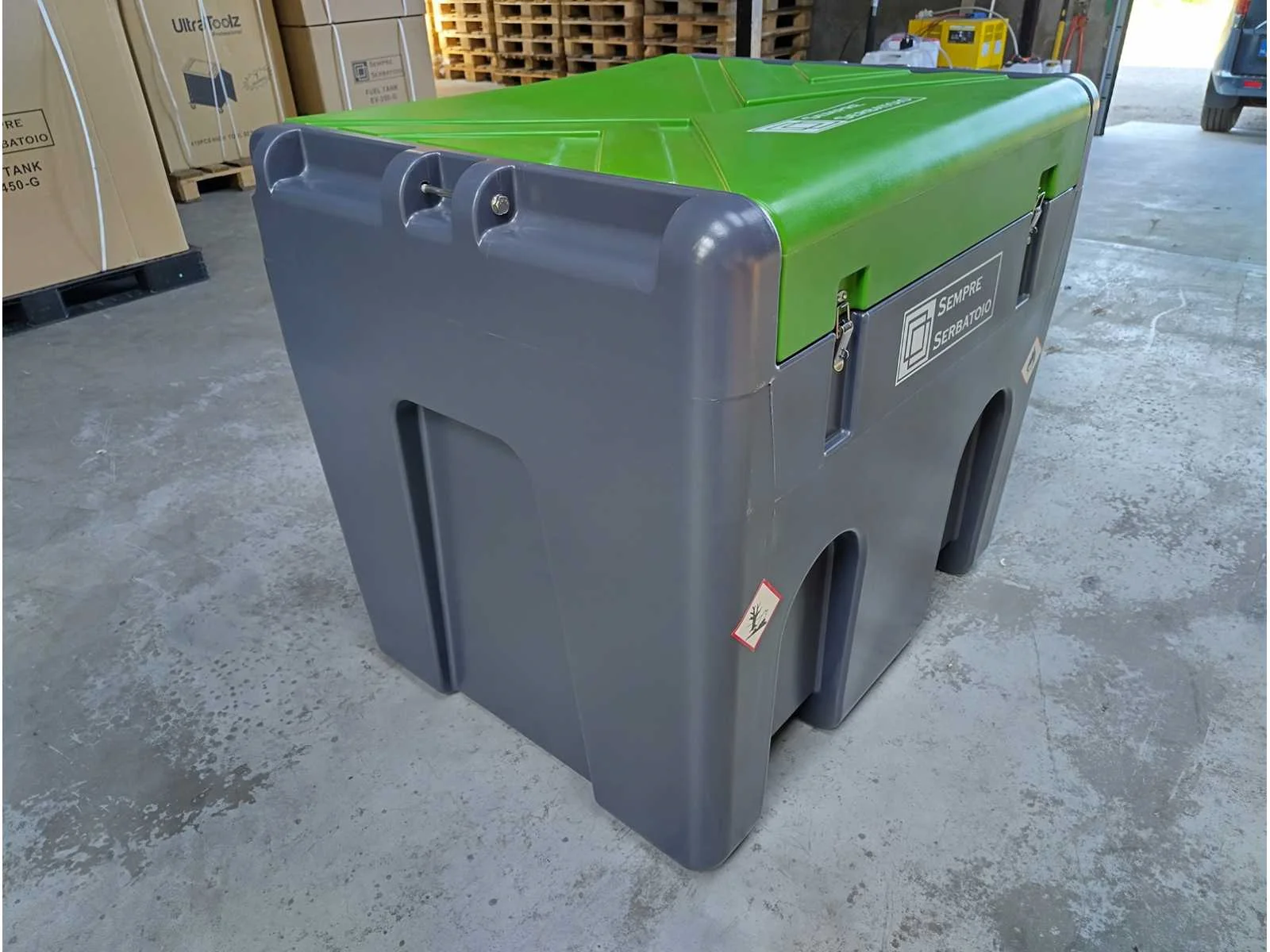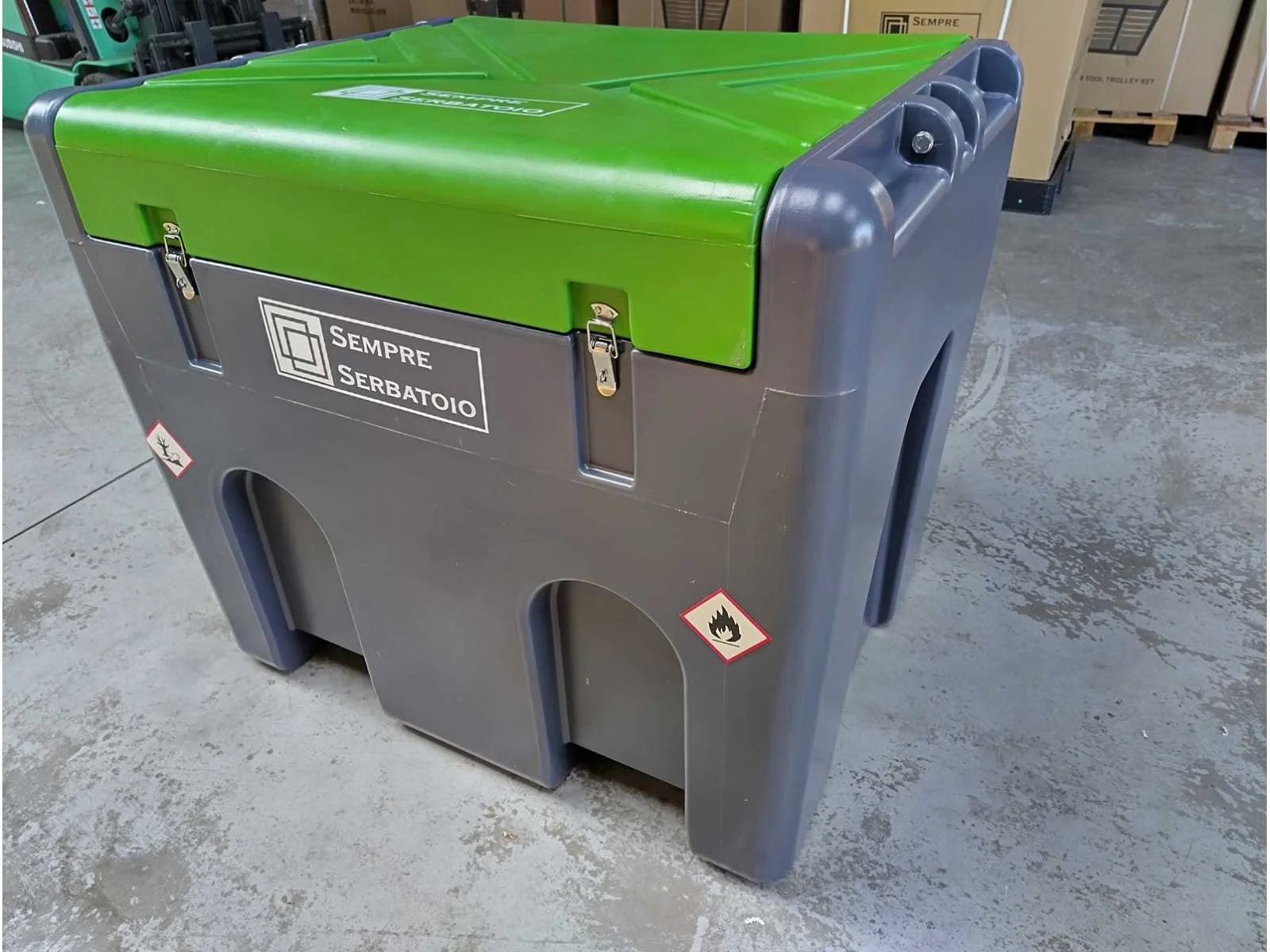 Diesel IBC opslagtank mobiel, met slang en automatisch vulpistool, tankmeter, afsluitbare dop, klep cilinder, en sjorband vastzetbeugels. in doos, 400 liter Merk: Sempre Serbatoio Bouwjaar: 2025 Serienummer: EV-450-G Bouwjaar: 2025 Eigen gewicht: 51kg