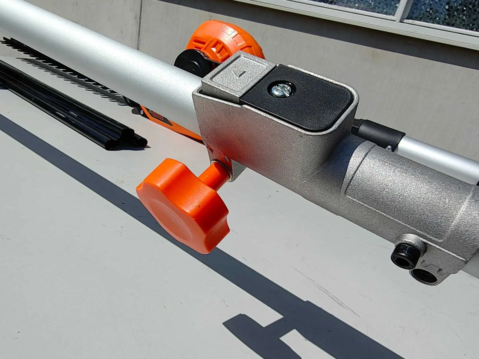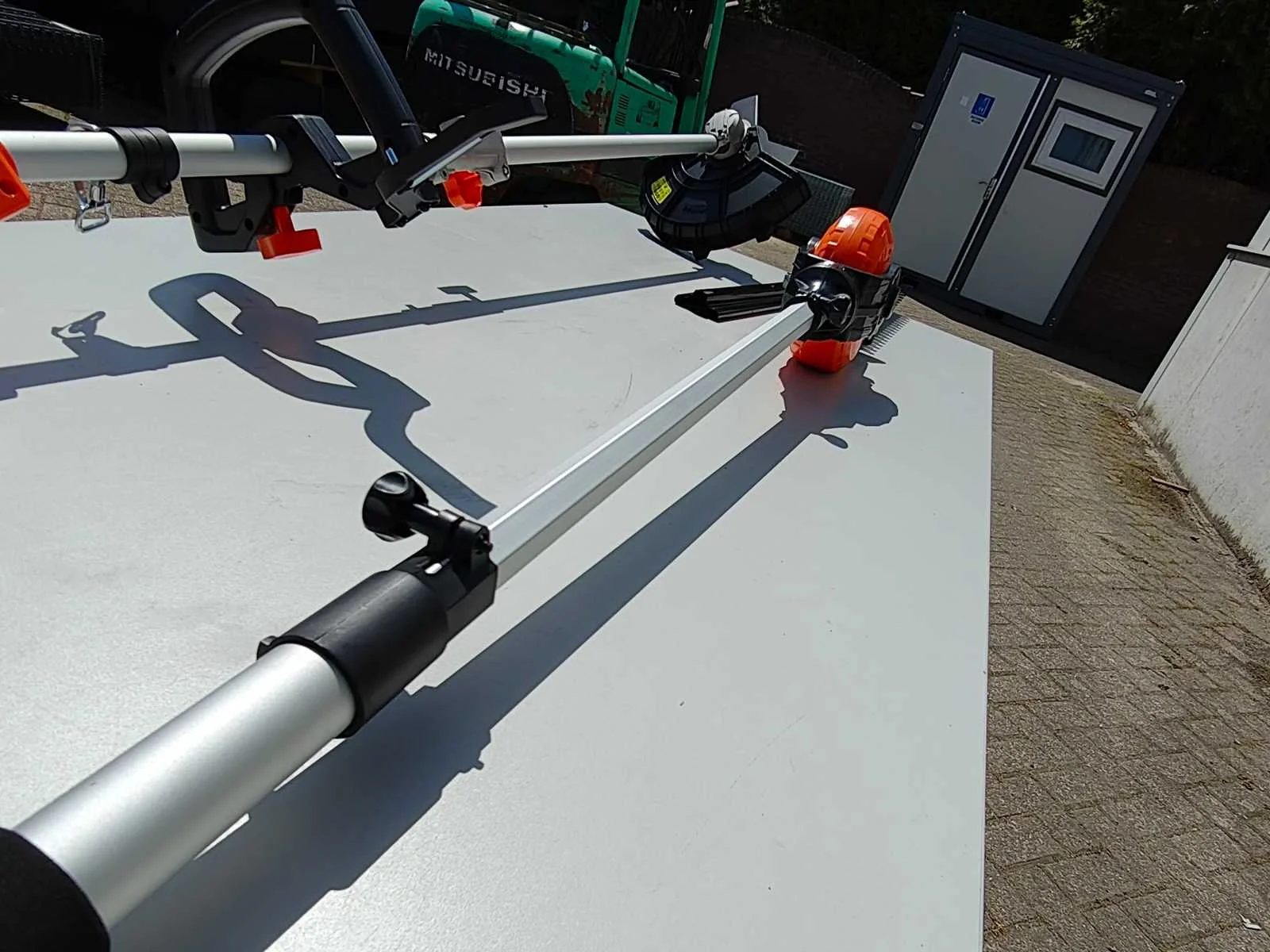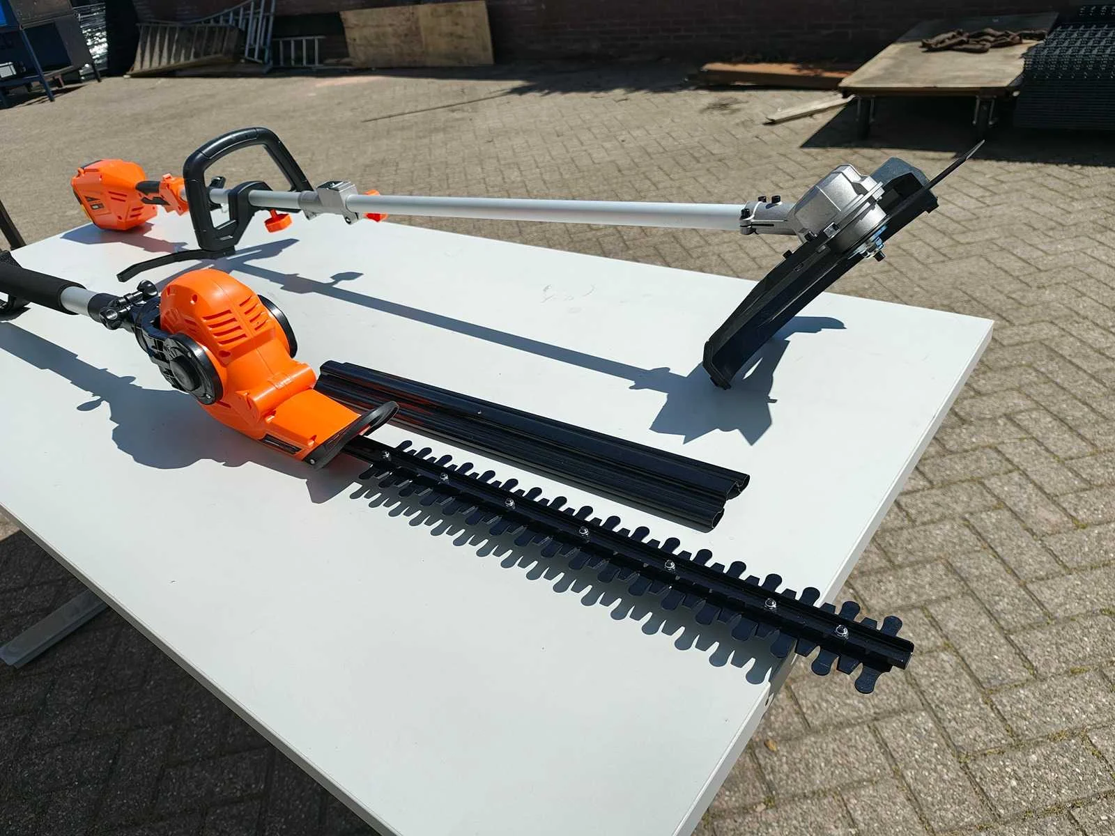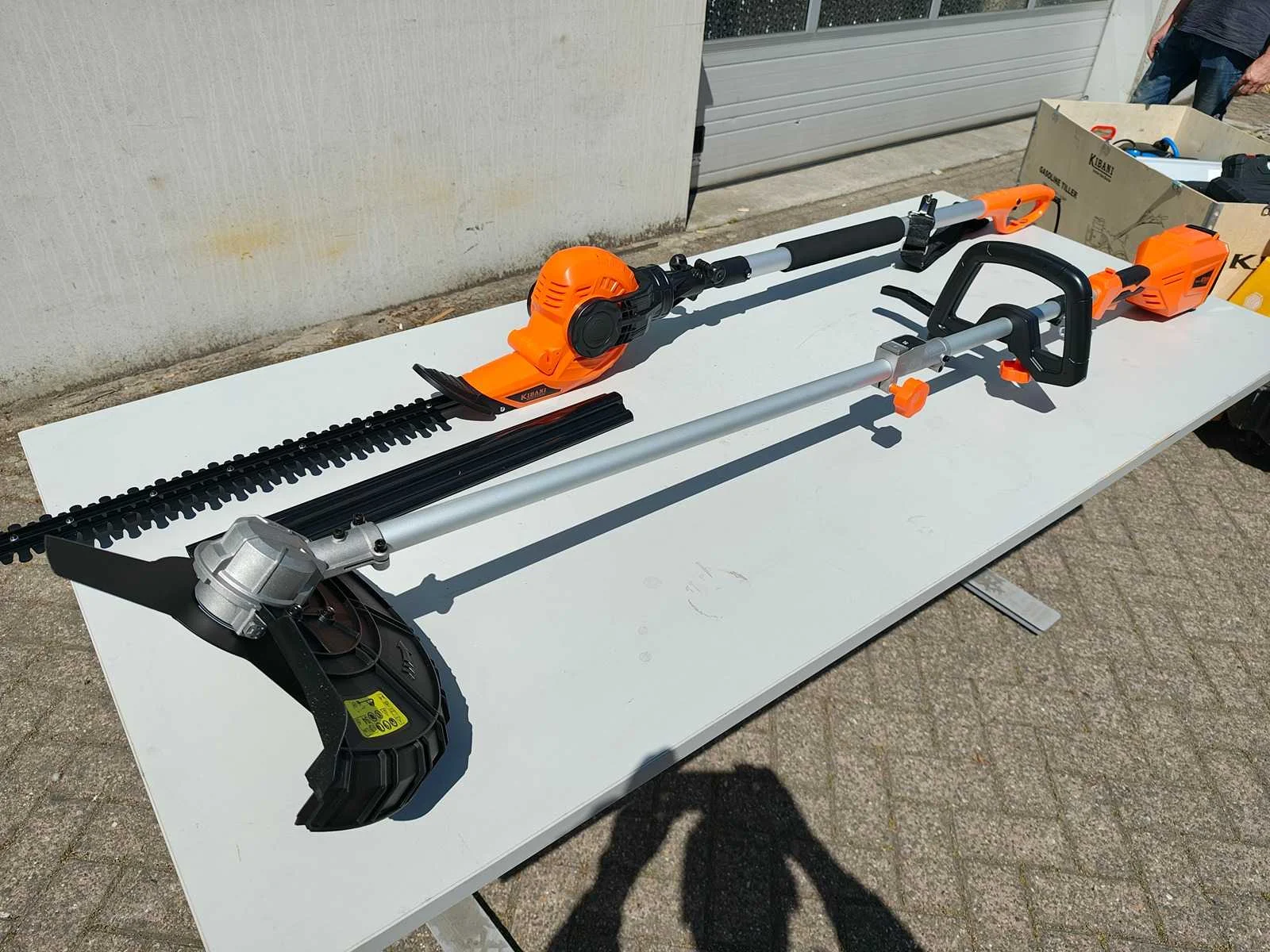 Kibani Accu Heggenschaar XXL – 45 cm Zwaardlengte - 230V - Telescopisch, verstelbare hoogte van 190 tot 250 cm, werkhoek van -60° tot +80°. ongebruikt. Bosmaaier/ grastrimmer op accu. incl accu 20 volt en lader Merk: Kibani Bouwjaar: 2025