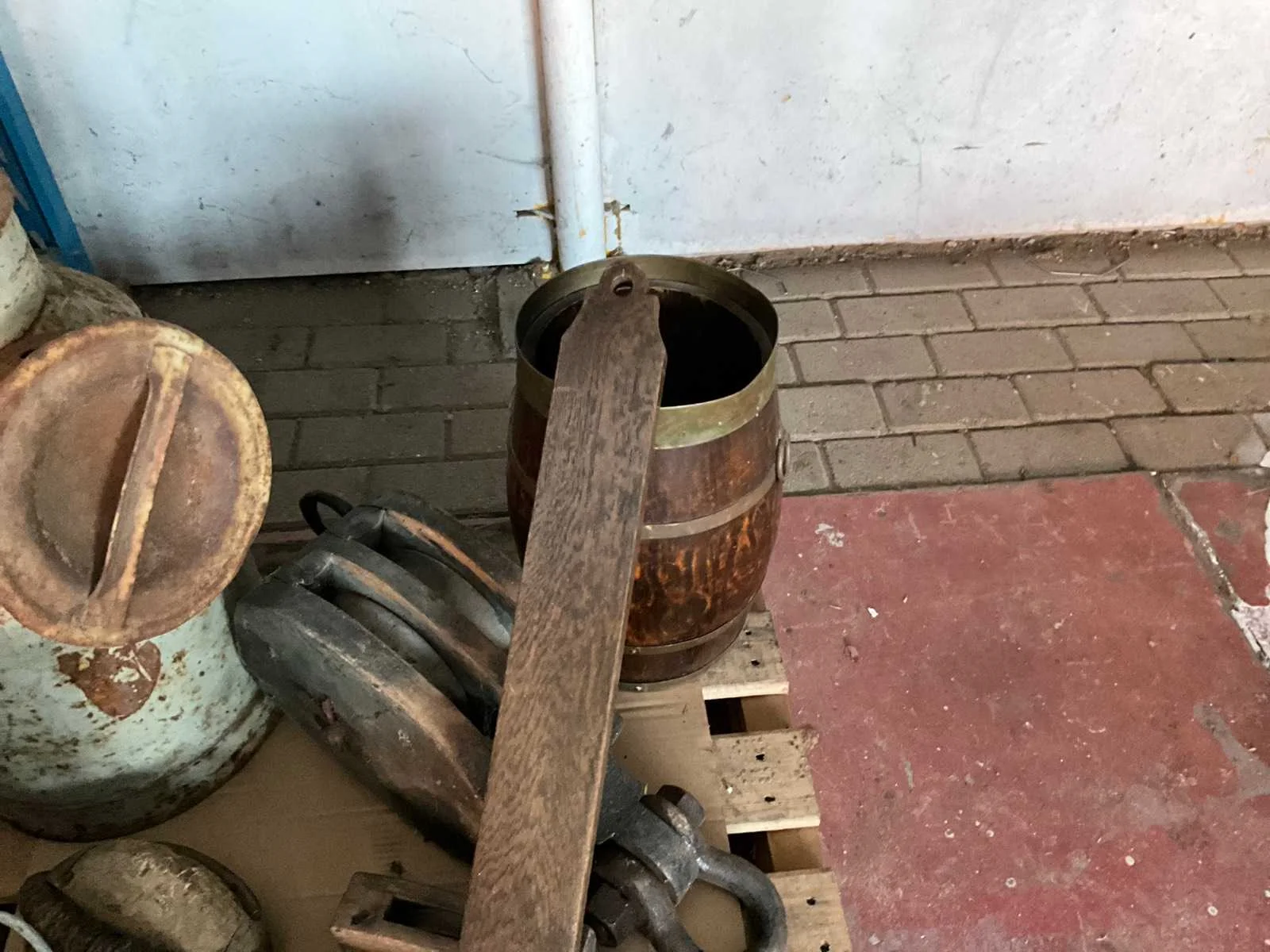 Bestaande uit 1 sjoelbak, schilderijlijst, melkbus, katrollen, prullenbak en schenkkan