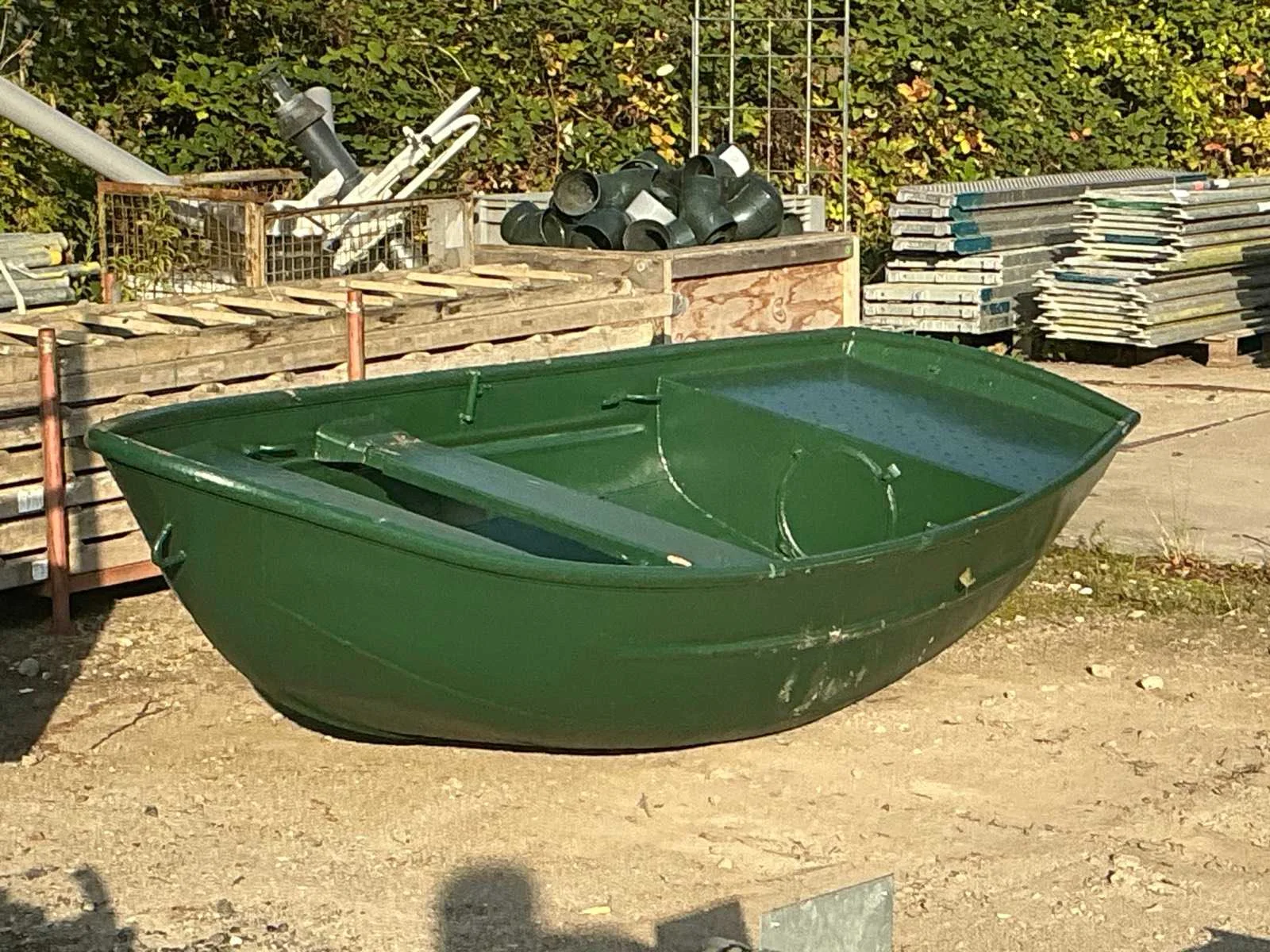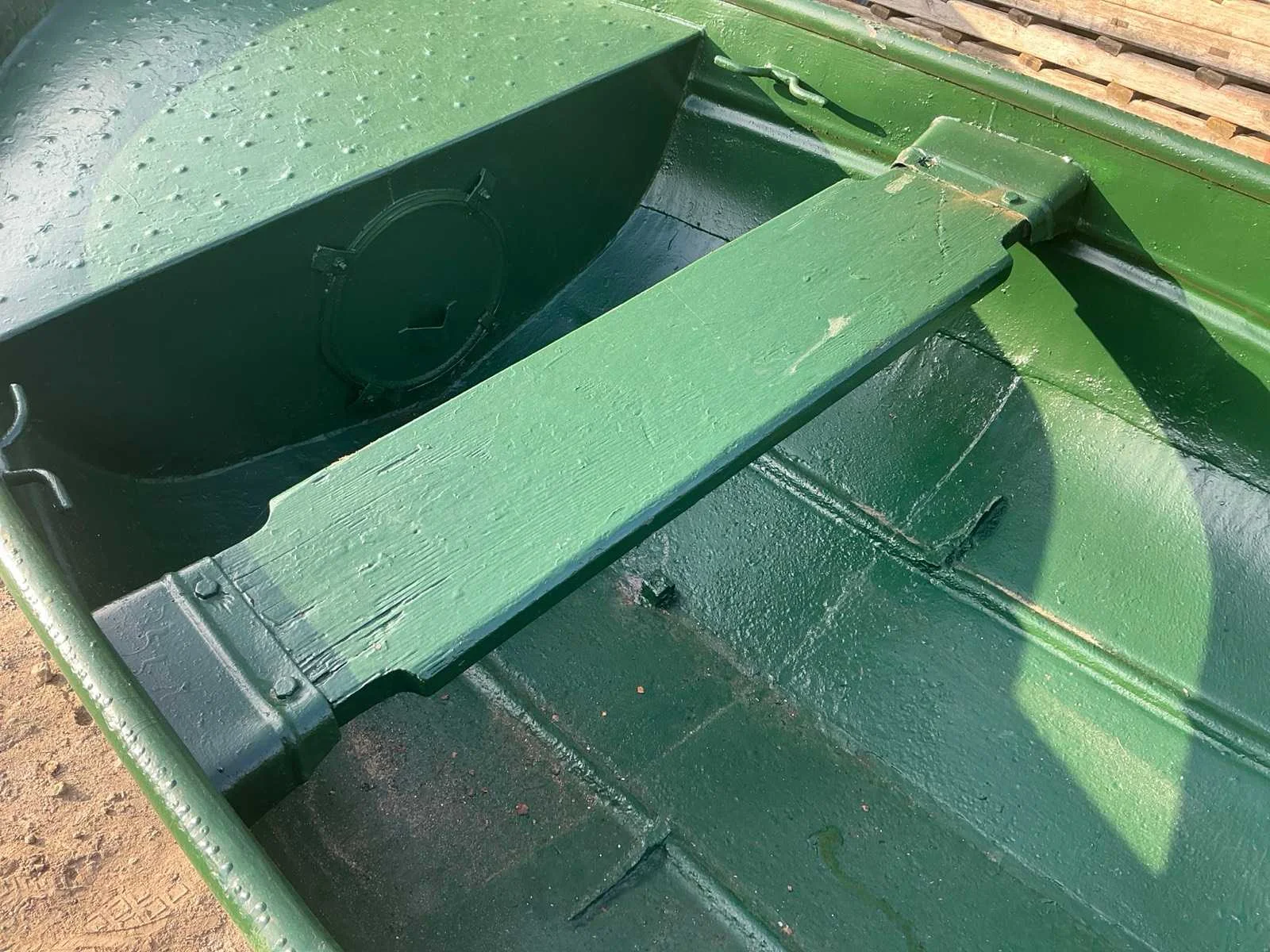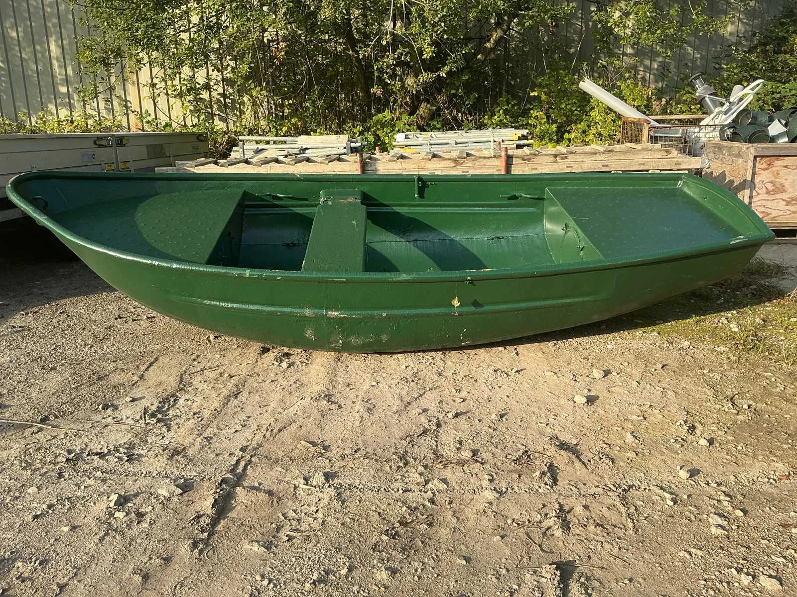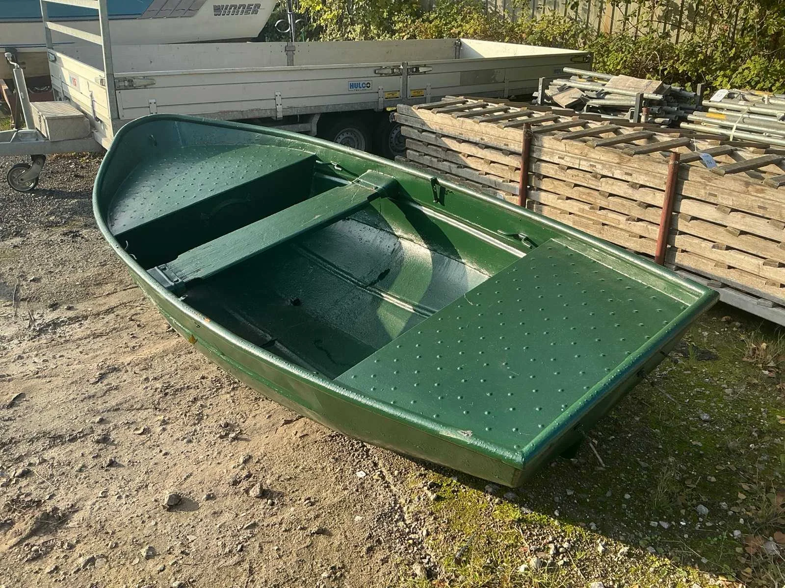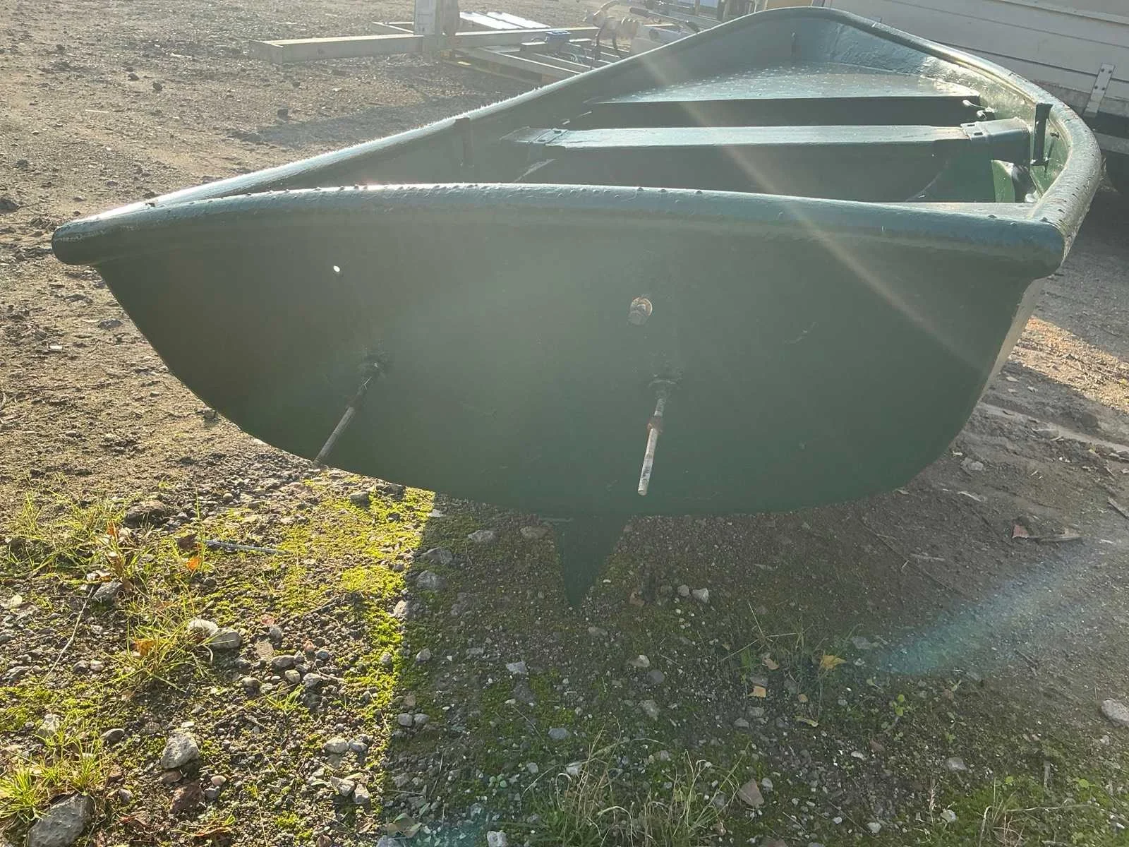 Voorbereiding tot aanhang van buitenboord motor Rompmateriaal: Staal Kleur: Groen Lengte: 3.5m Breedte: 1.45m Hoogte: 60cm