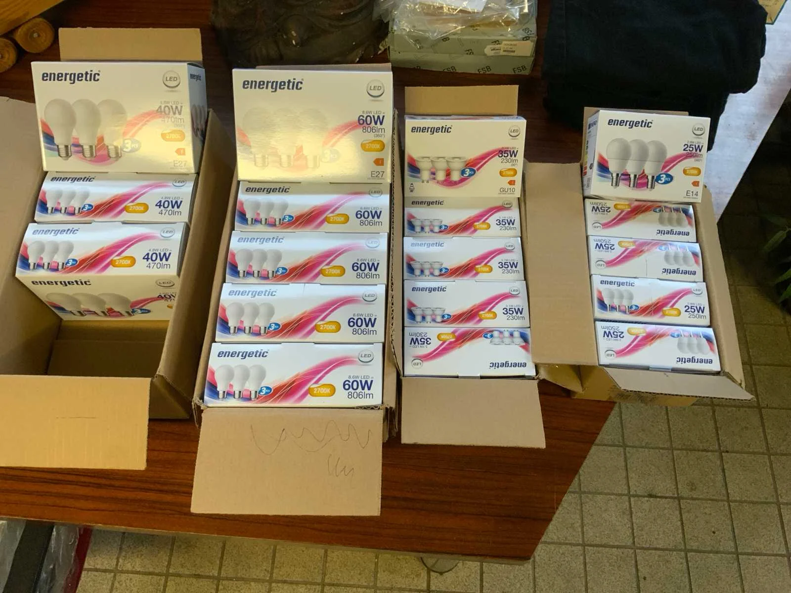 Waaronder per assortiment doos 5 doosjes à 3 stuks 40 watt, 5 doosjes à 3 stuks 60 watt, 5 doosjes à 3 stuks 35 watt, 5 doosjes à 3 stuks 25 watt. Totaal 2880 stuks, op 1 pallet Merk: ENERGETIC Lengte: 120cm Breedte: 80cm Hoogte: 220cm
