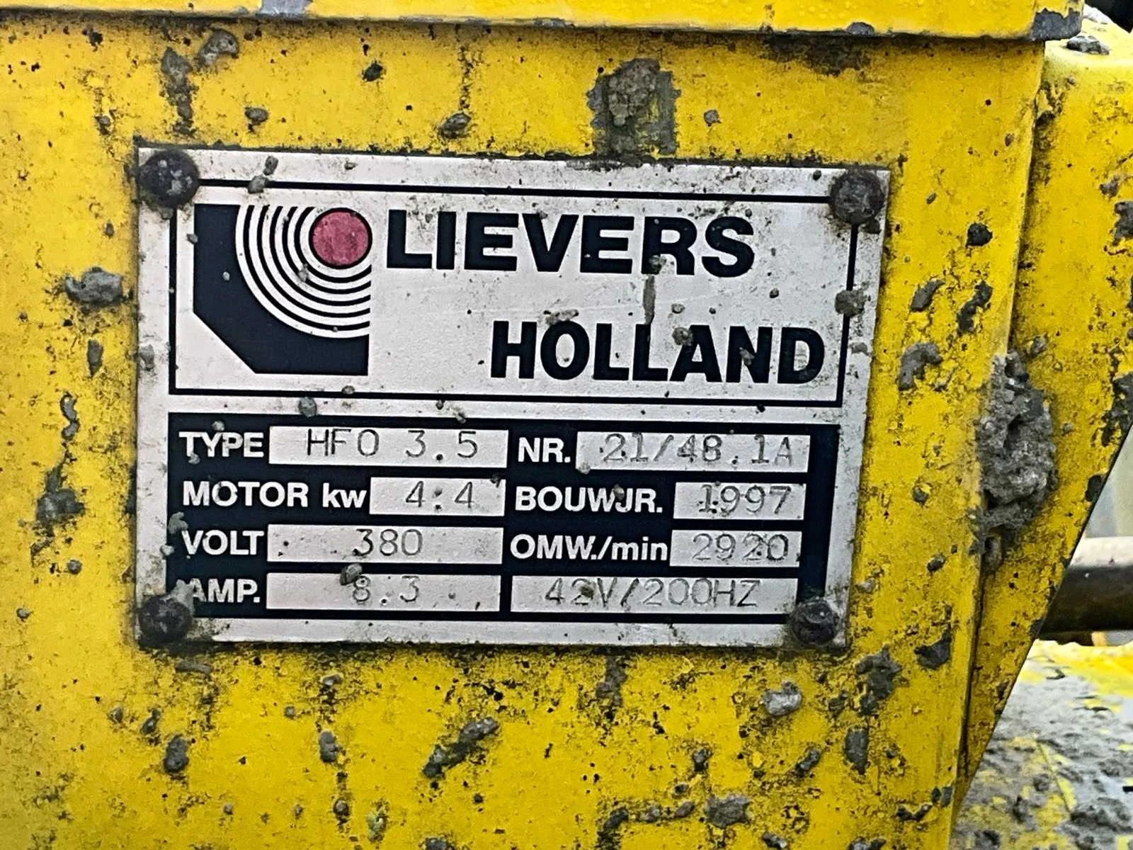 Merk: Lievers Type: HFO 3.5 4.4 KW Bouwjaar: 1997 Serienummer: 21/48.1A Totale afmeting L: 1300mm Totale afmeting Breedte: 800mm Totale afmeting Hoogte: 700mm