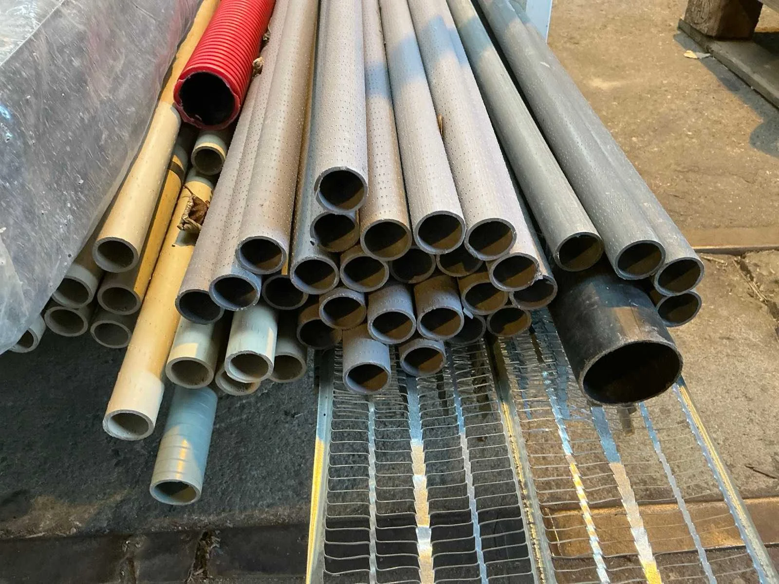 Bestaande 6 pallets met divers aannemersmateriaal waaronder Buis Ø25mm en Ø50mm, nagels, doppen en lekbakken Totale afmeting L: 2200mm