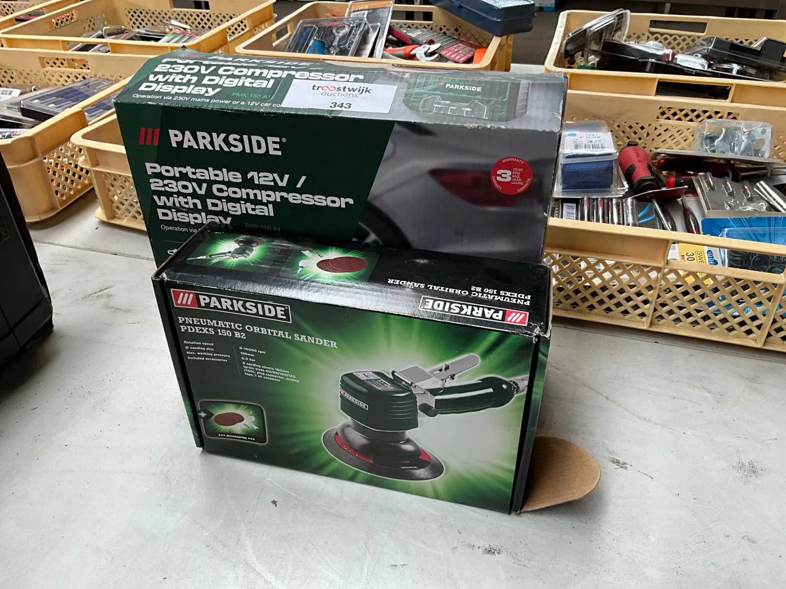 1x PDEXS 150 B2 schuurmachine en 1x 230 Volt compressor Merk: Parkside