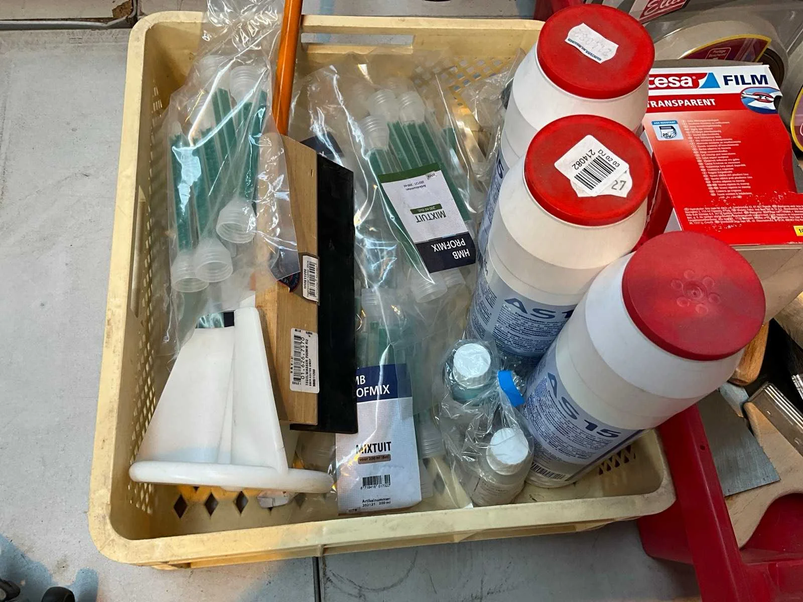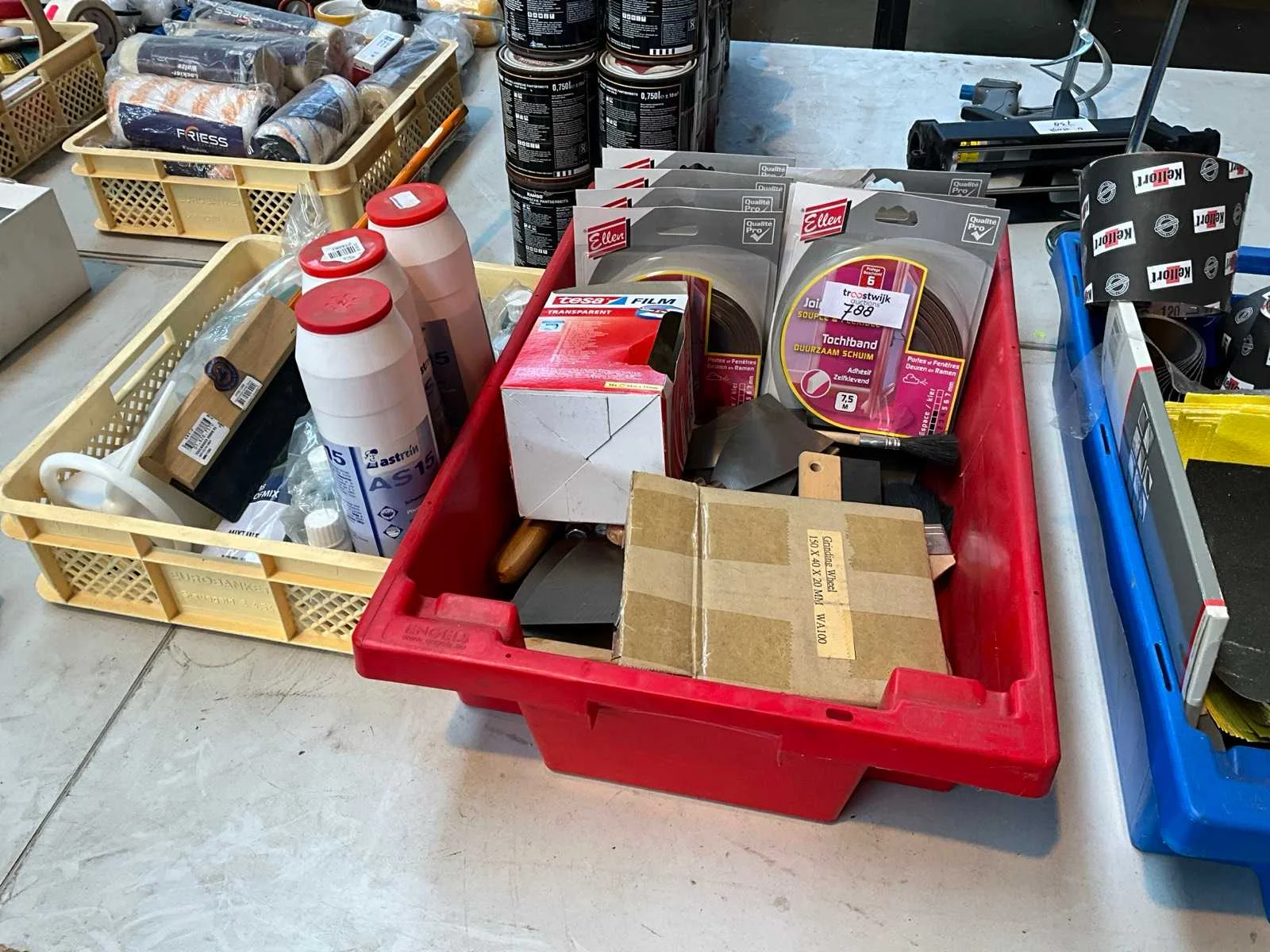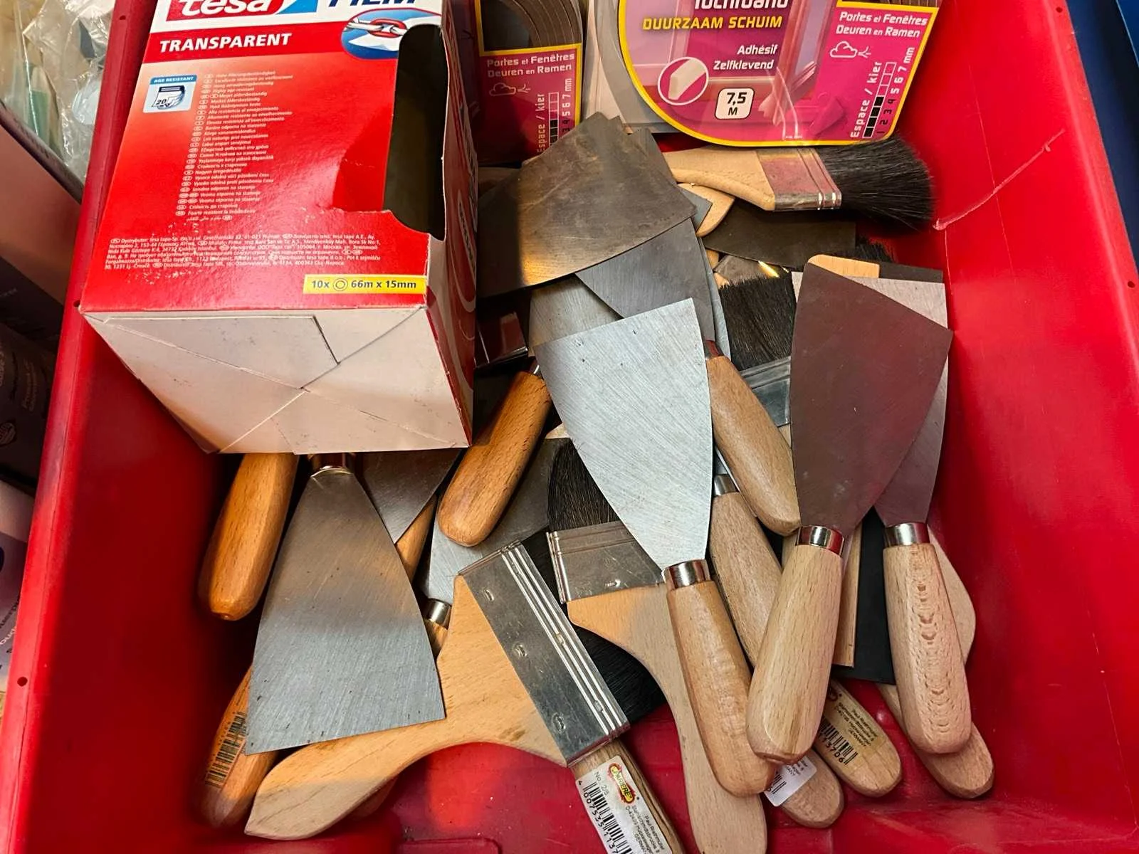 Bestaande uitbplamuurmessen, tochtstrips, tape, mixtuiten en schuurpoeder