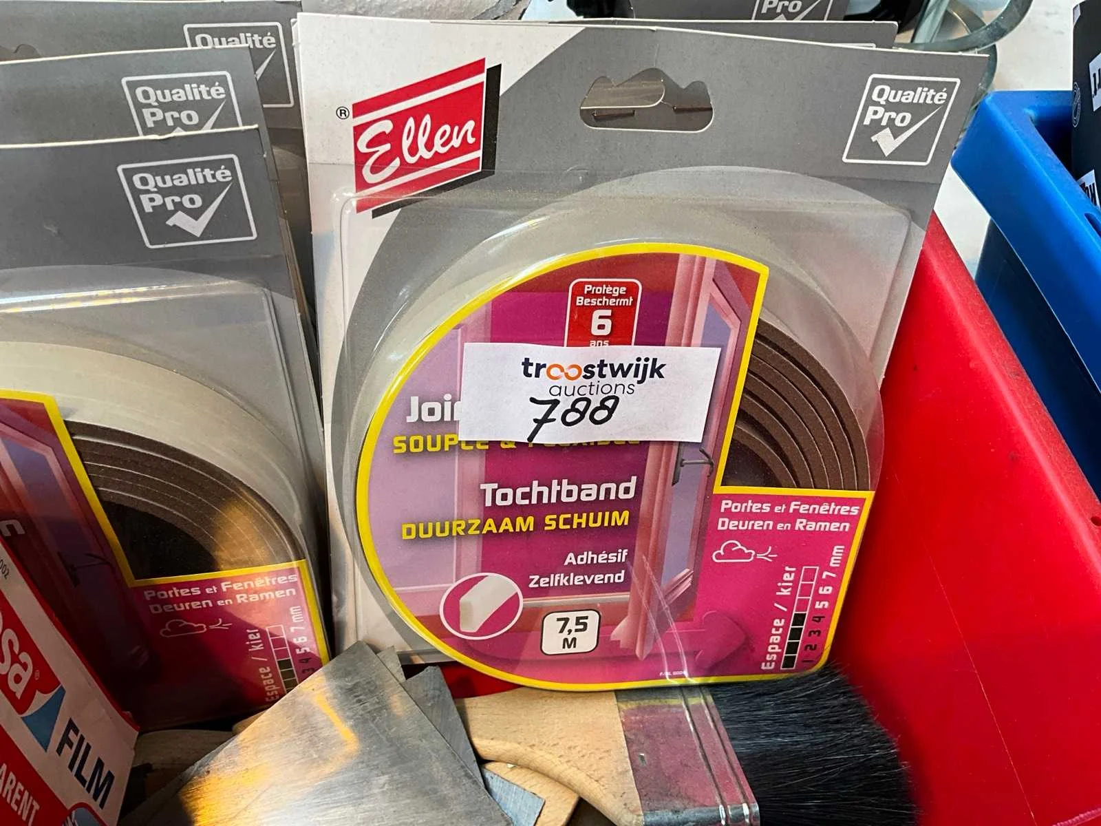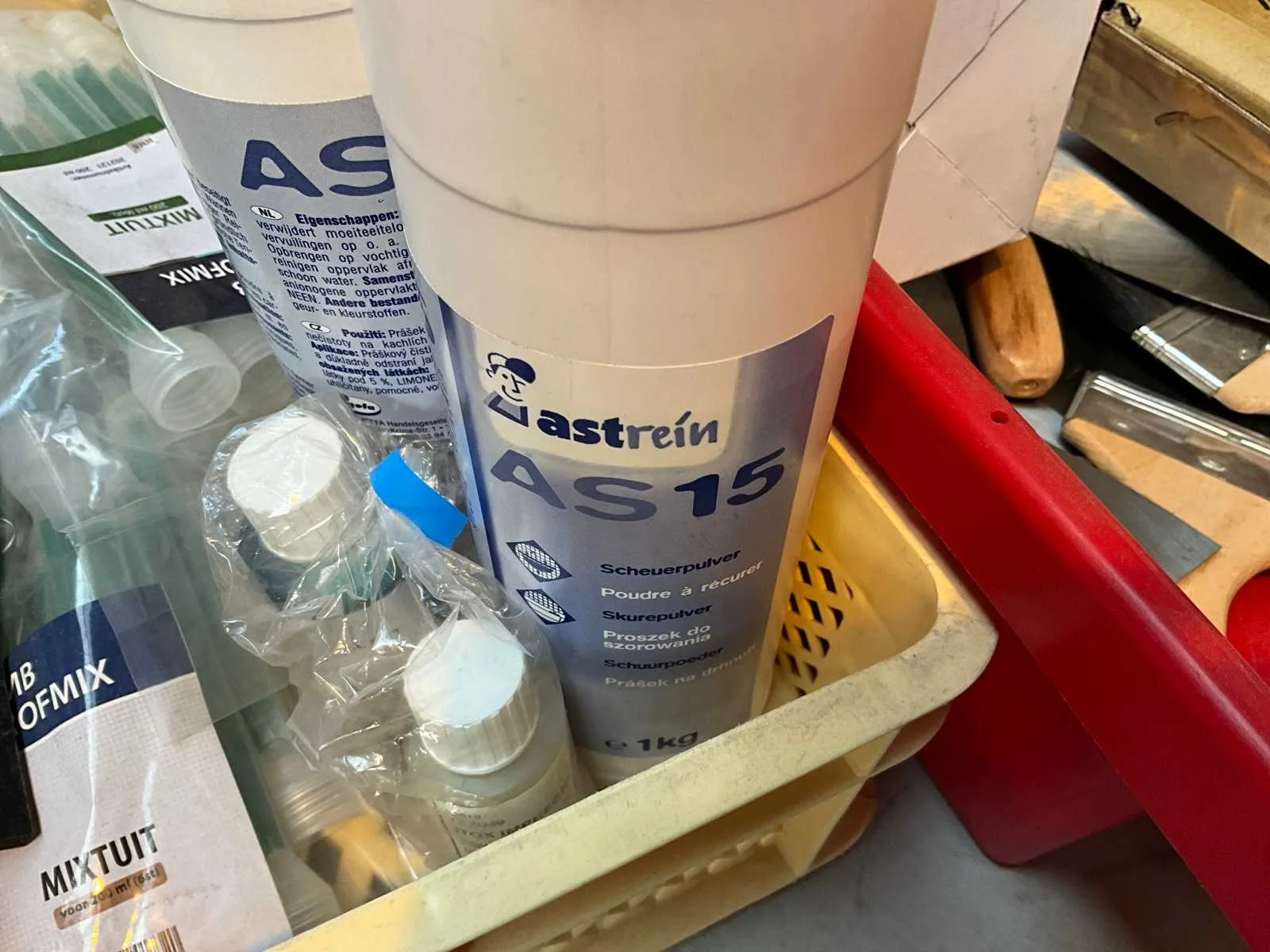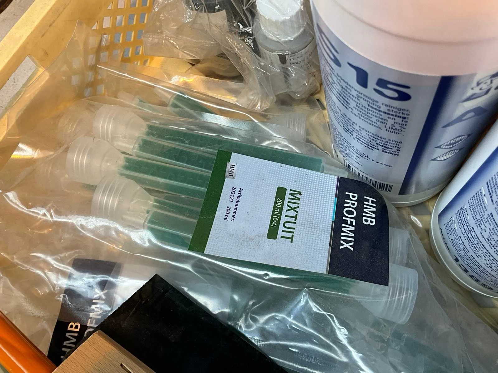 Bestaande uitbplamuurmessen, tochtstrips, tape, mixtuiten en schuurpoeder