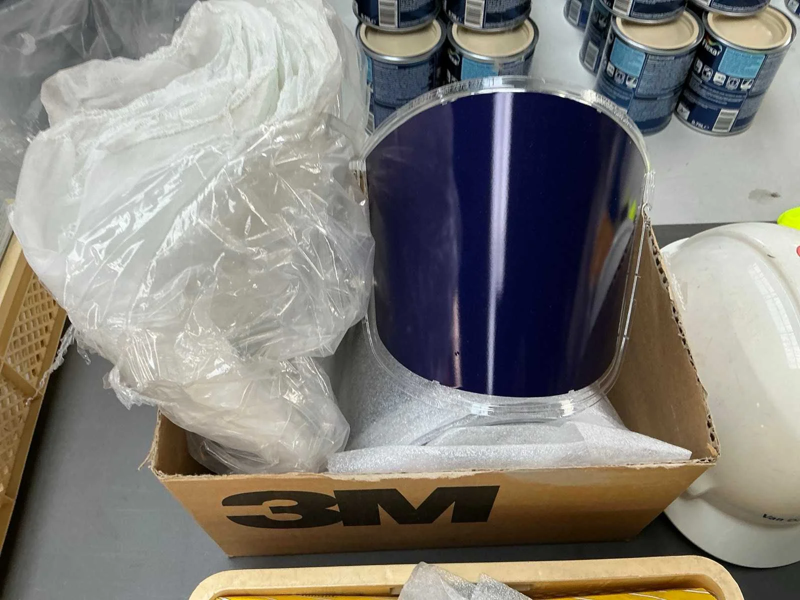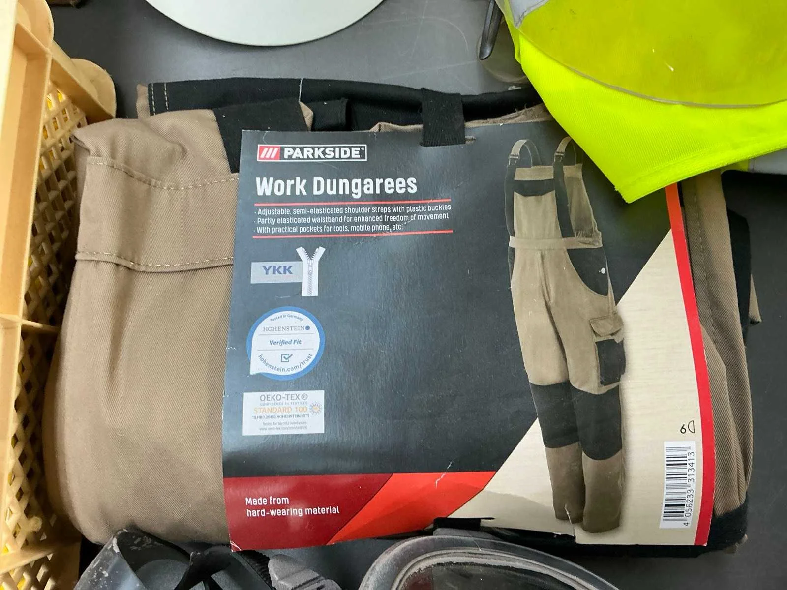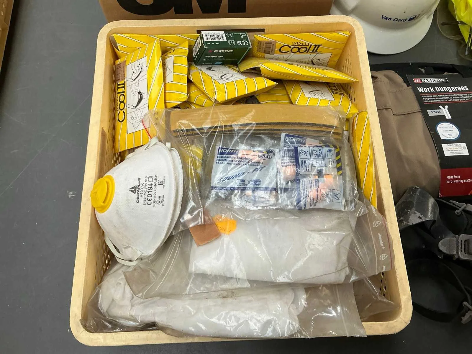 Waaronder helm, gelaatsmasker, werkbroek en gelaatmasker